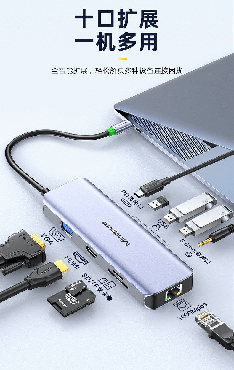타입-C 확장 도크 HDMI+VGA 기가비트 네트워크 카드 USB 변환 허브 USB 플래시 드라이브 4K PD 멀티 인터페이스 다기능