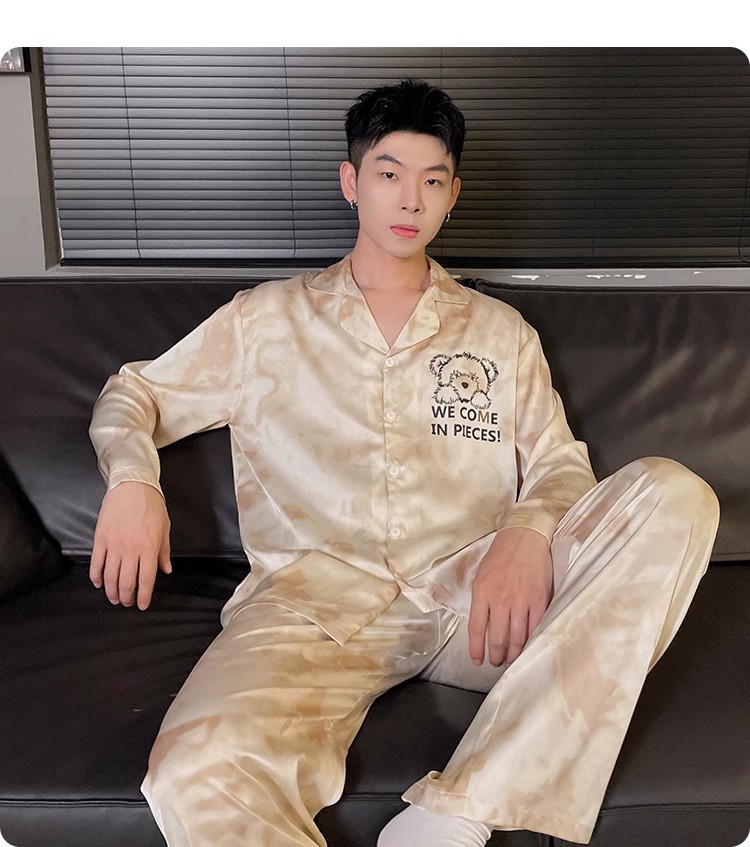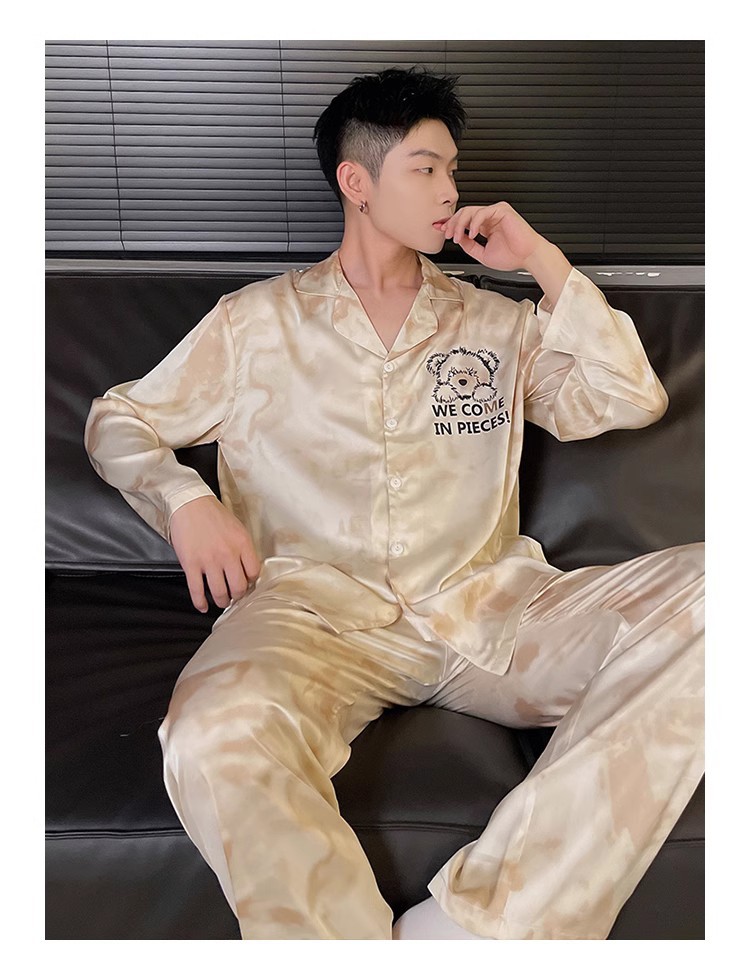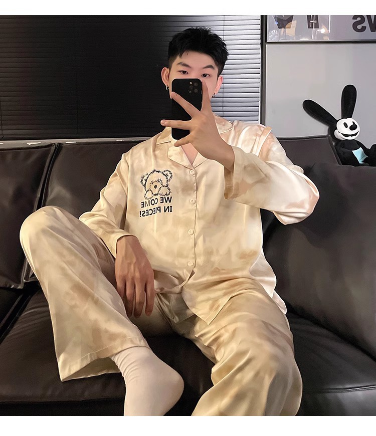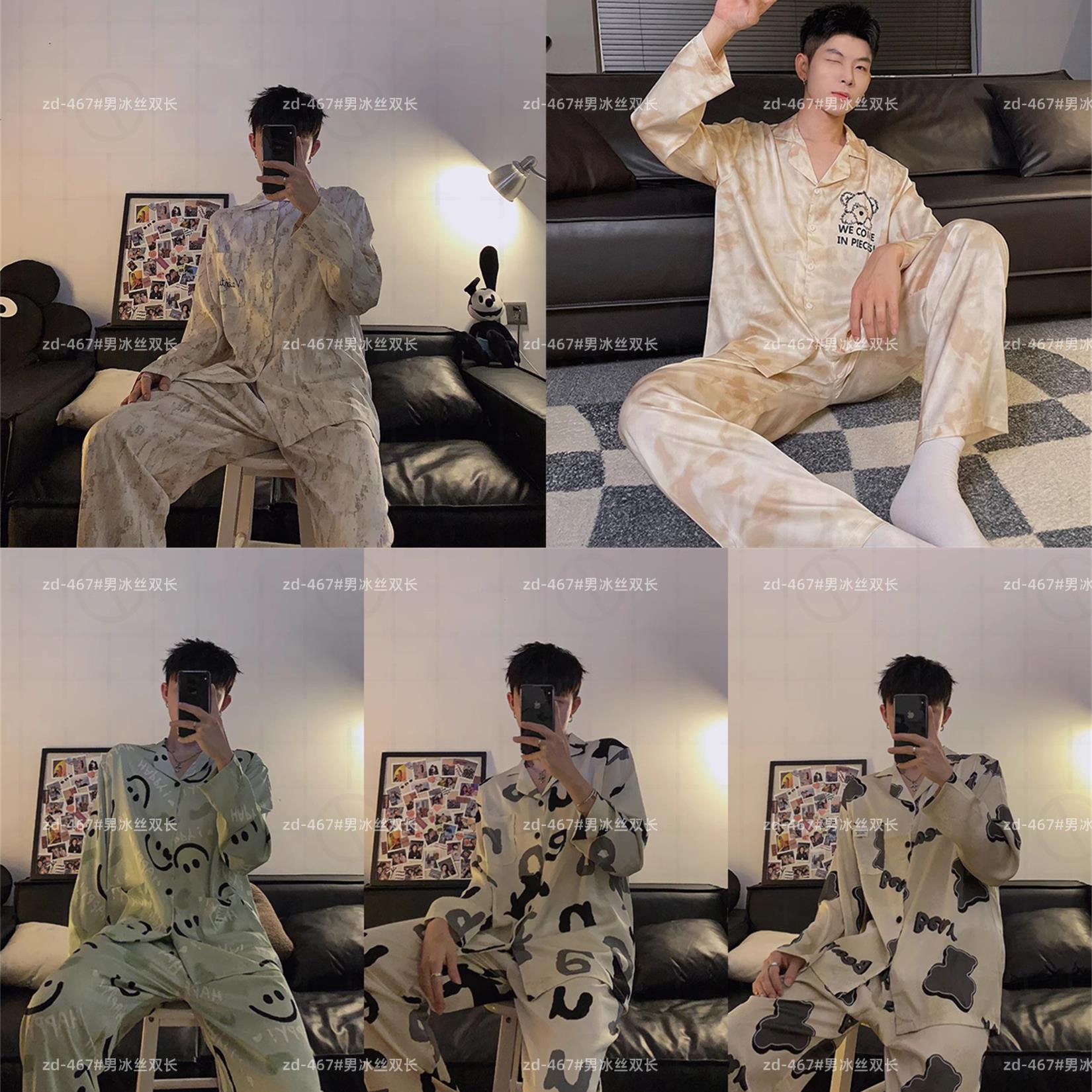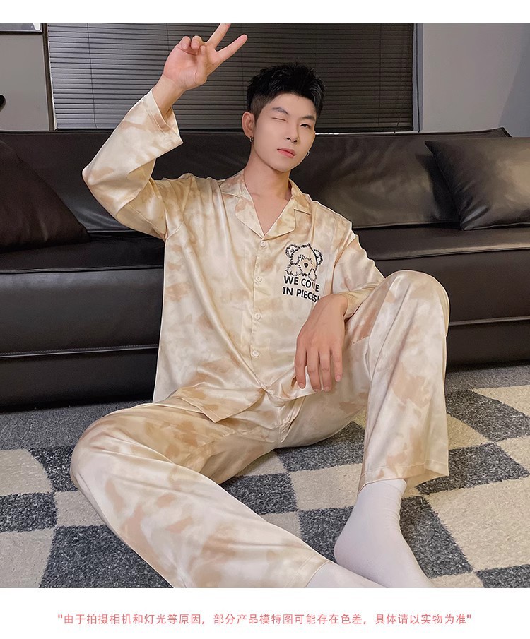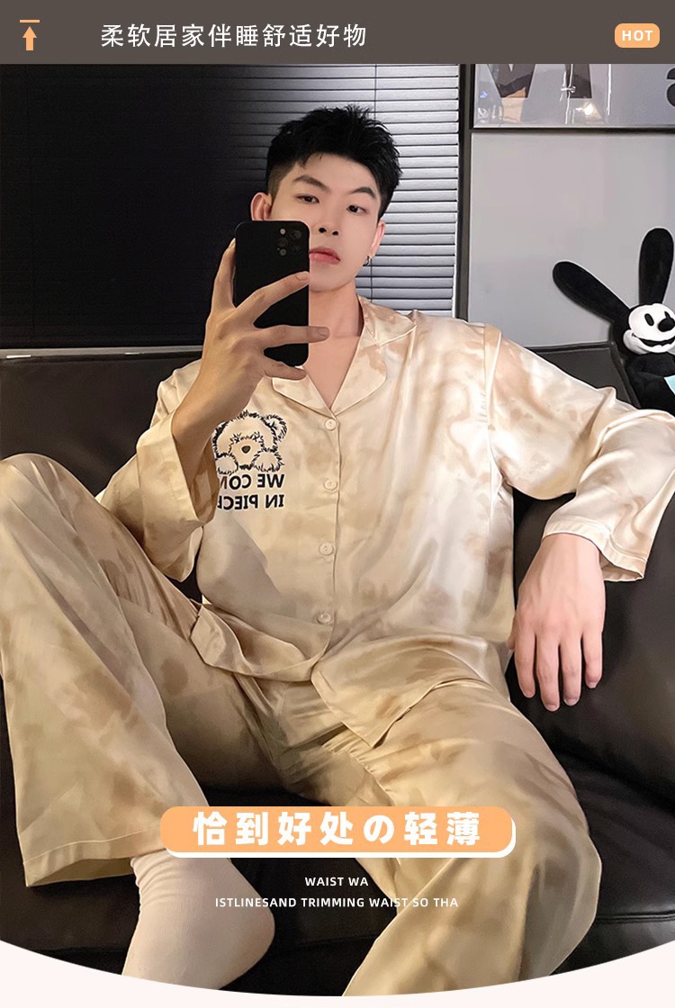 봄과 가을 남자의 잠옷 아이스 실크 얇은 긴 소매 2024 새로운 스타일 실크 남자의 세트 가정 의류 겉옷스토어 가기