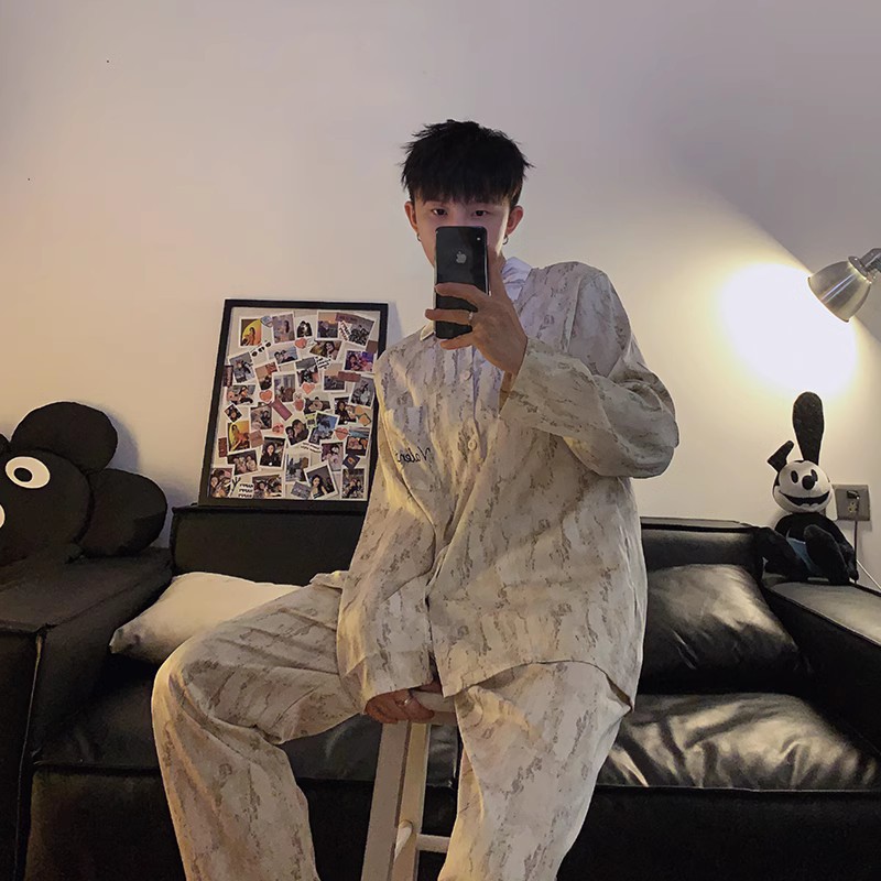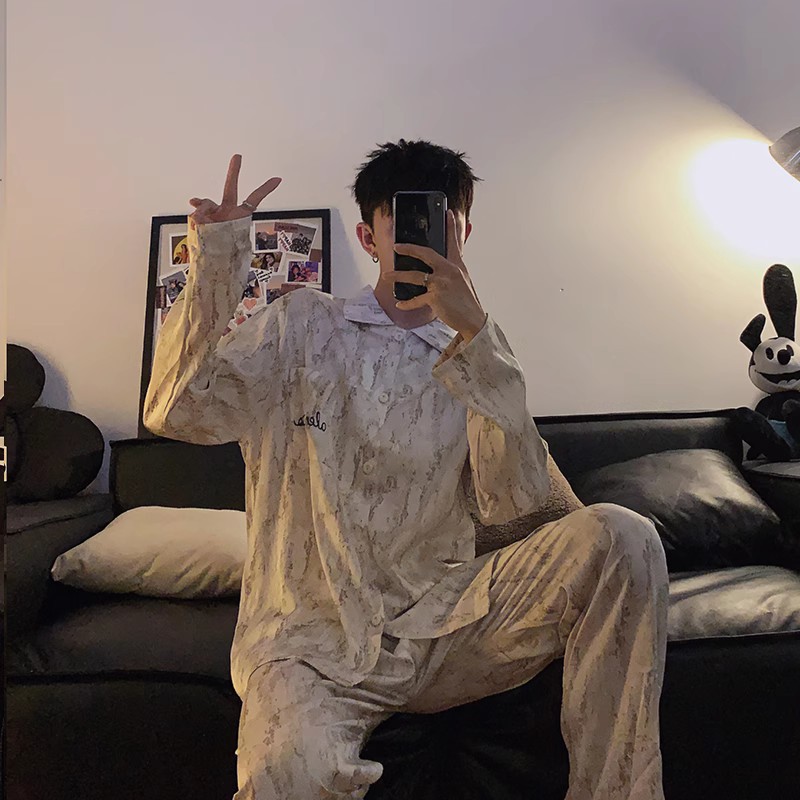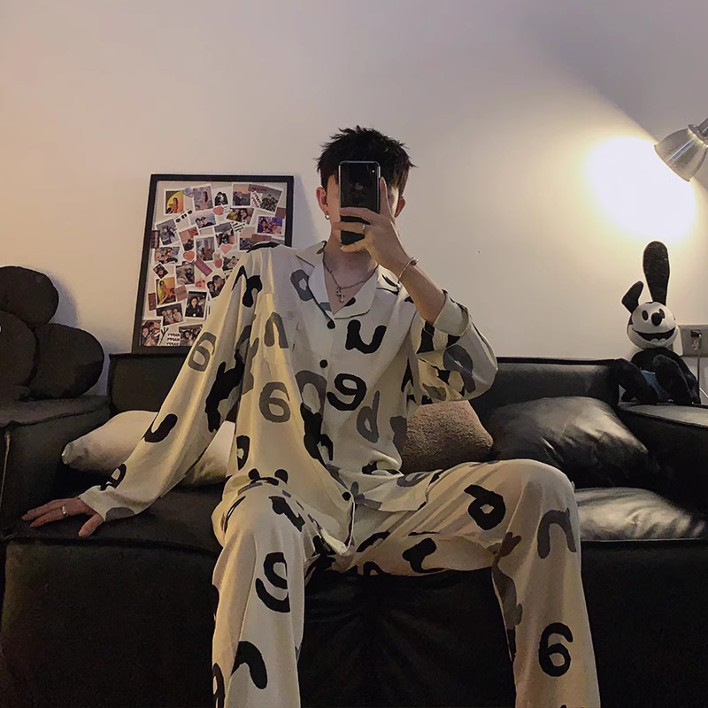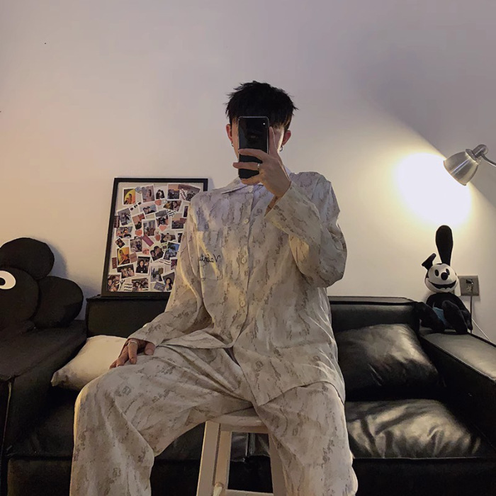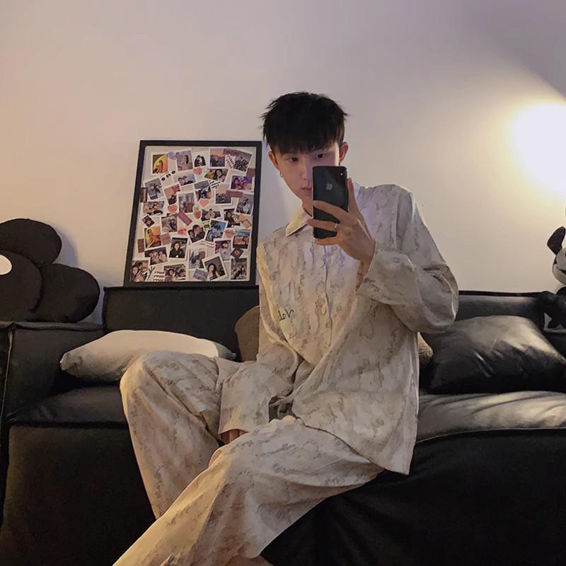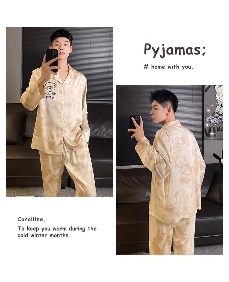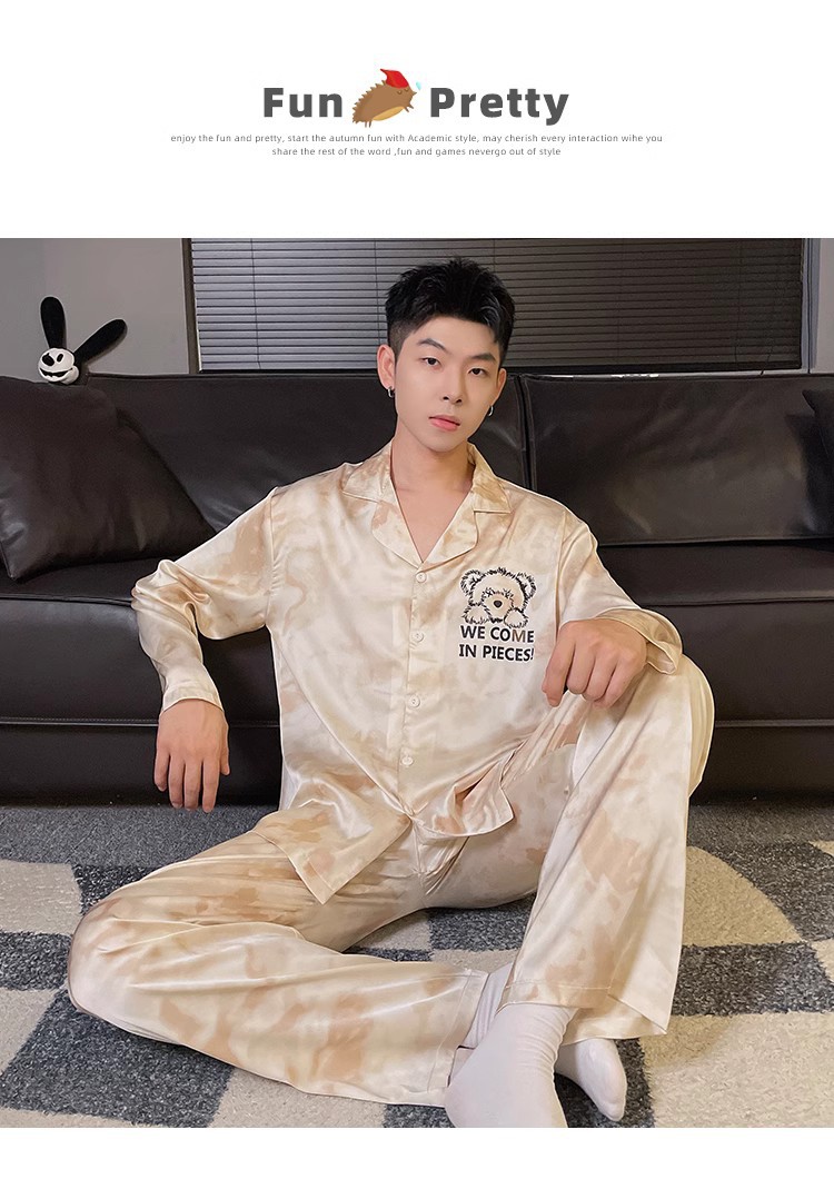 봄과 가을 남자의 잠옷 아이스 실크 얇은 긴 소매 2024 새로운 스타일 실크 남자의 세트 가정 의류 겉옷스토어 가기
