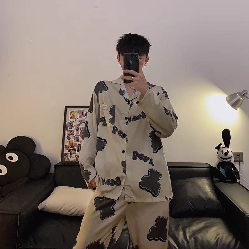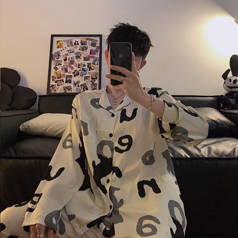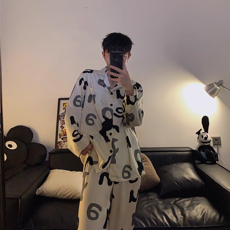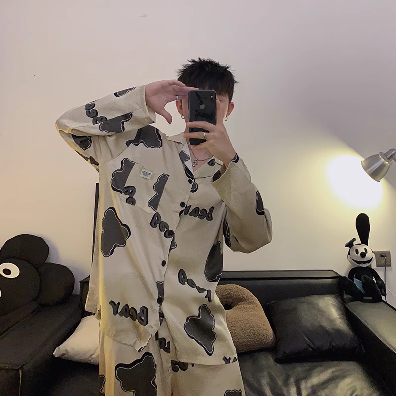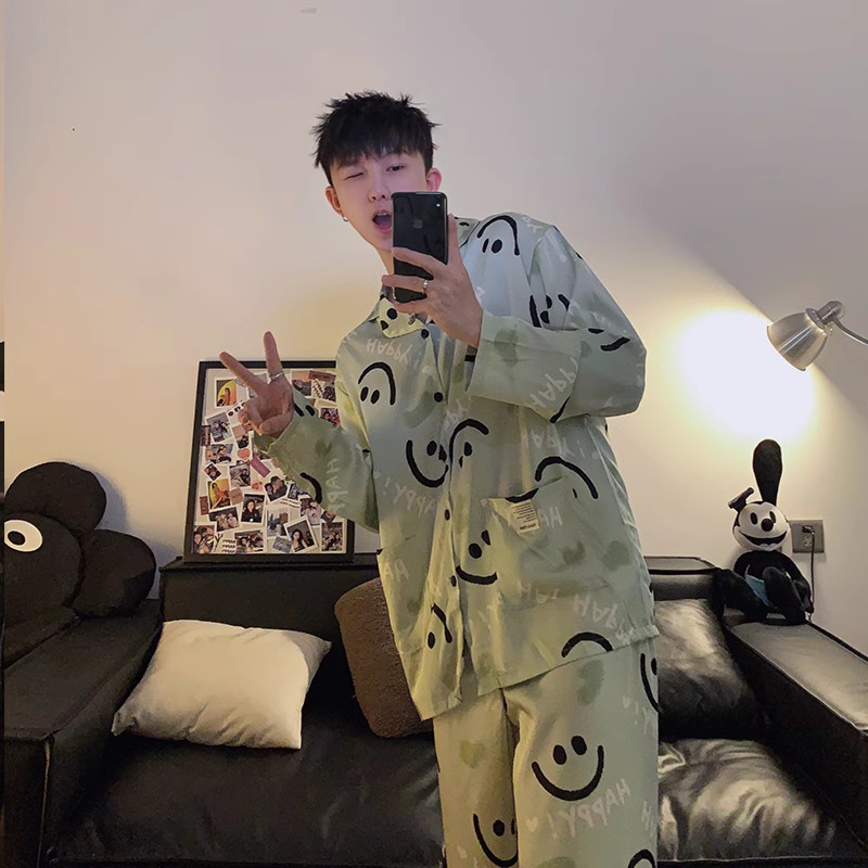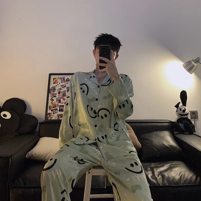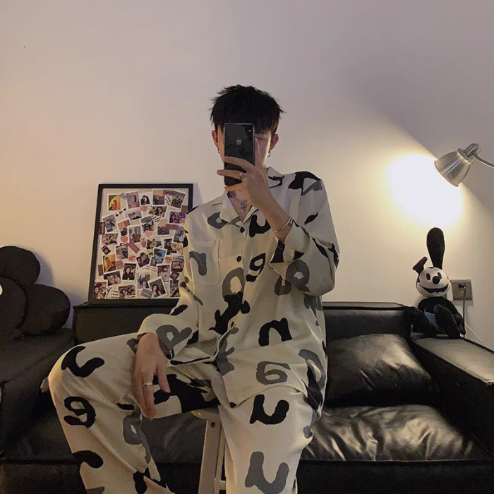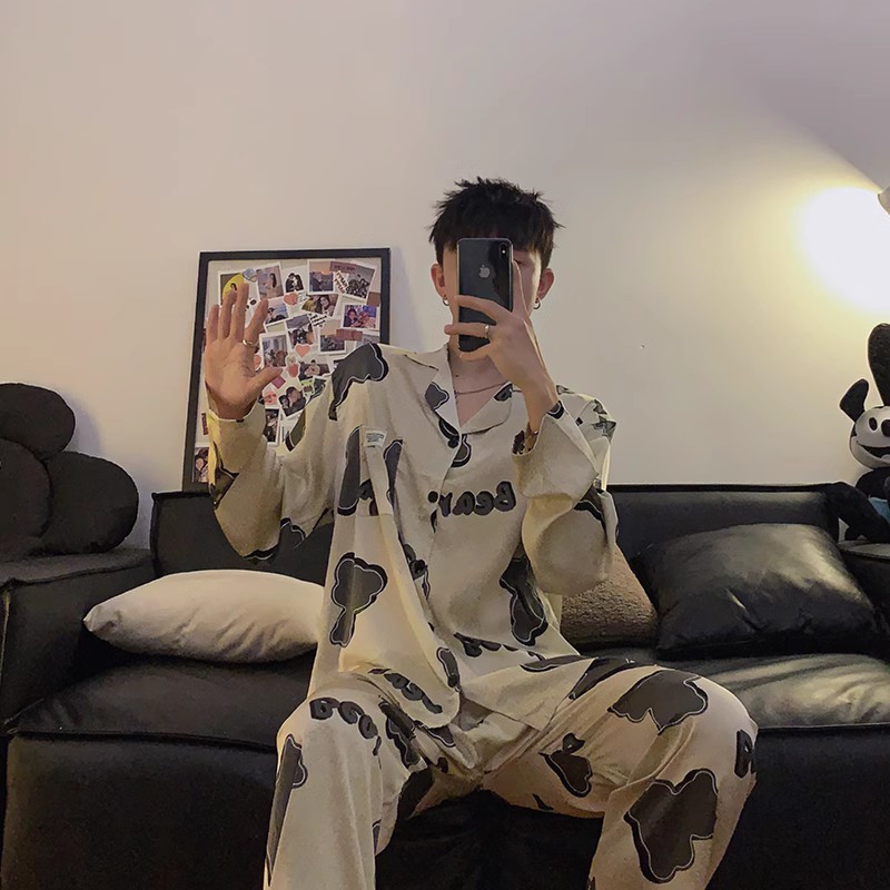 봄과 가을 남자의 잠옷 아이스 실크 얇은 긴 소매 2024 새로운 스타일 실크 남자의 세트 가정 의류 겉옷스토어 가기