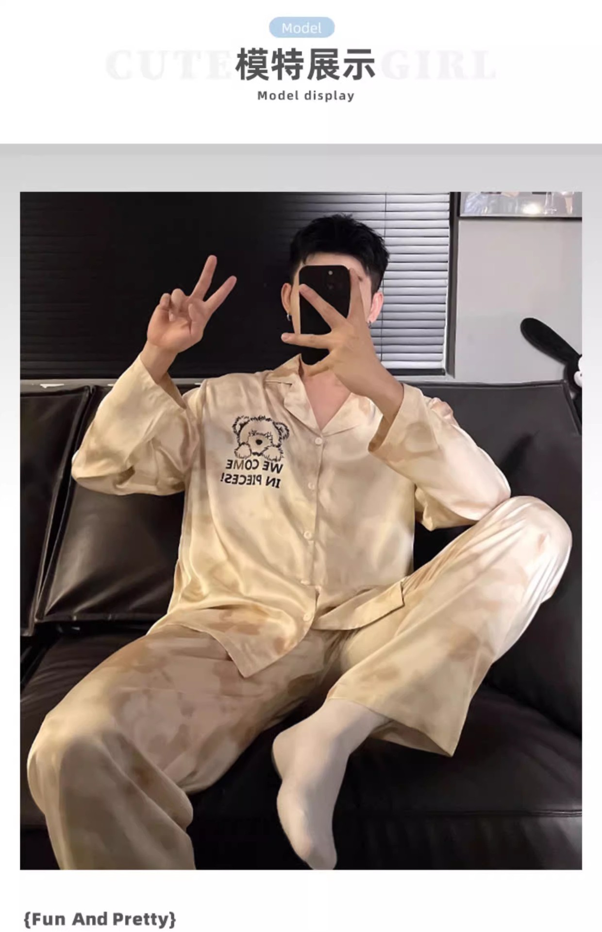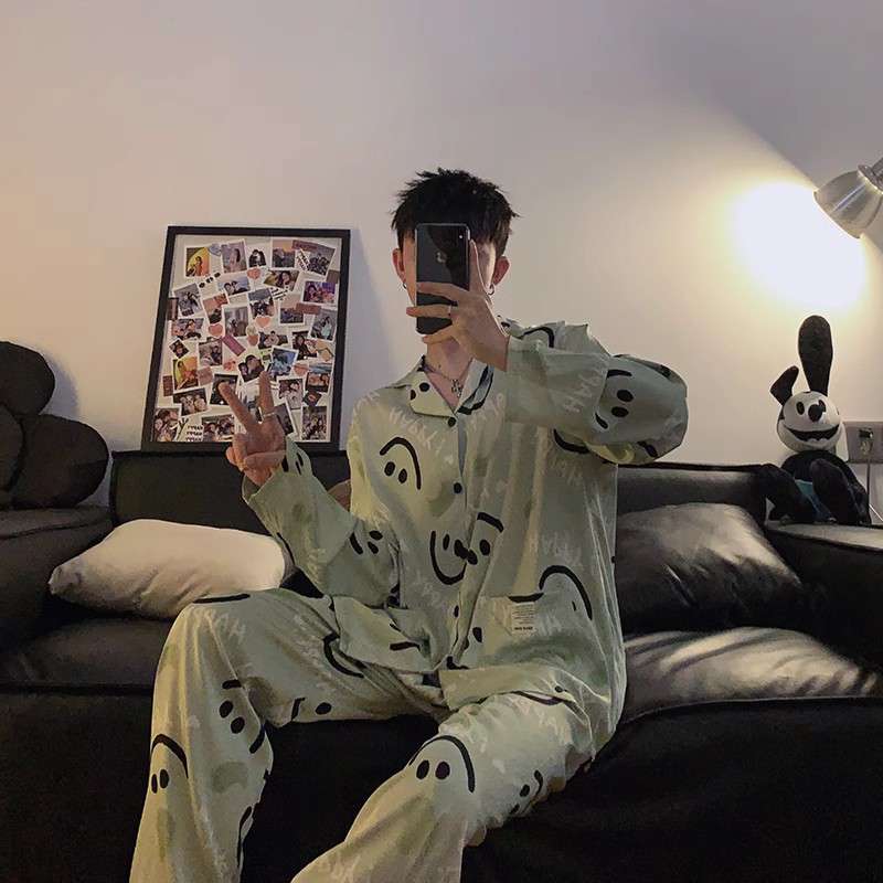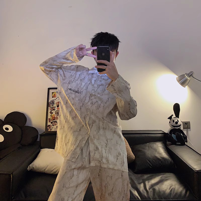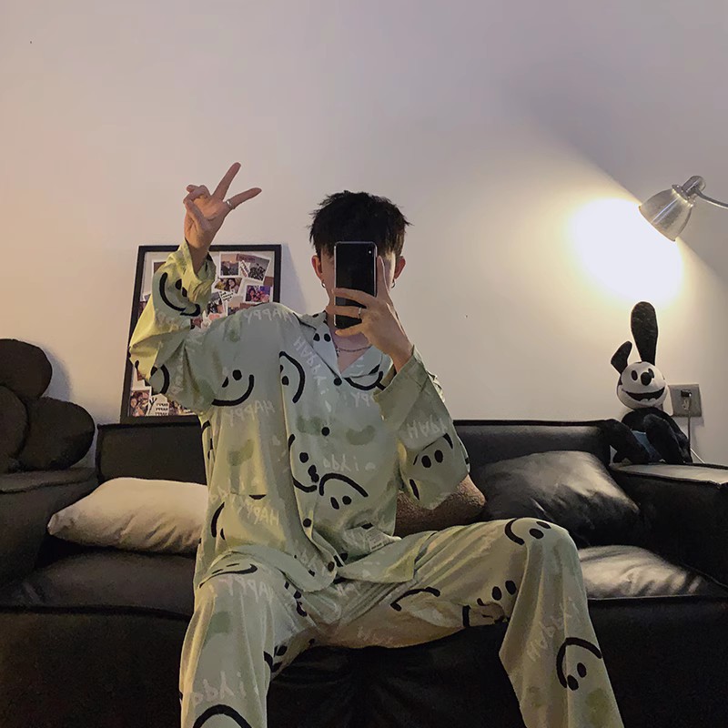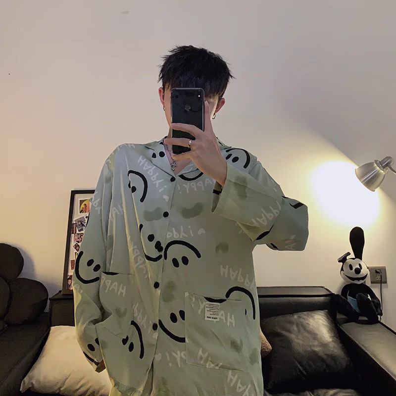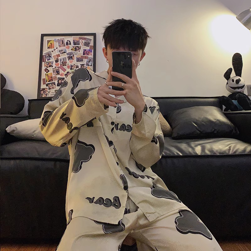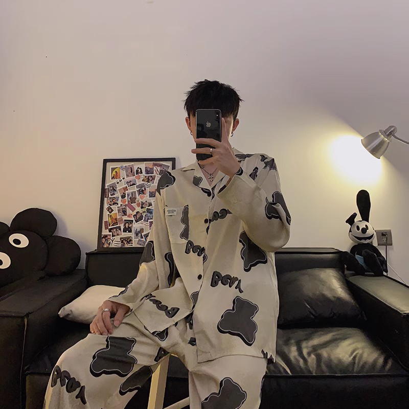 봄과 가을 남자의 잠옷 아이스 실크 얇은 긴 소매 2024 새로운 스타일 실크 남자의 세트 가정 의류 겉옷스토어 가기