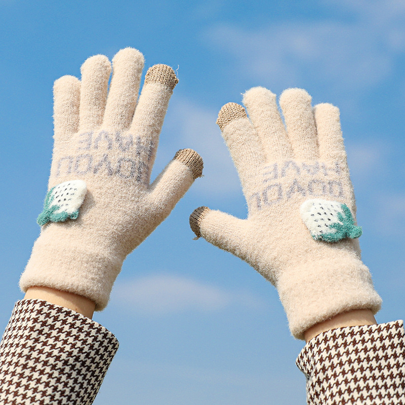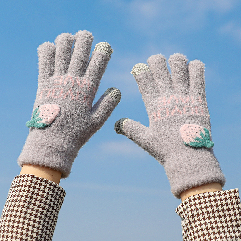 겨울 딸기 터치 스크린 장갑 한국식 따뜻한 방한 사이클링 귀여운 소녀 봉제 니트 다섯 손가락 장갑