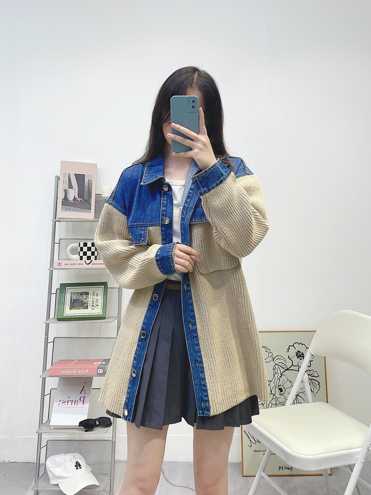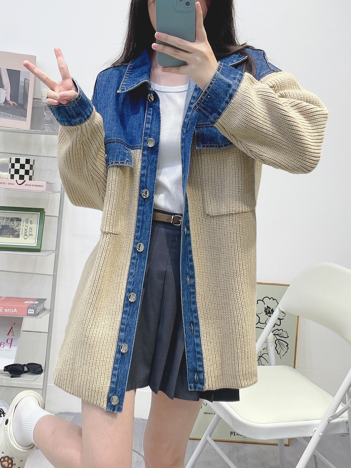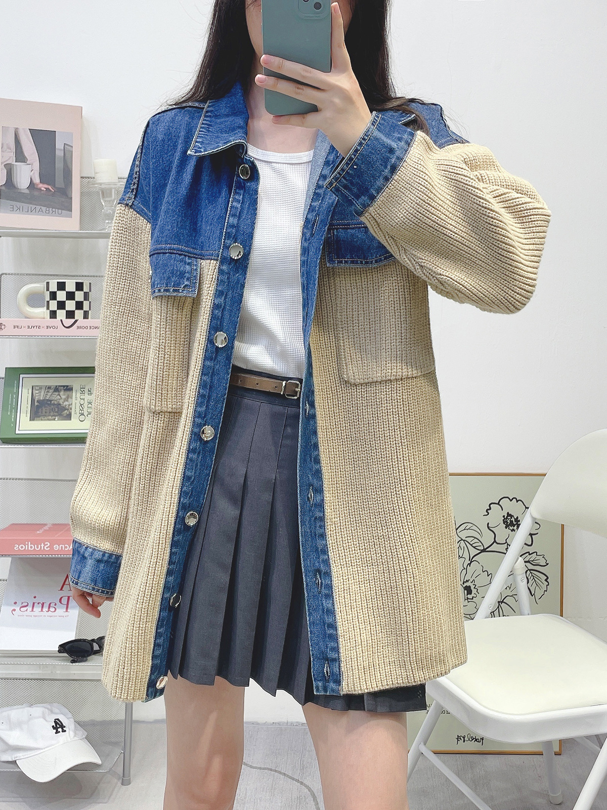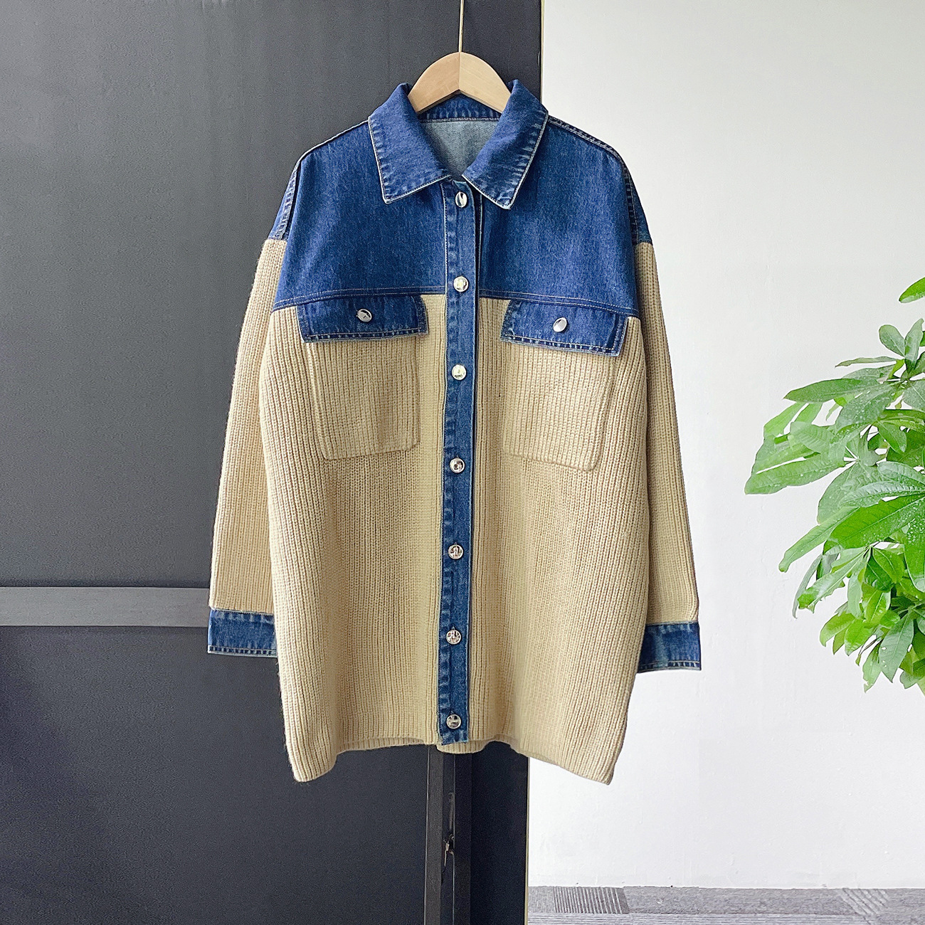 가을 2023 빈티지 패션 대비 색상 데님 바느질 옷깃 니트 카디건 여성의 새로운 여성 의류스토어 가기