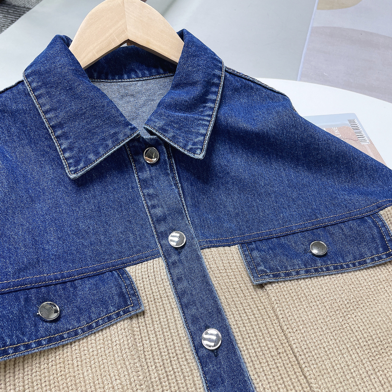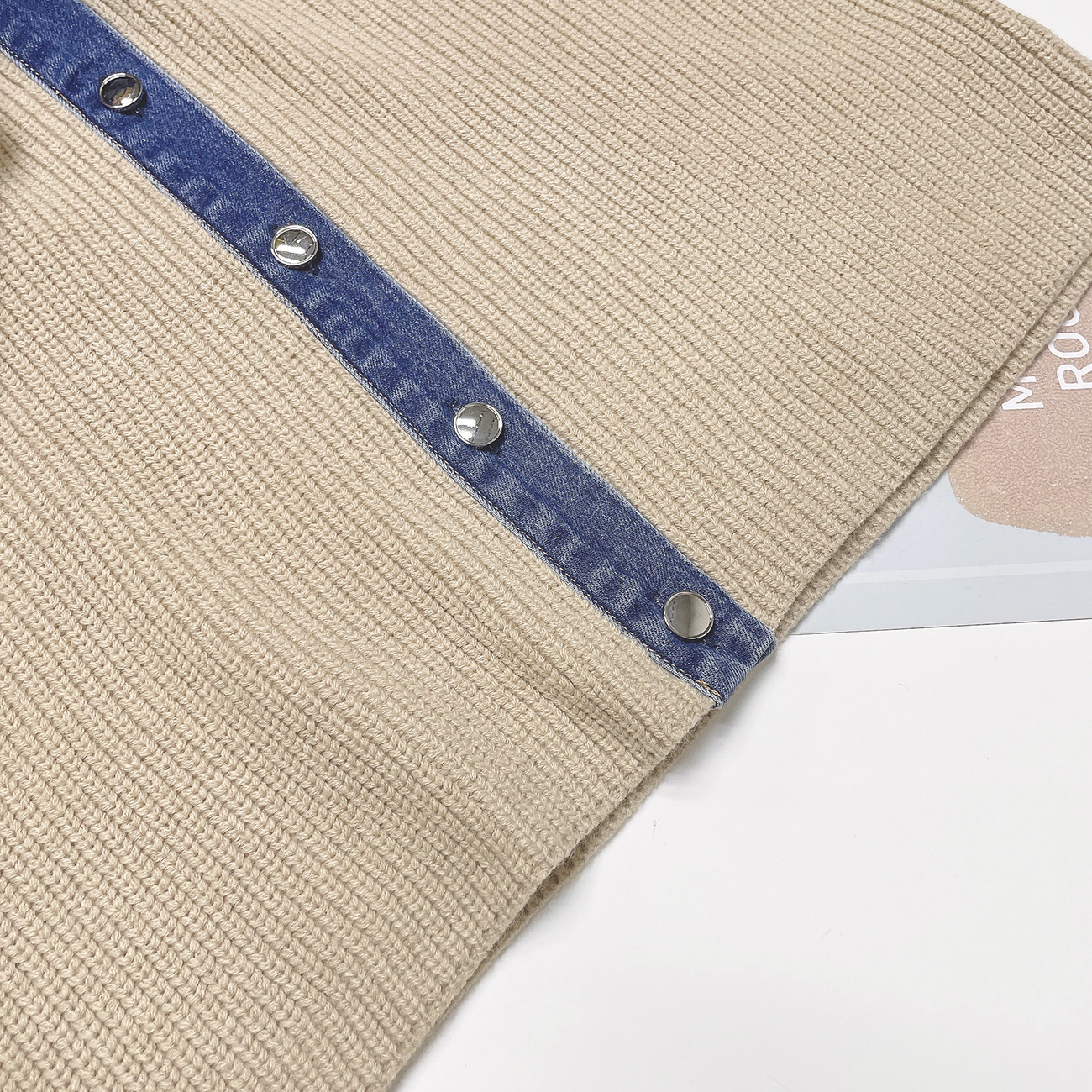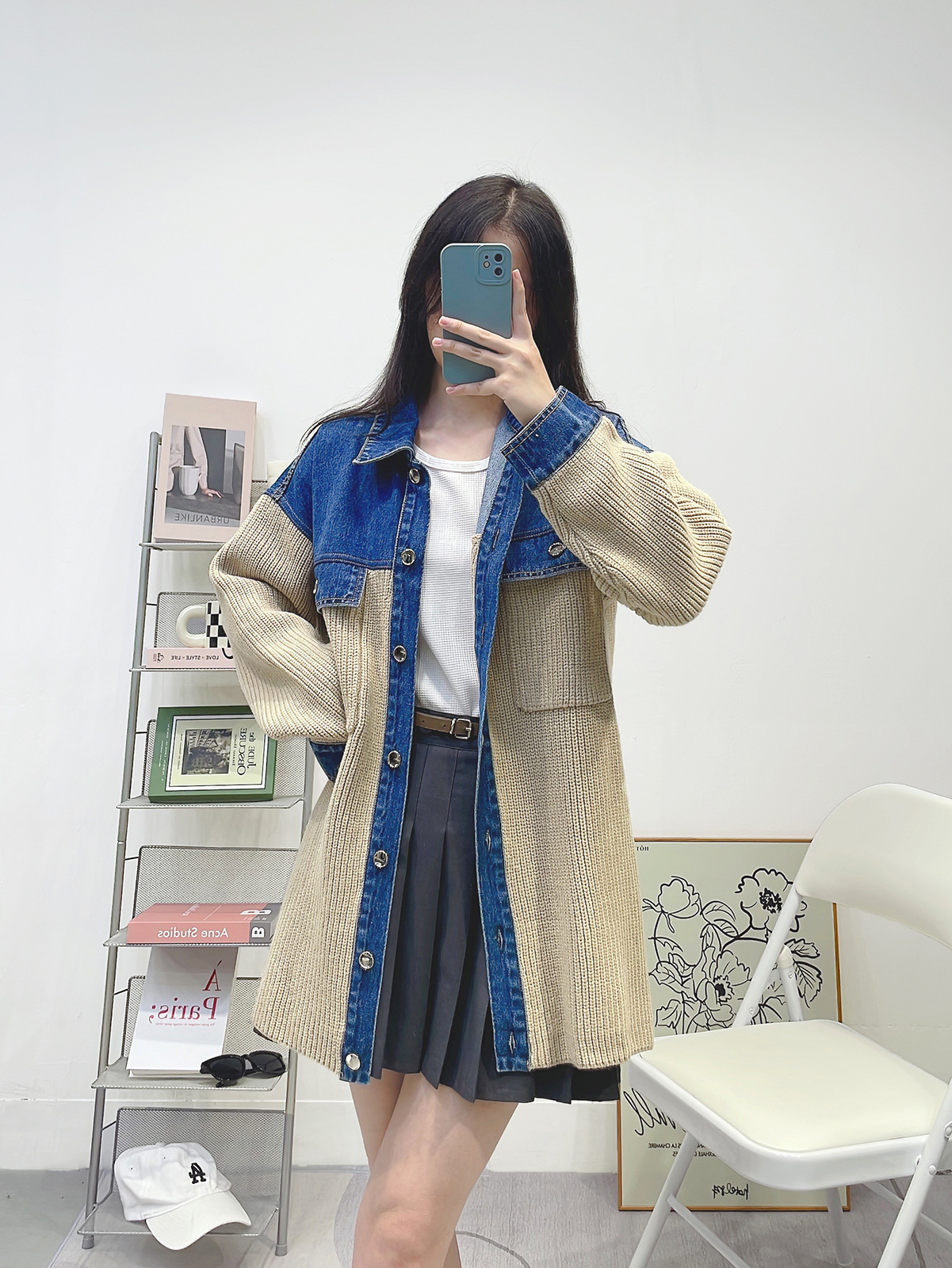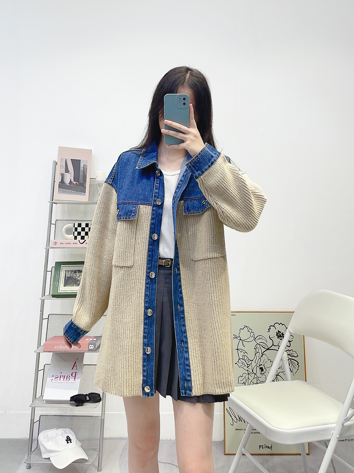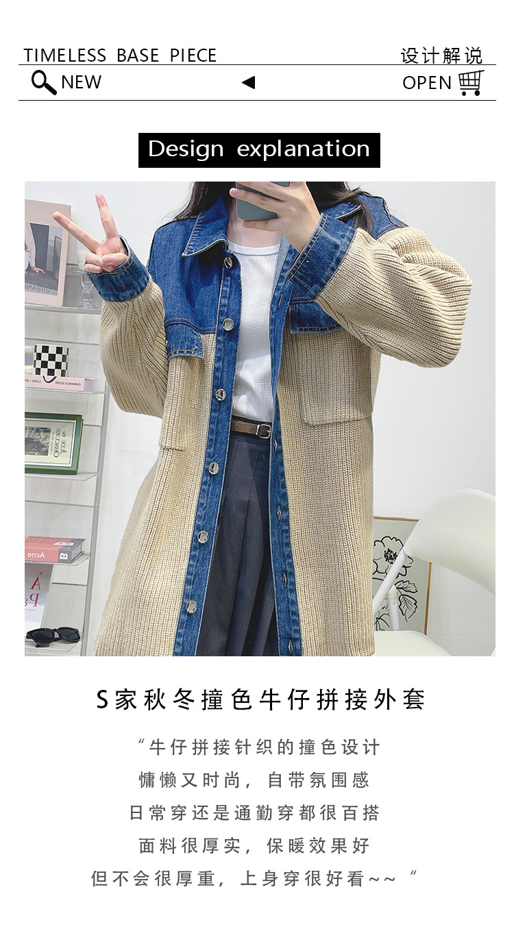 가을 2023 빈티지 패션 대비 색상 데님 바느질 옷깃 니트 카디건 여성의 새로운 여성 의류스토어 가기