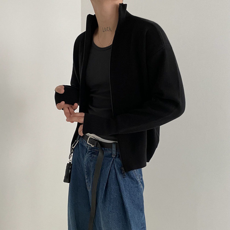MYQ 지퍼 니트 가디건 재킷 남자의 가을 한국 스타일 느슨한 유행 스탠드 칼라 게으른 반 터틀넥 스웨터스토어 가기