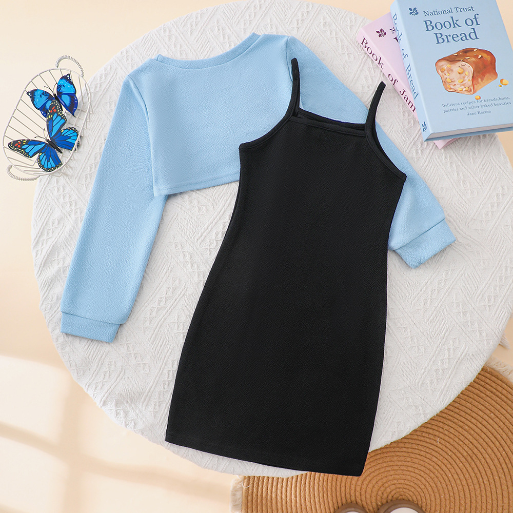 EW 외국 무역 아동 의류 큰 어린이의 새로운 소녀 봄과 가을 짧은 탑 멜빵 스커트 세트 DTZ888-D
