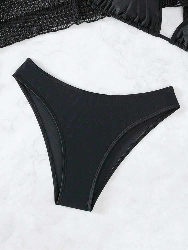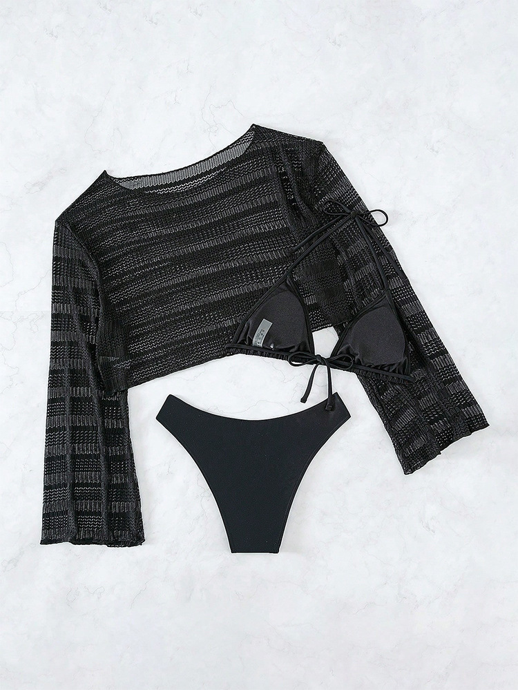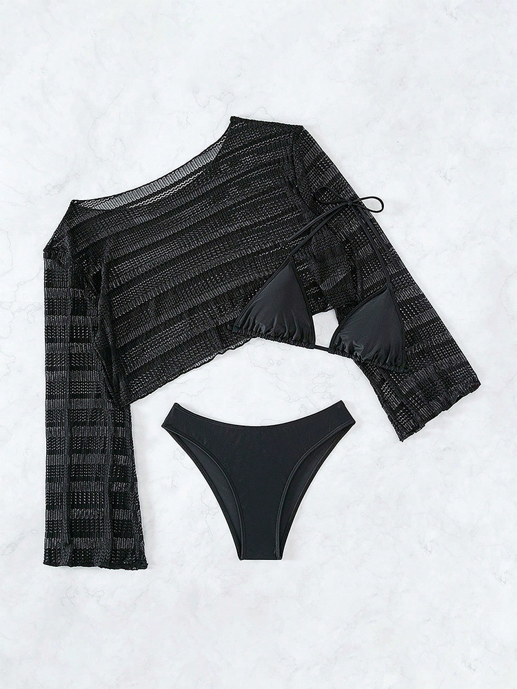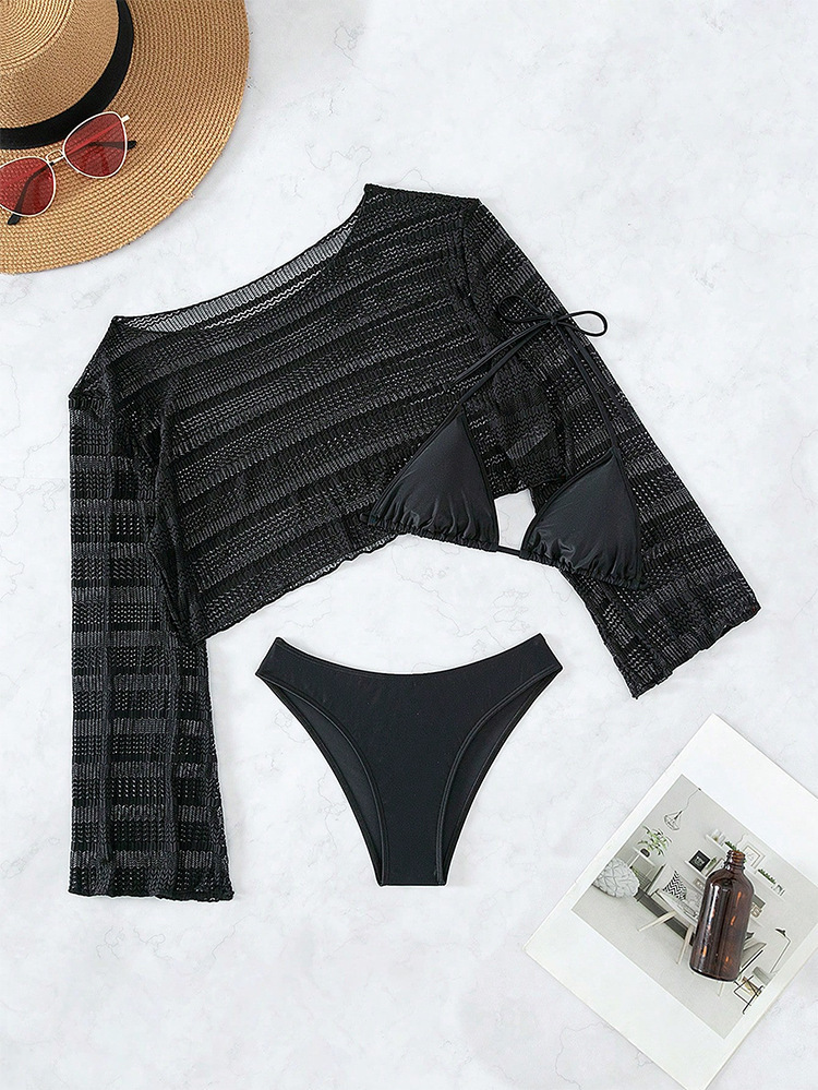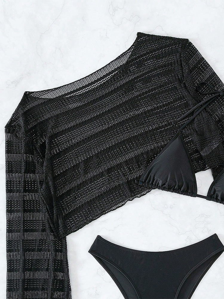 亚马逊新款欧美网纱长袖罩衫沙滩三件套泳衣女高级感比基尼游泳装