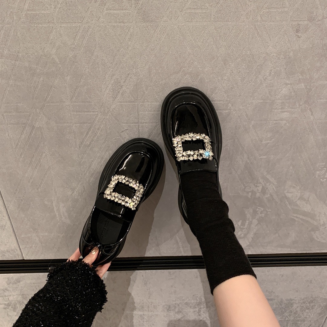 [Sheii Su Yinyin] 프린세스 하이드 ~ 라운드 헤드 라인 석 스퀘어 버클 두꺼운 바닥 두꺼운 굽 Lefu 싱글 슈즈 여성용 작은 가죽 신발