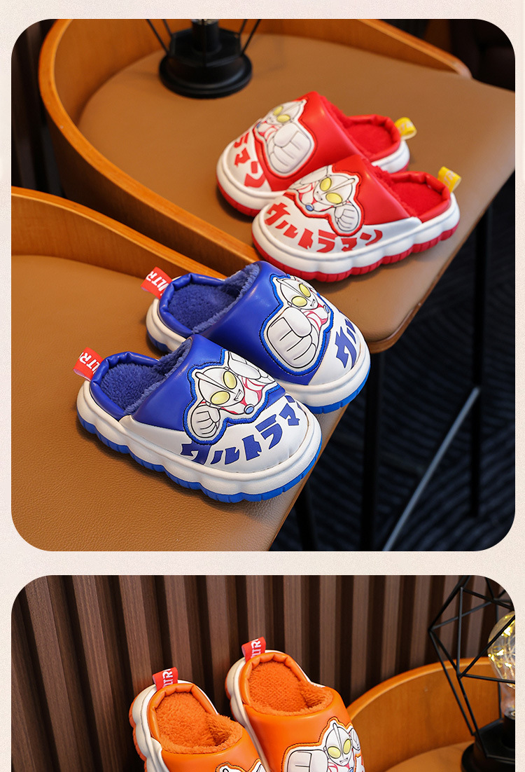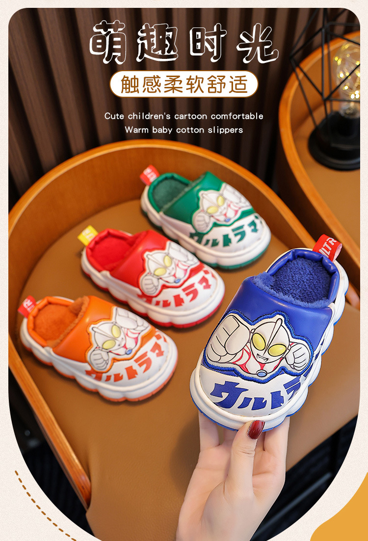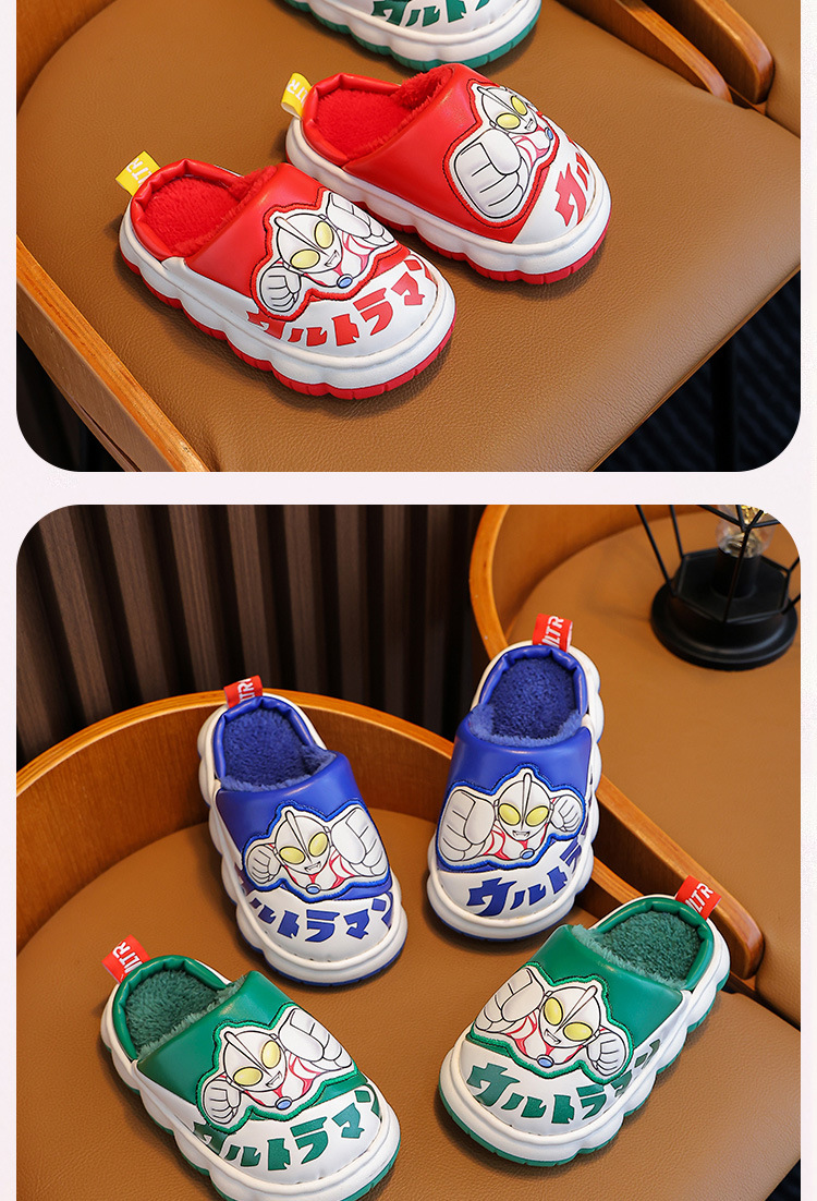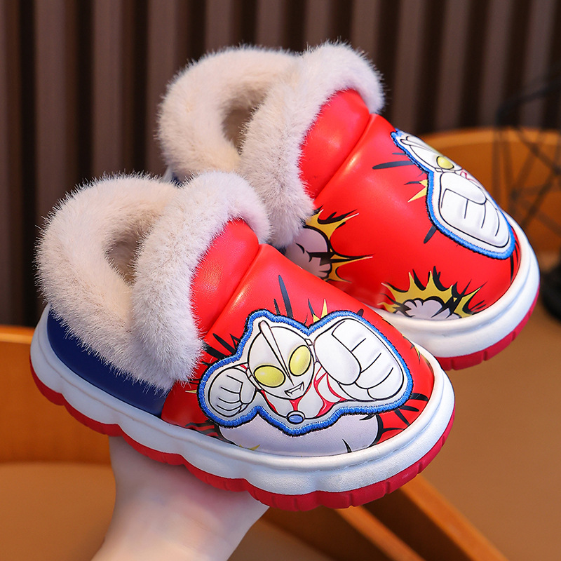 울트라맨 어린이 슬리퍼 남아 겨울용 아기 실내용 가정용 아동용 풋웨어 PU 가죽 여아용 면 슬리퍼 만화 스타일
