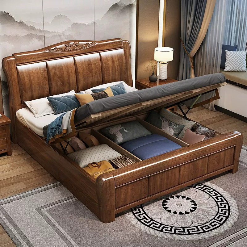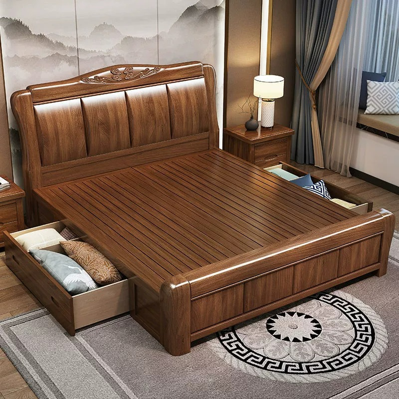 월넛 단단한 나무 침대 1.8 m 더블 침대 현대 간단한 마스터 침실 중국 스타일 1.5 m 침실 높은 상자 보관 웨딩 침대