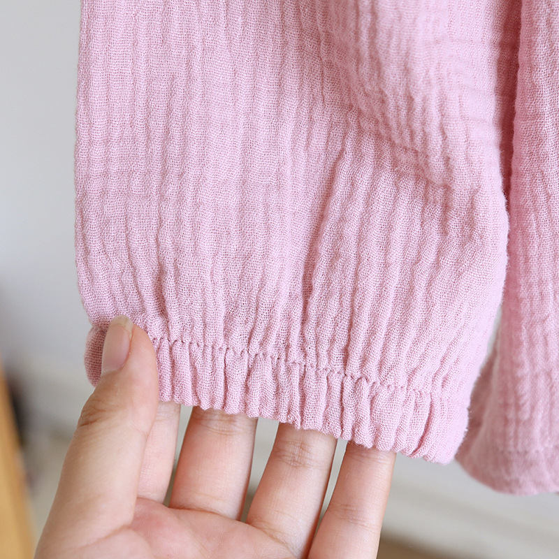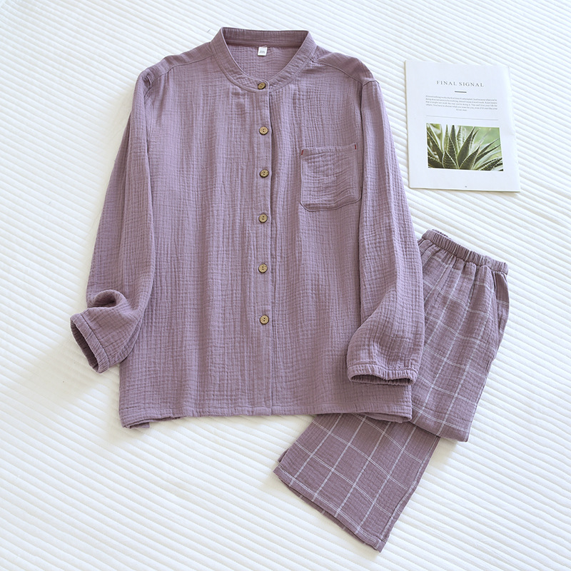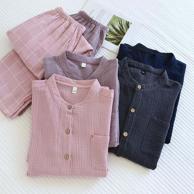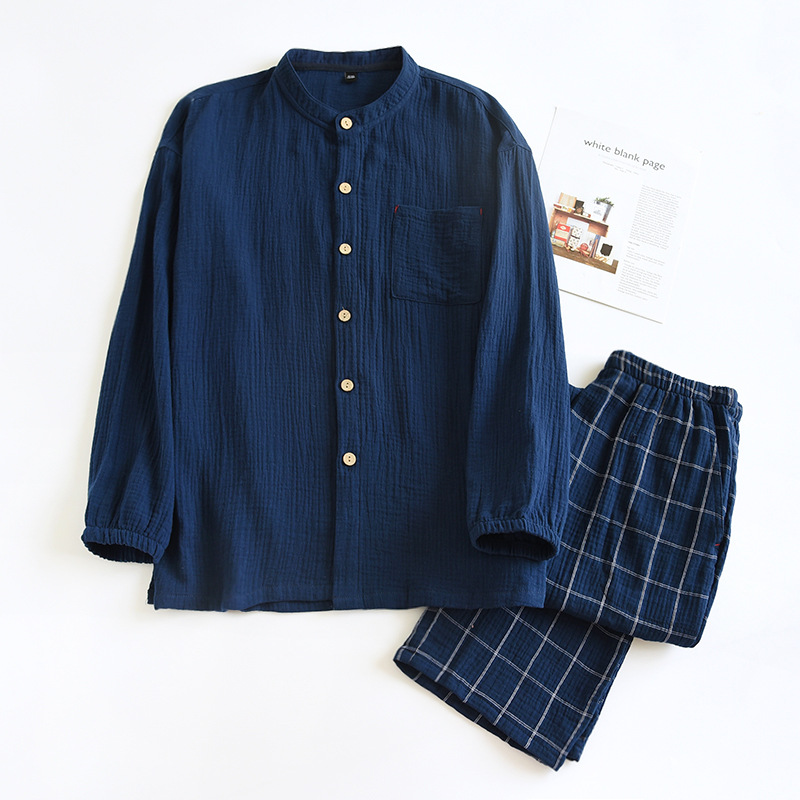 일본식 순면 잠옷 세트 남자의 씻어 크레이프 가정 옷 모든 면 더블 레이어 원사 커플의 긴 소매 가디건스토어 가기
