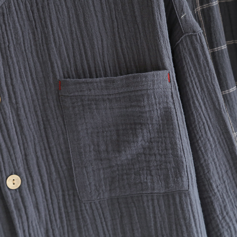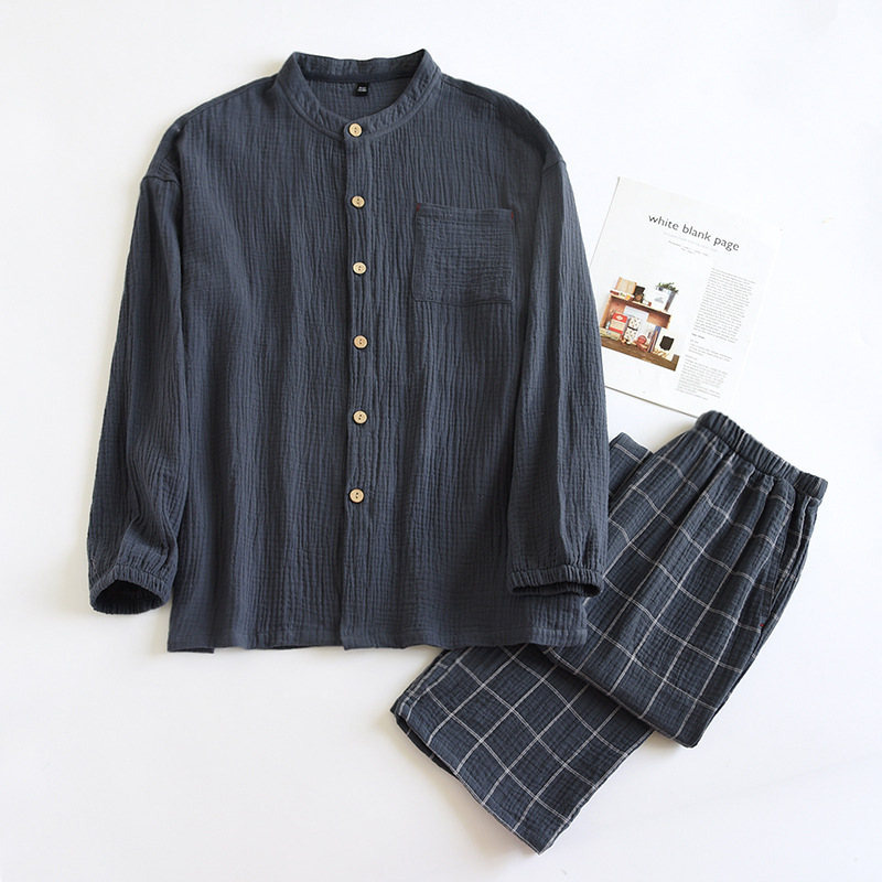 일본식 순면 잠옷 세트 남자의 씻어 크레이프 가정 옷 모든 면 더블 레이어 원사 커플의 긴 소매 가디건