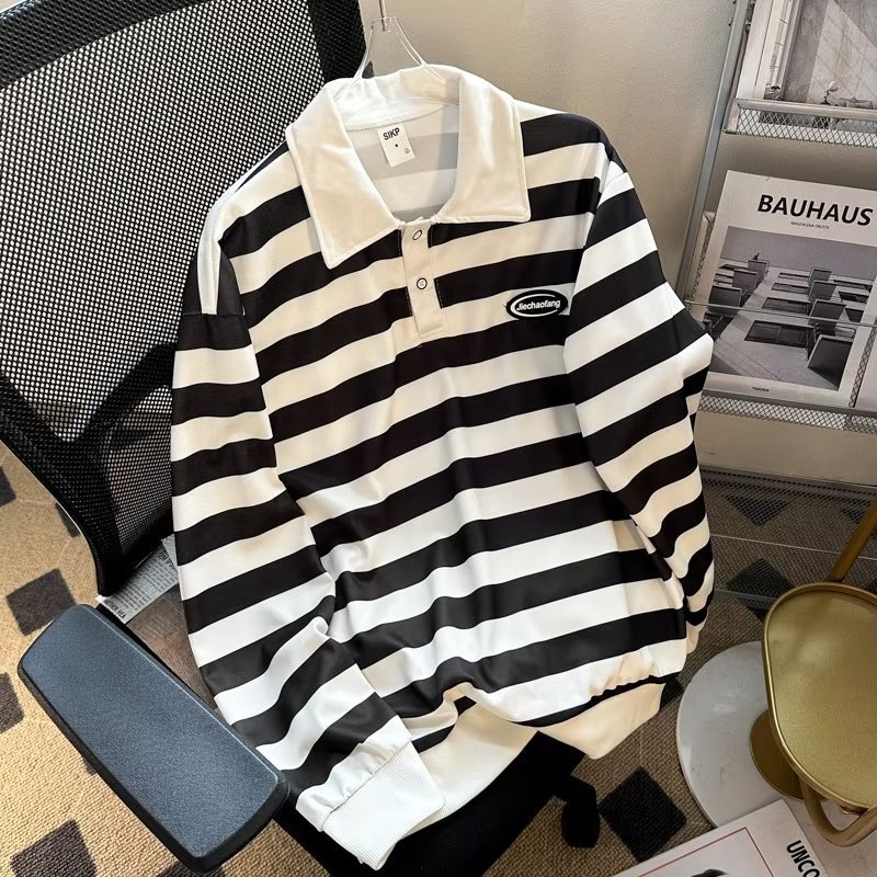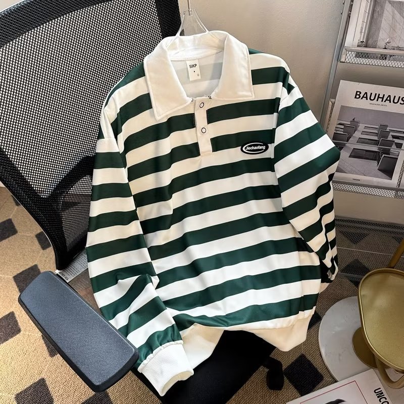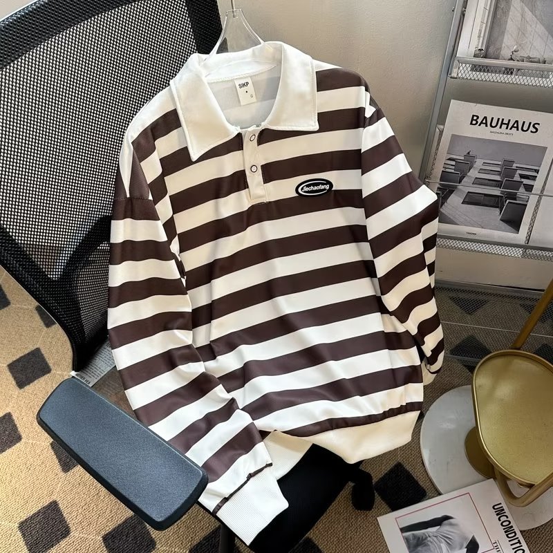 크로스보더 라펠 스웨트셔츠 남성용 봄/가을 스트라이프 긴팔 루즈핏 레트로 다용도 풀오버 긴팔 상의 트렌디 심플 2026스토어 가기