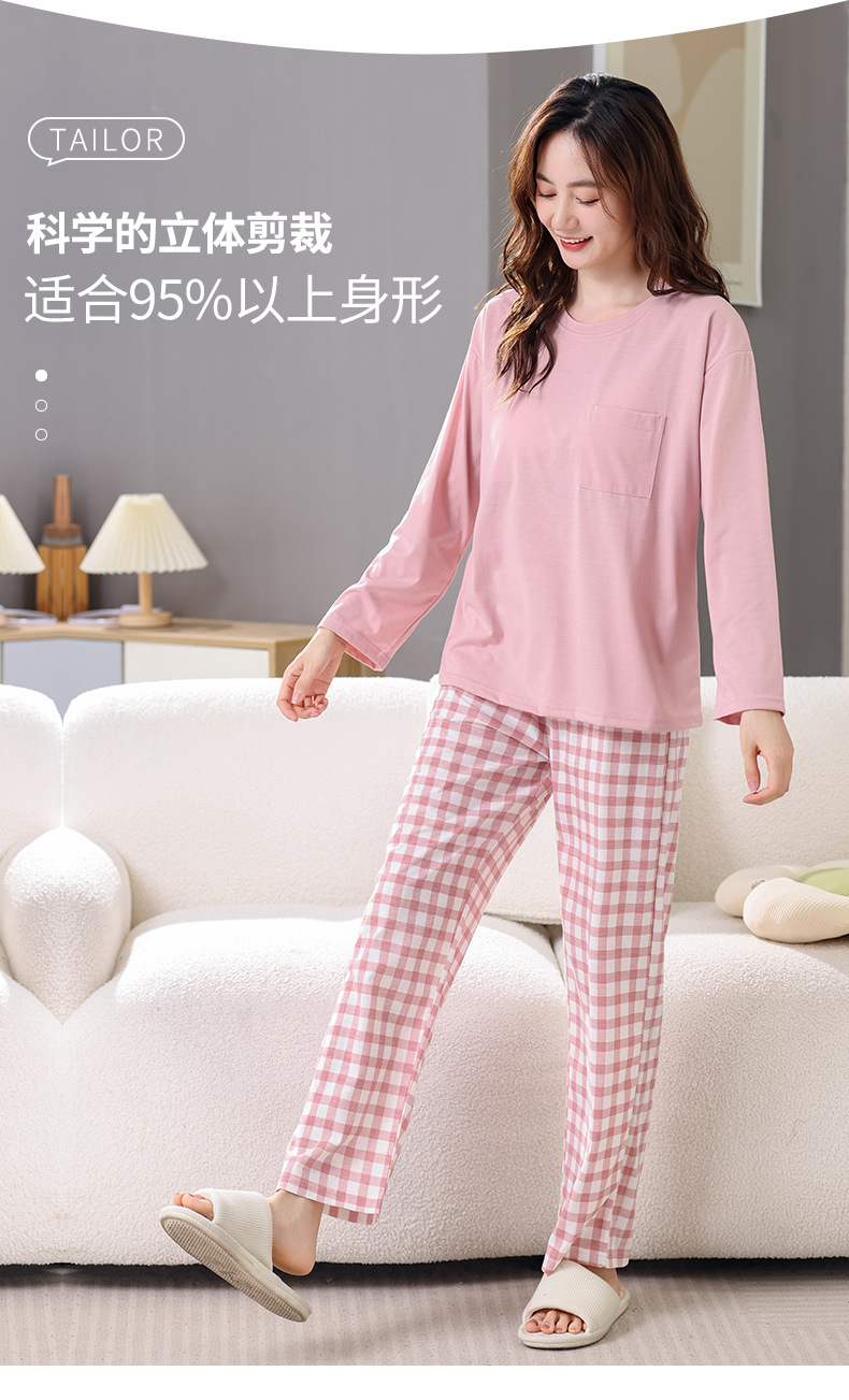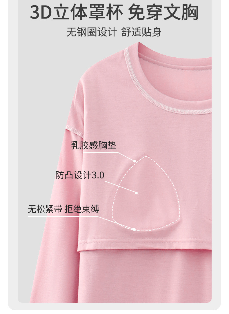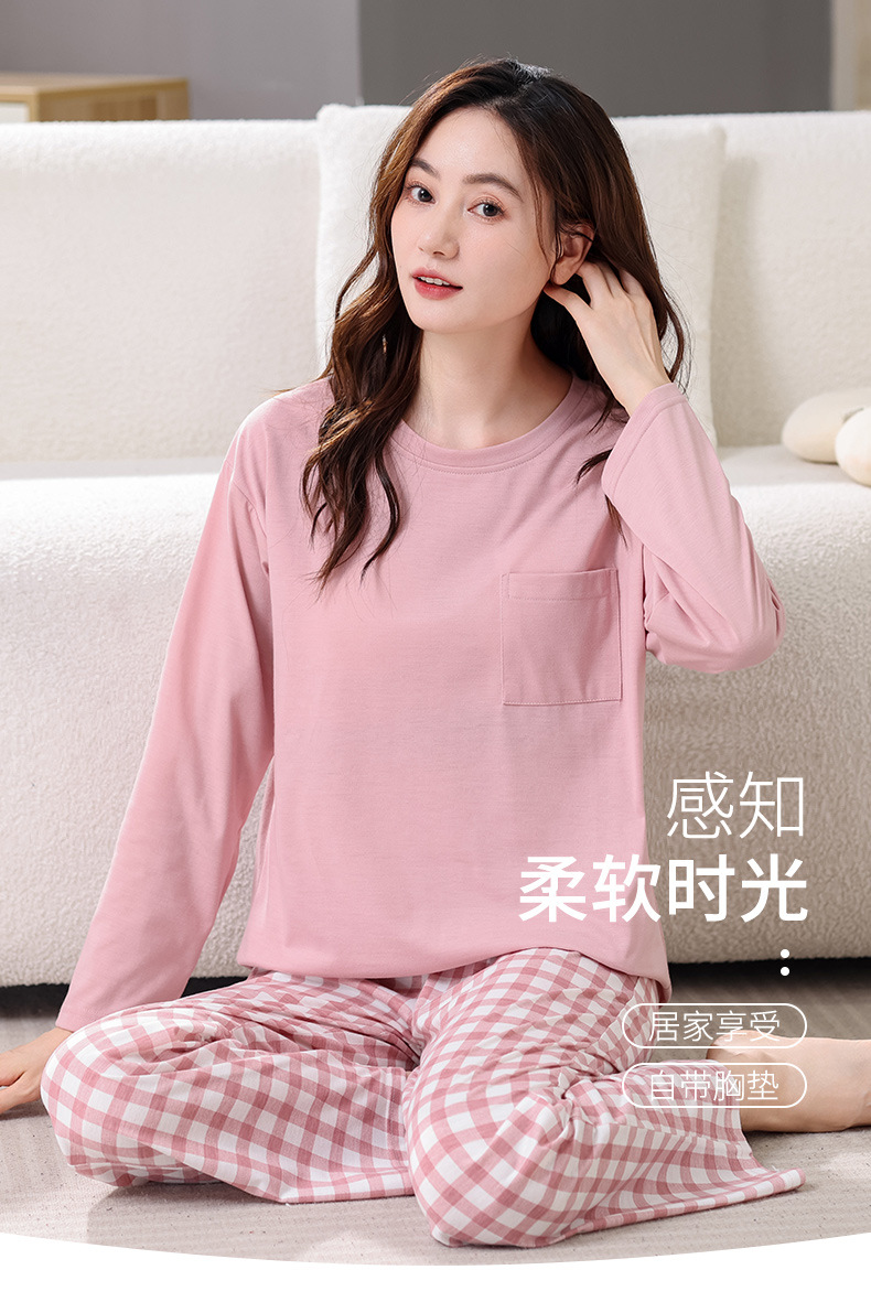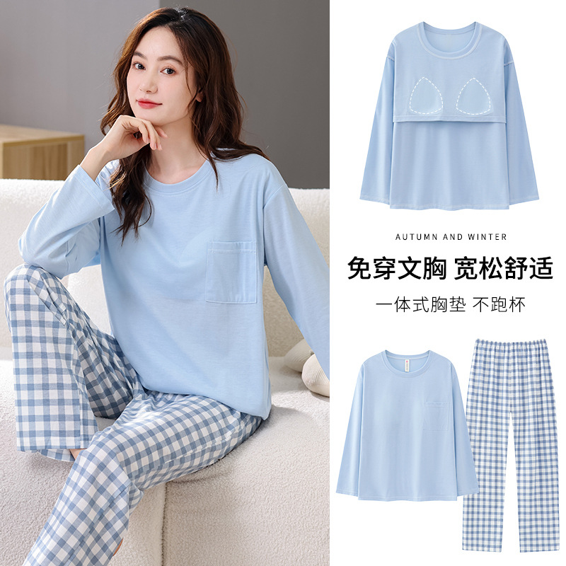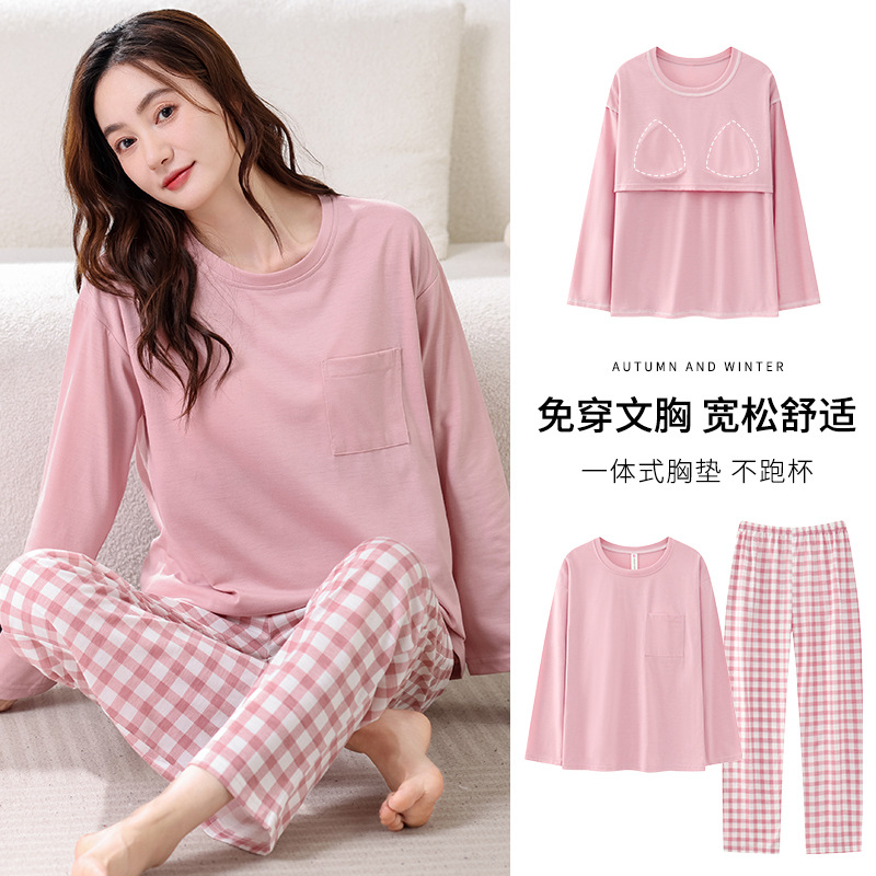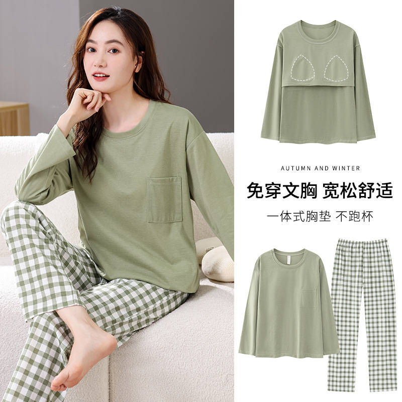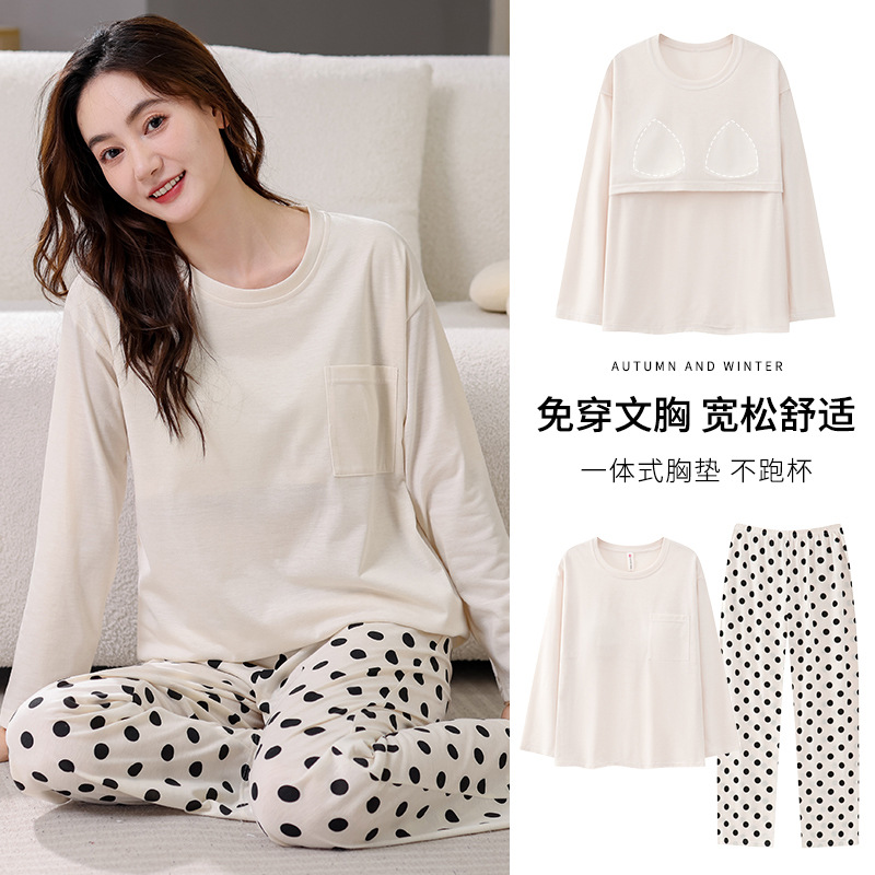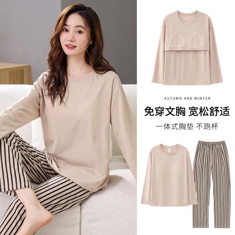2025년 봄 가을 여성용 새 잠옷, 긴팔 바지, 가슴 패드가 있는 순면, 야외에서 입을 수 있는 올인원 가정복 세트