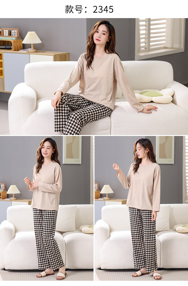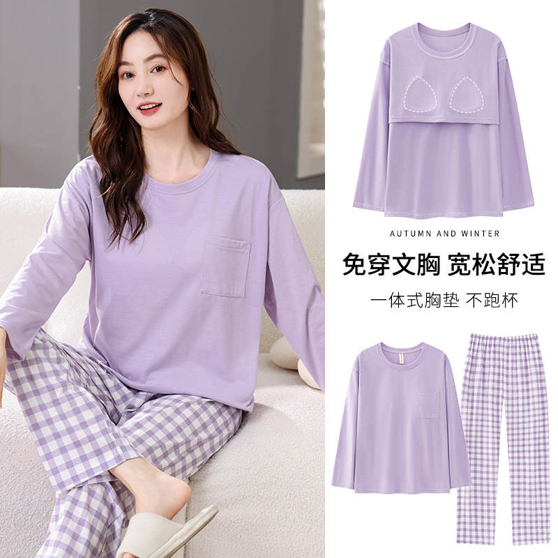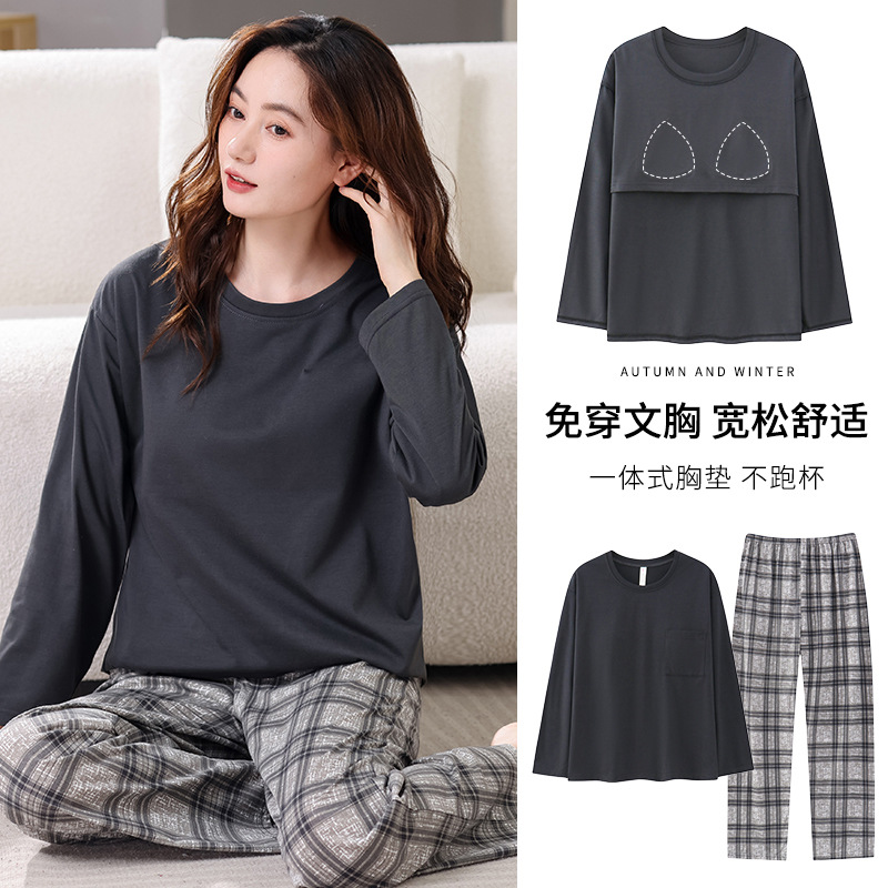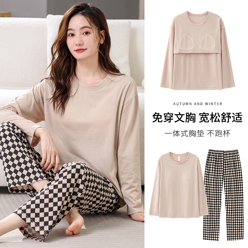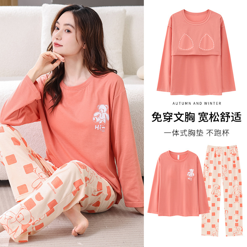 2025년 봄 가을 여성용 새 잠옷, 긴팔 바지, 가슴 패드가 있는 순면, 야외에서 입을 수 있는 올인원 가정복 세트스토어 가기