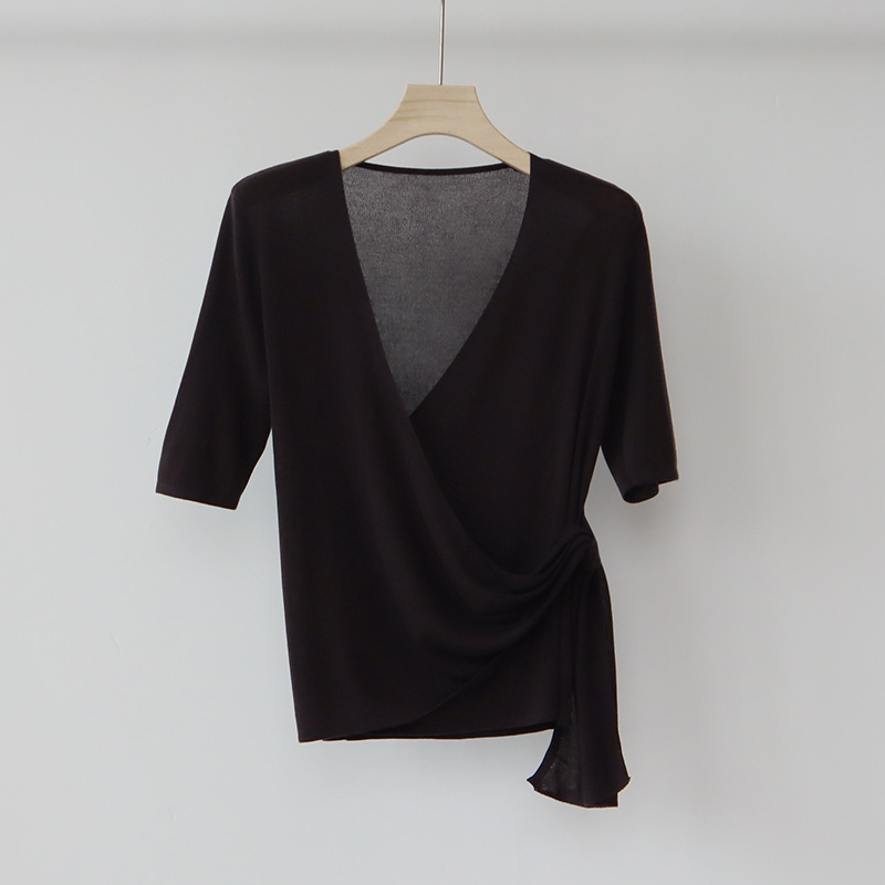 레이세르 텐셀 여름 크로스 스트랩 니트 반팔 브이넥 탑 티셔츠 여성용 고온 성형 공정