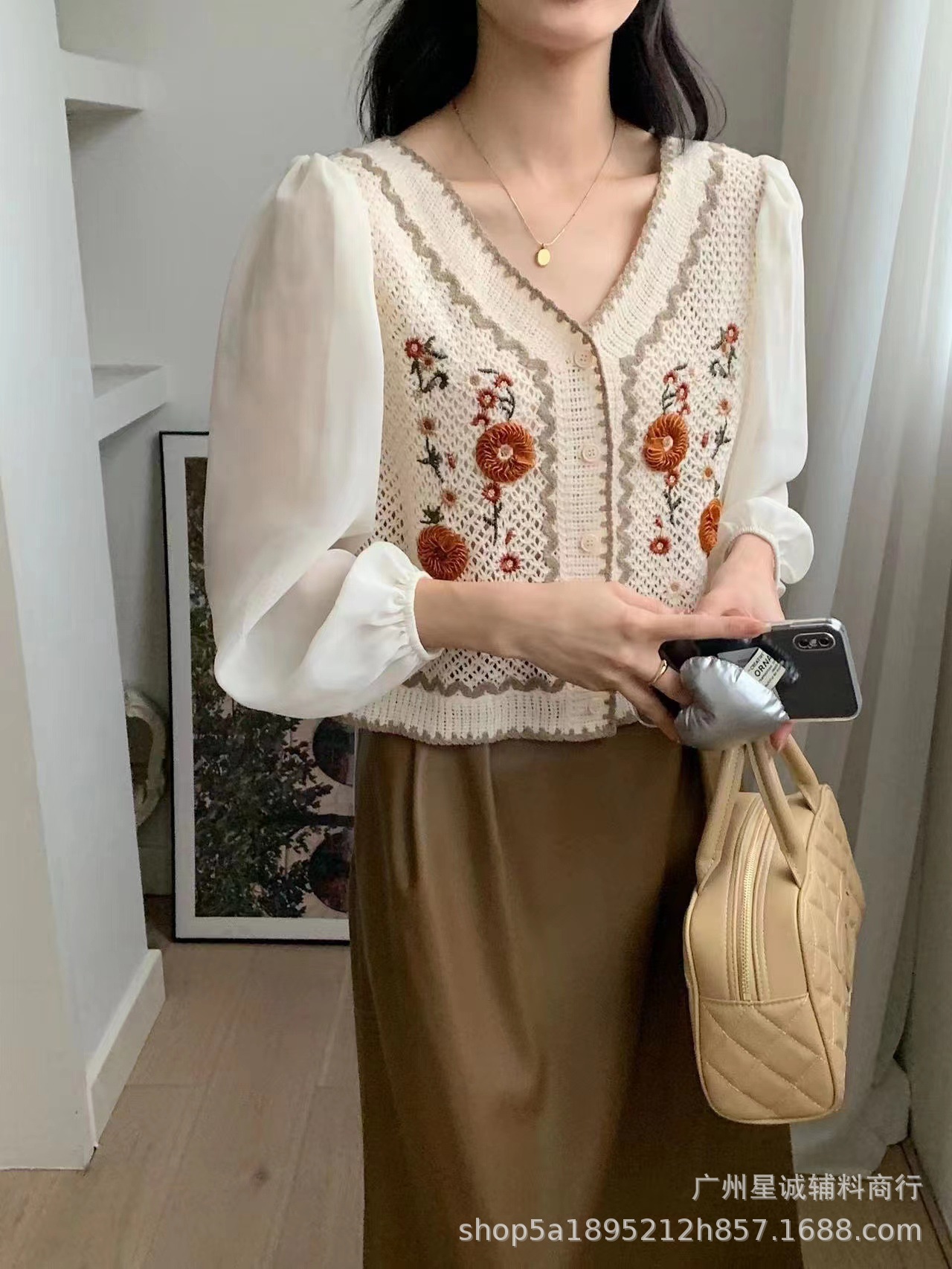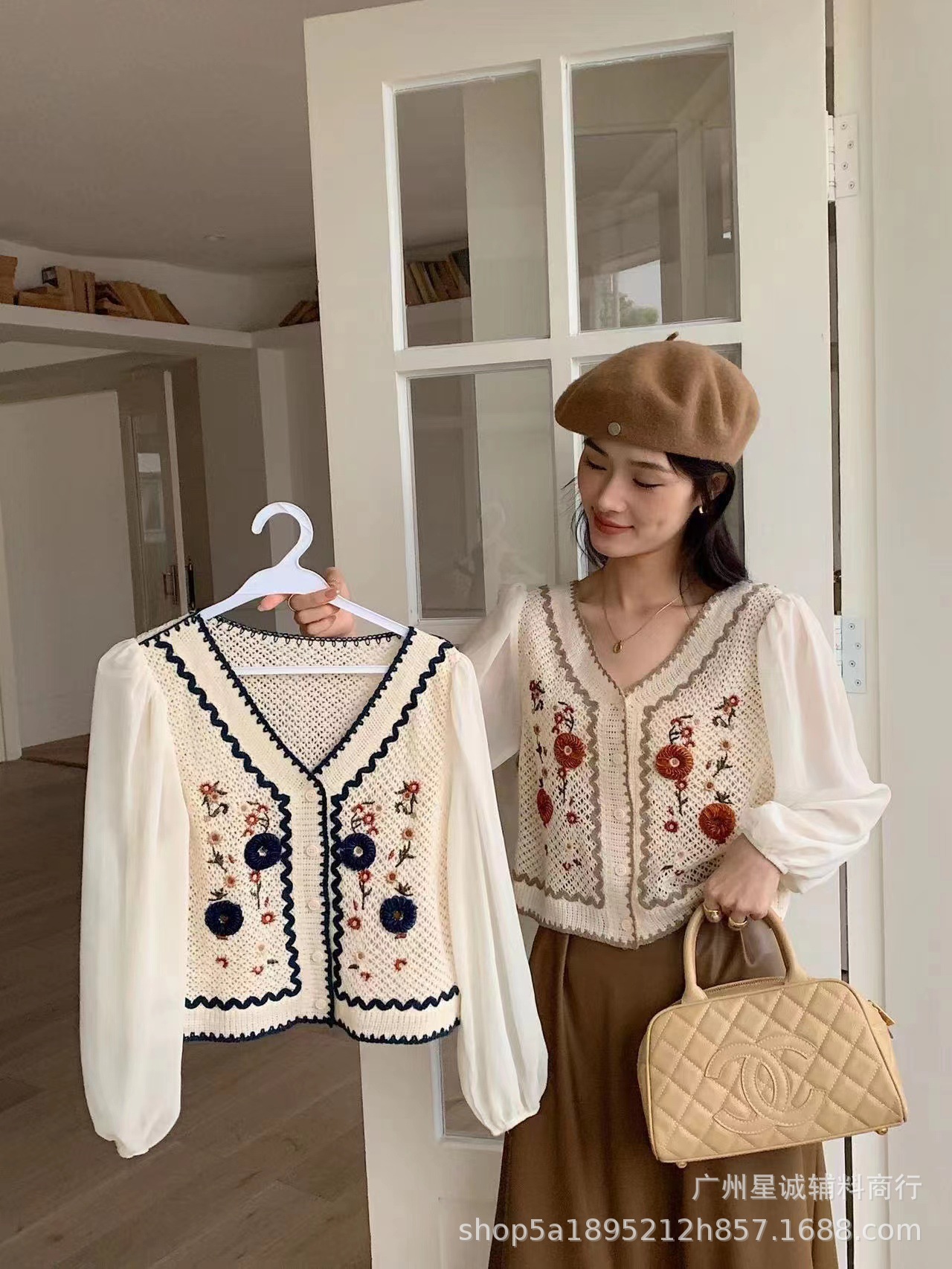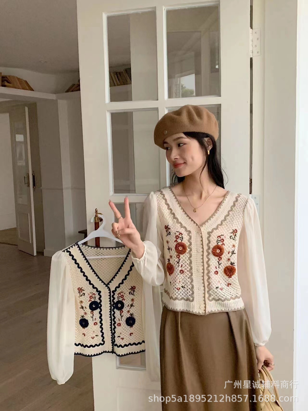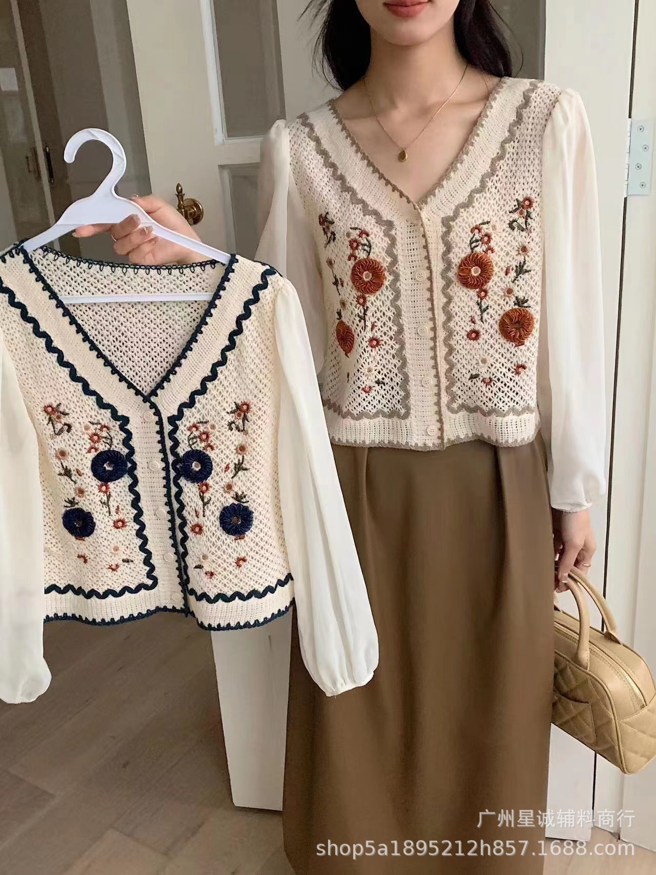 가짜 투피스 스티칭 자수 니트 카디건 여성 봄 2023 새로운 프랑스 스타일 부드러운 스타일 고급 쉬폰 슬리브 탑스토어 가기