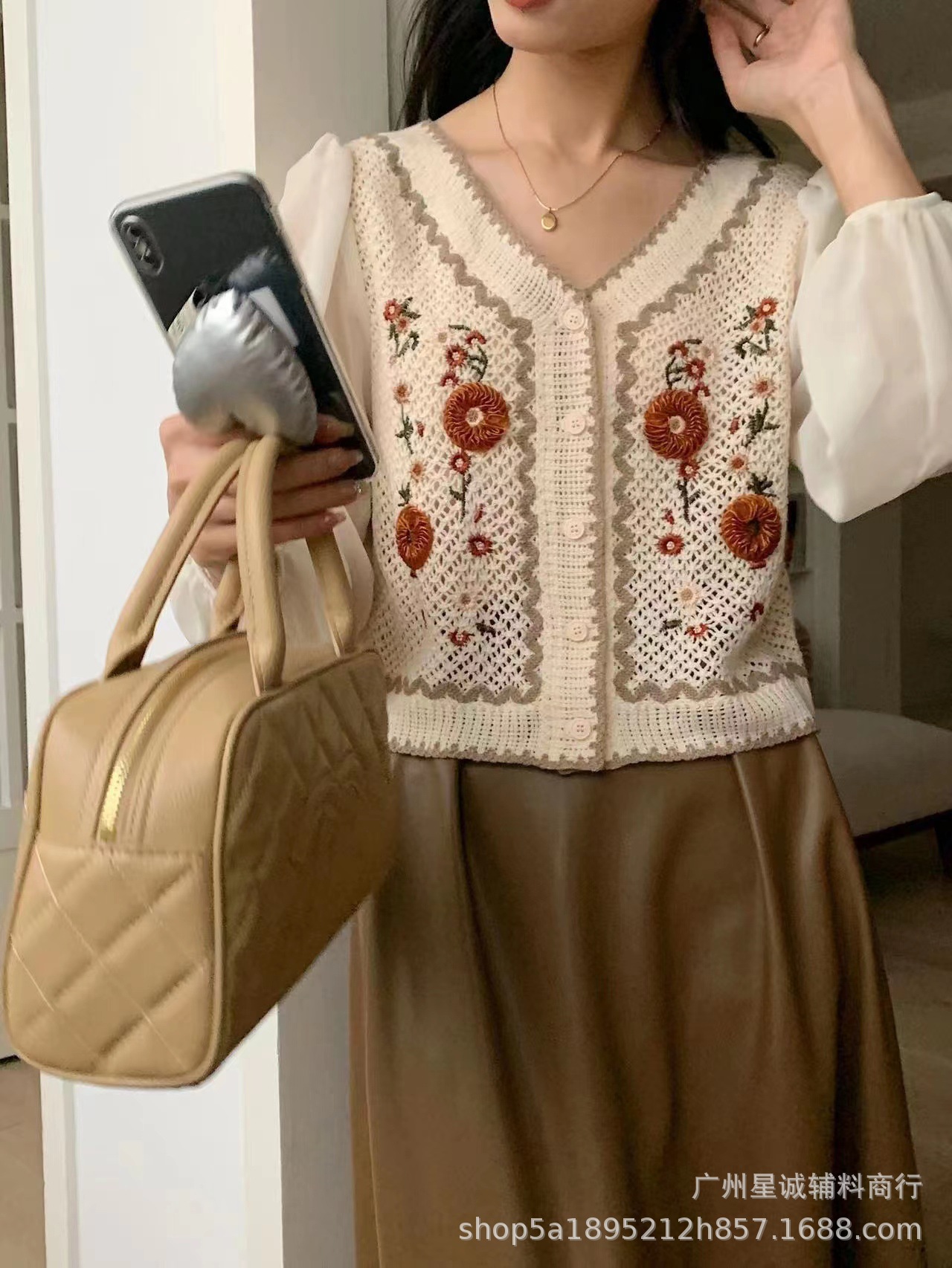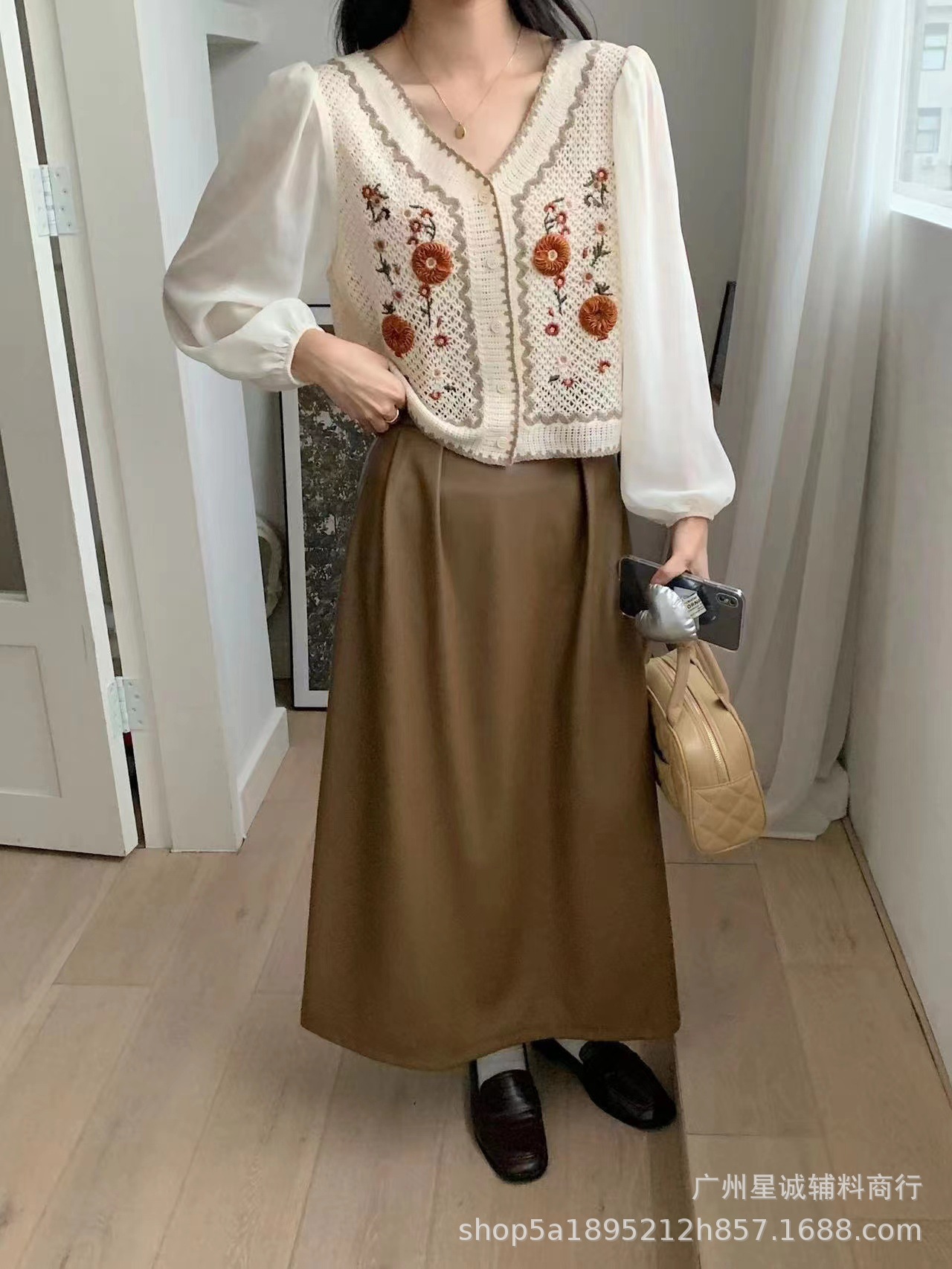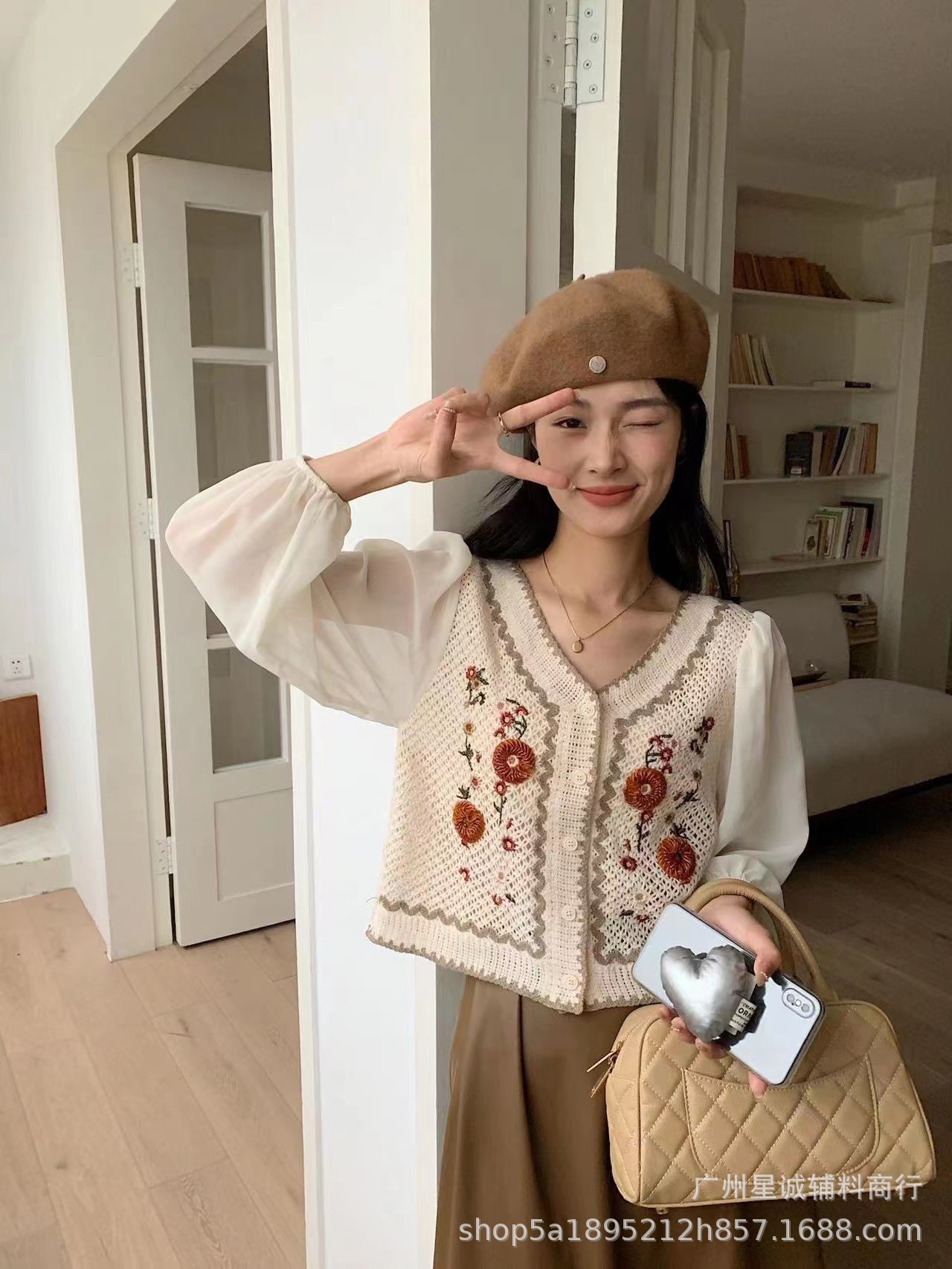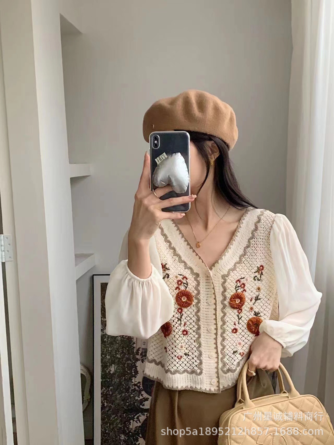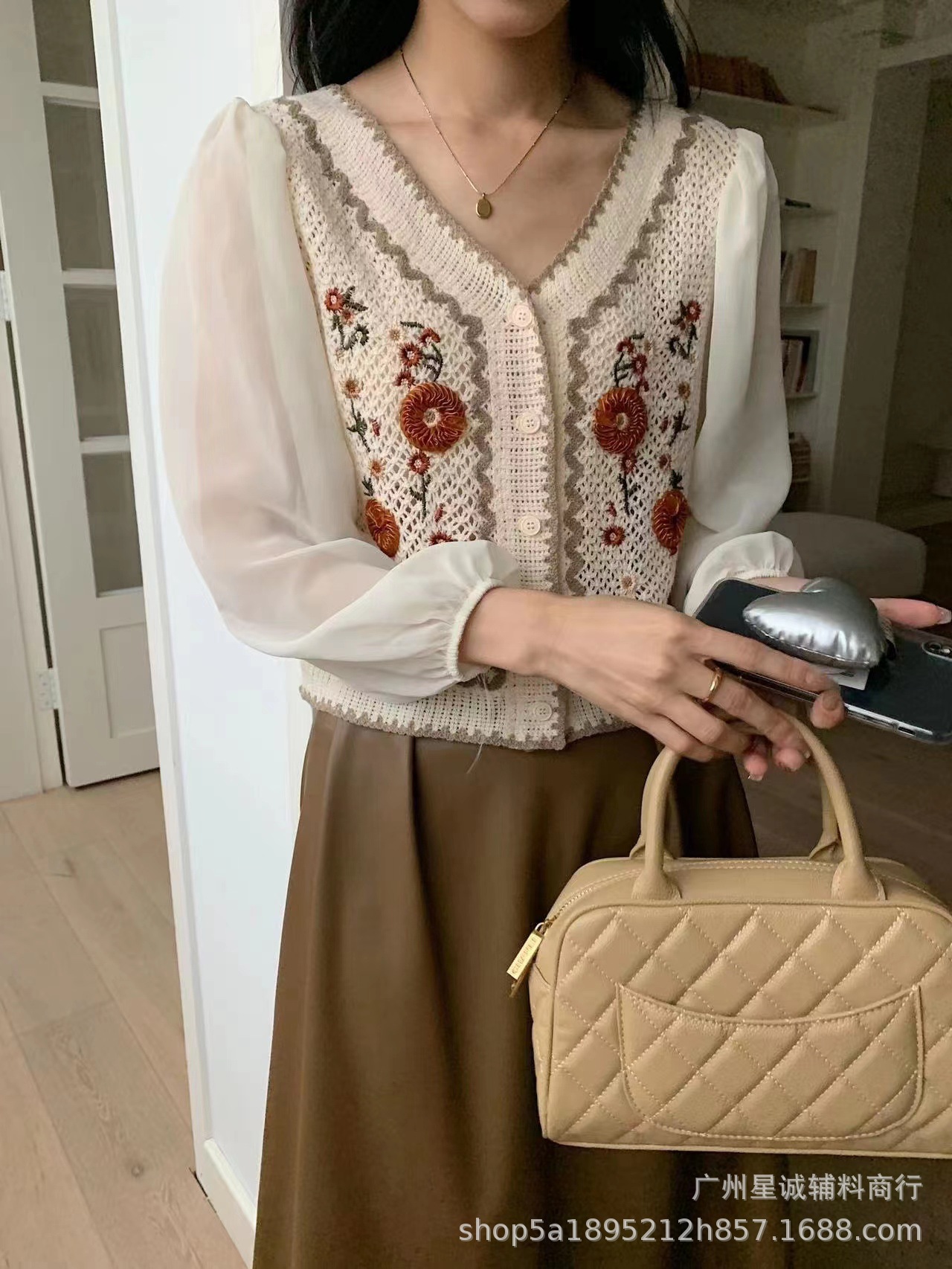 가짜 투피스 스티칭 자수 니트 카디건 여성 봄 2023 새로운 프랑스 스타일 부드러운 스타일 고급 쉬폰 슬리브 탑스토어 가기