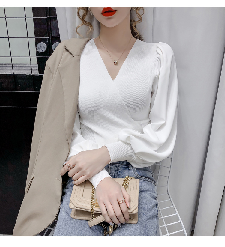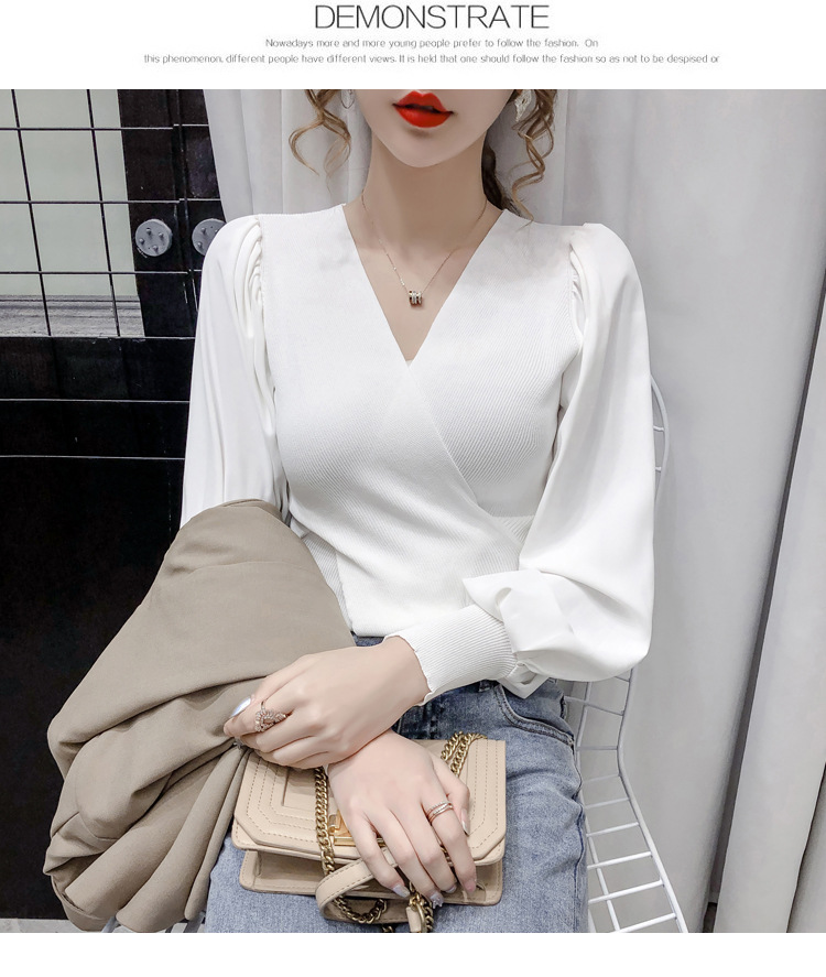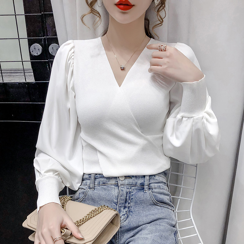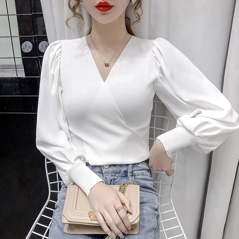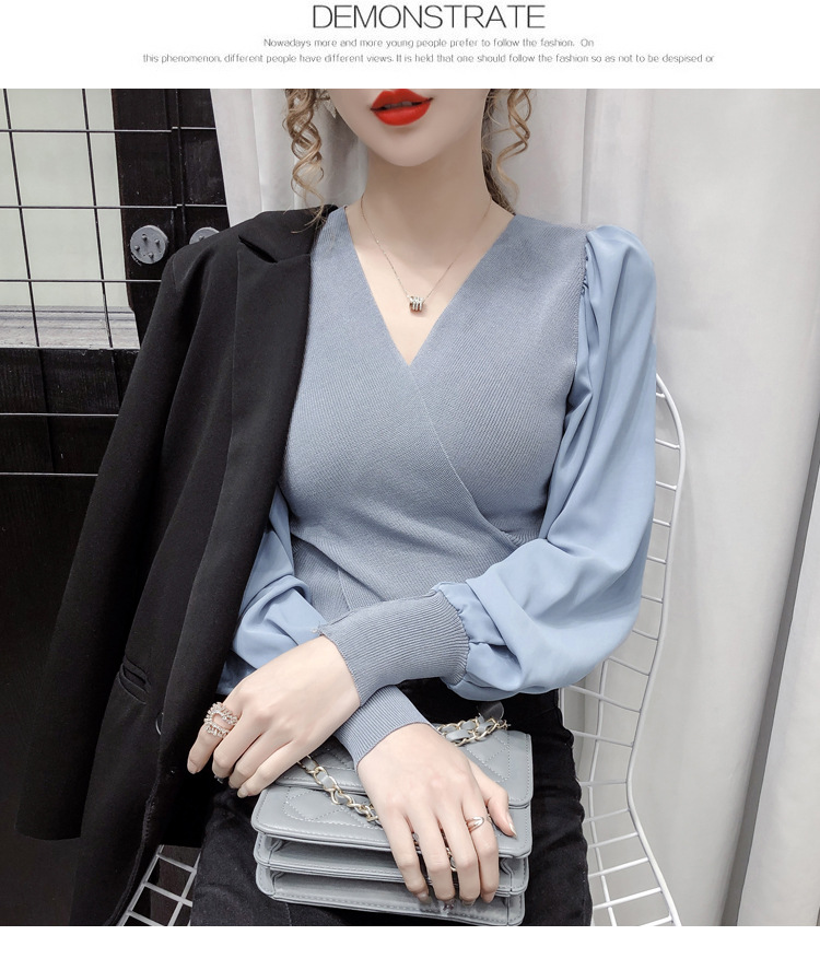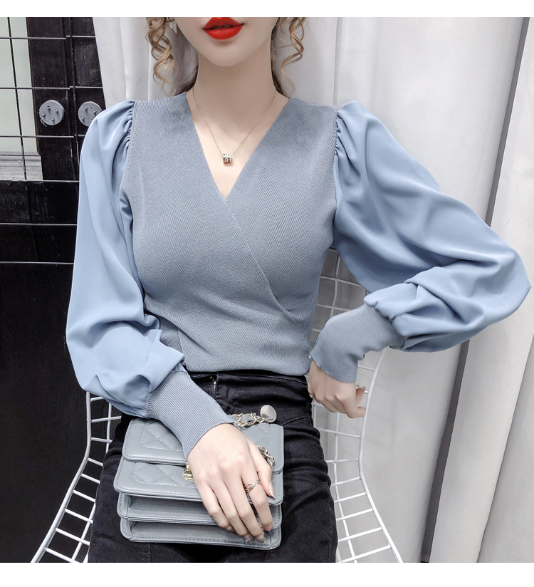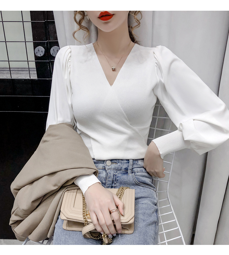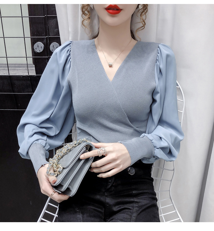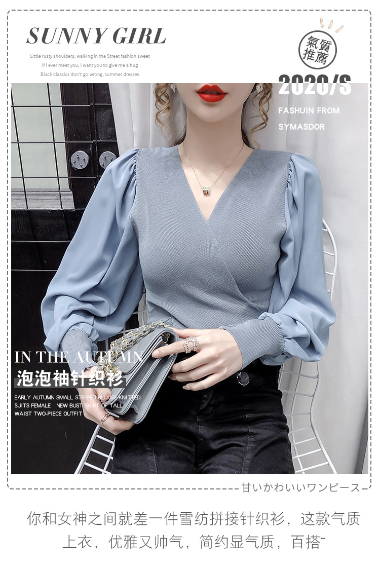 버블 슬리브 쉬폰 스티칭 니트웨어 여성용 2023 가을 한국 스타일 우아한 탑 패션 슬림핏 브이넥 베이스 셔츠스토어 가기