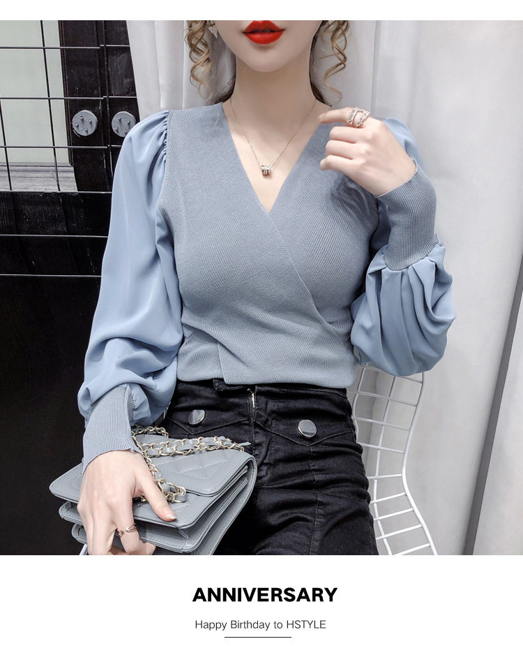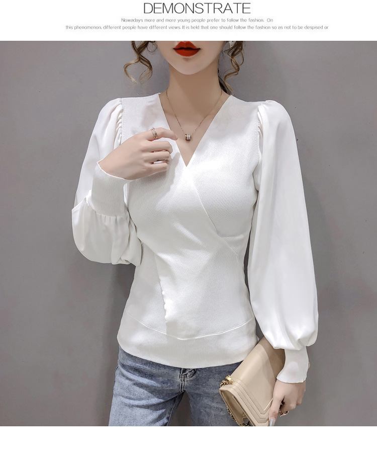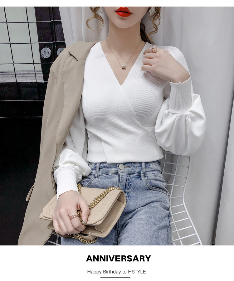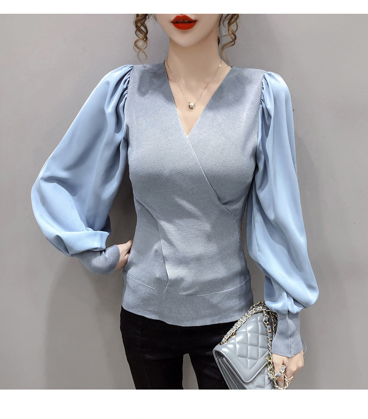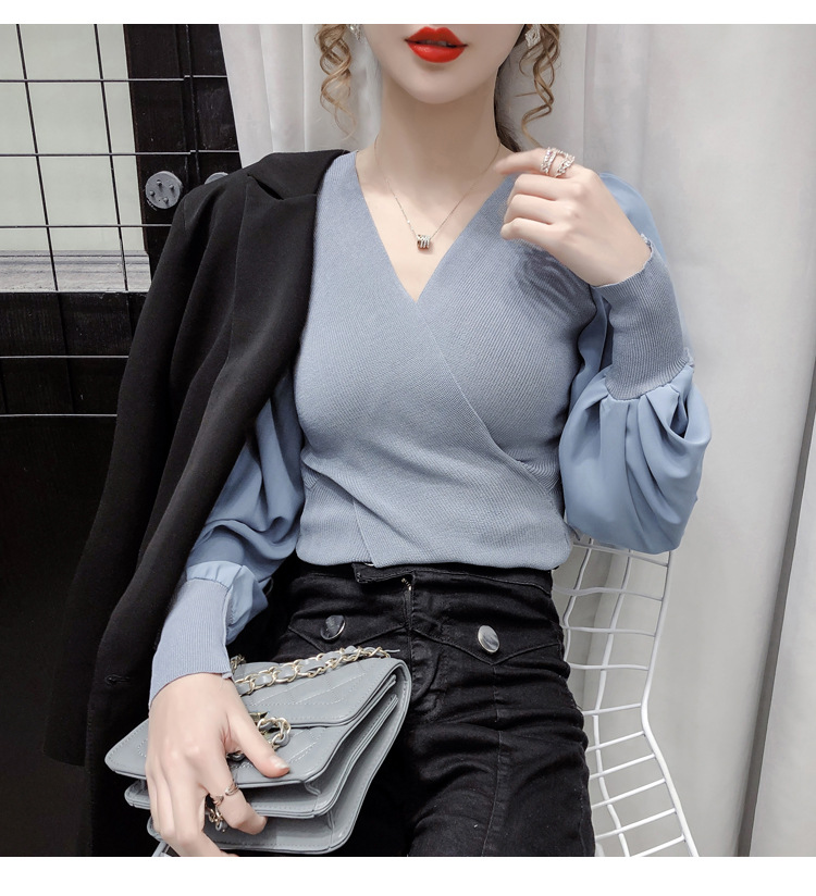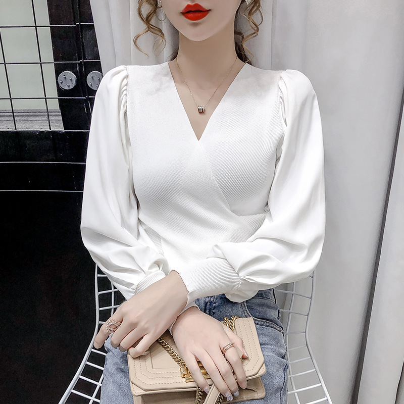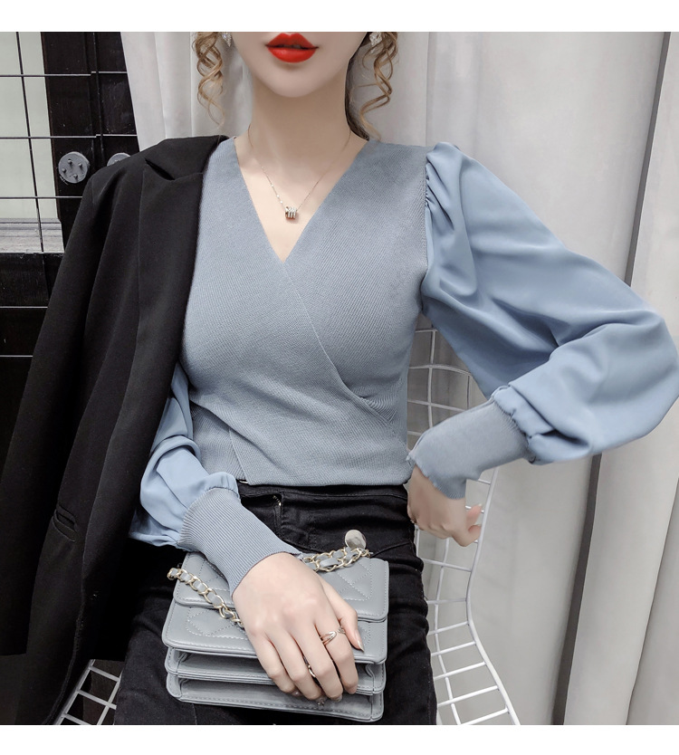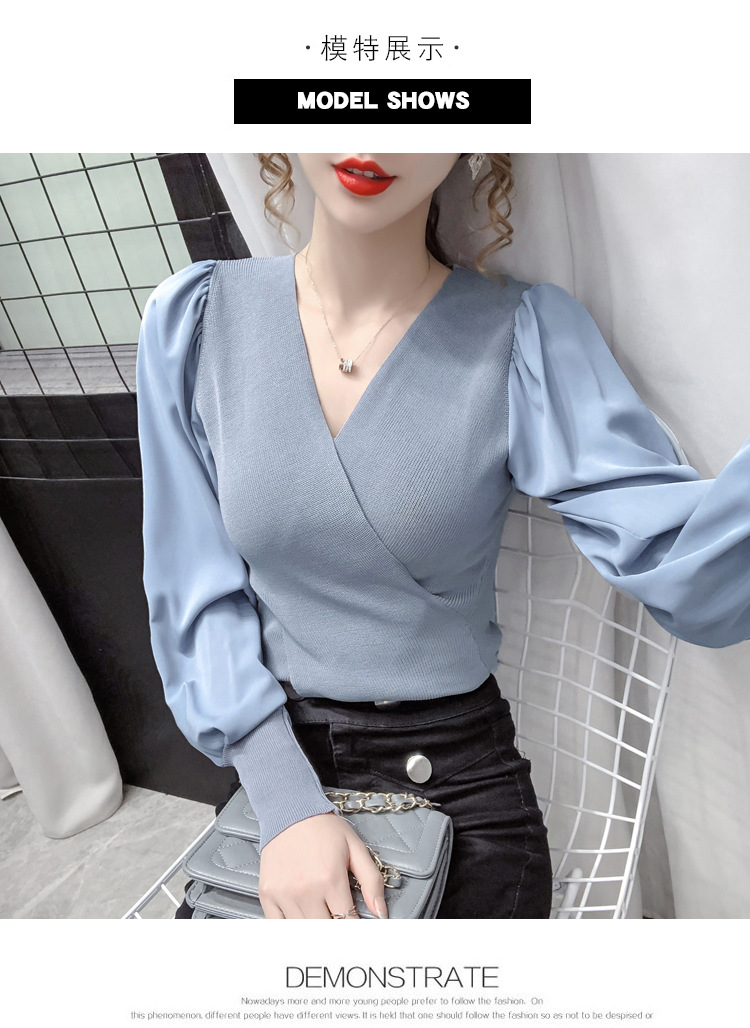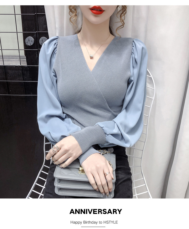 버블 슬리브 쉬폰 스티칭 니트웨어 여성용 2023 가을 한국 스타일 우아한 탑 패션 슬림핏 브이넥 베이스 셔츠스토어 가기