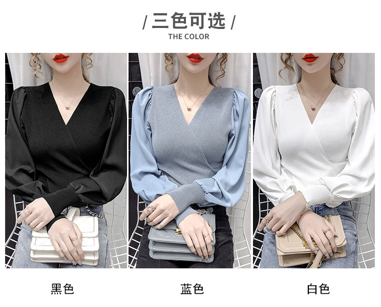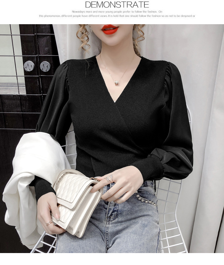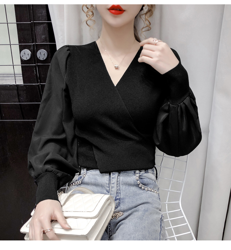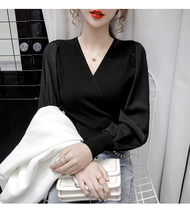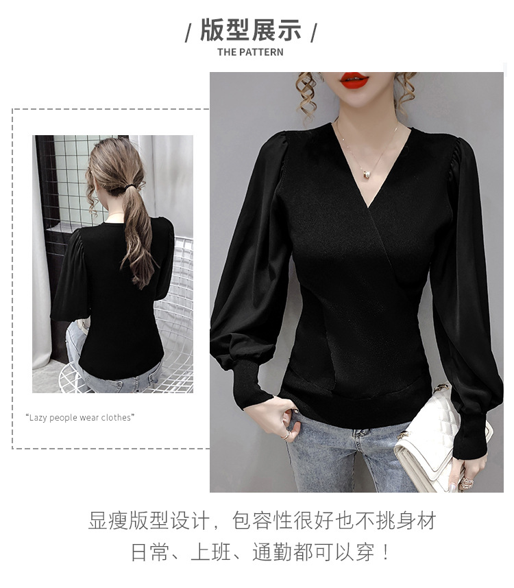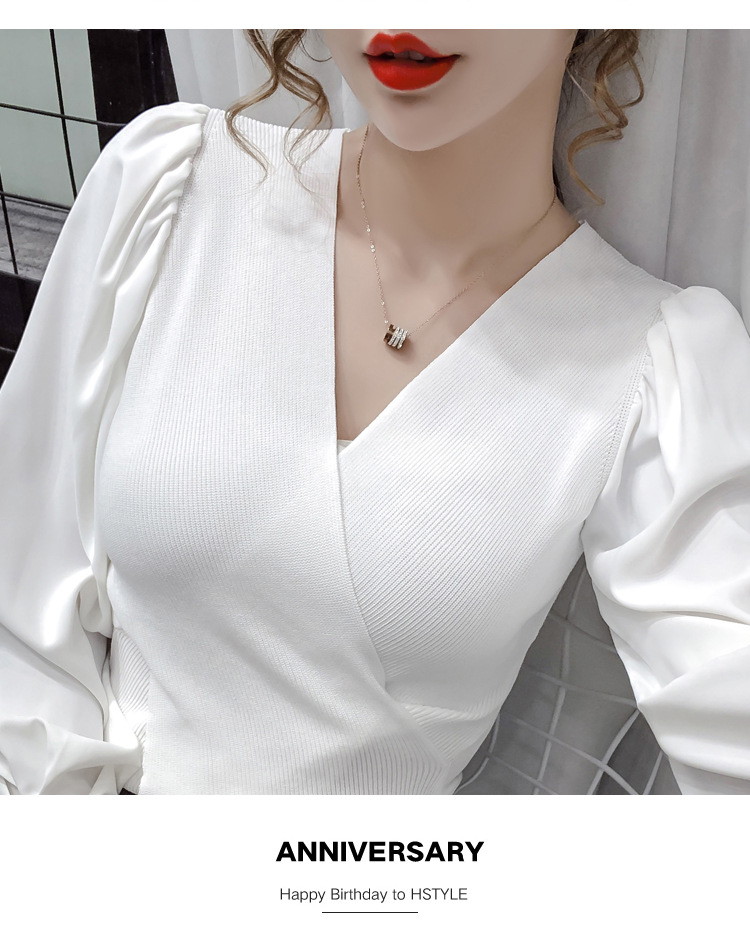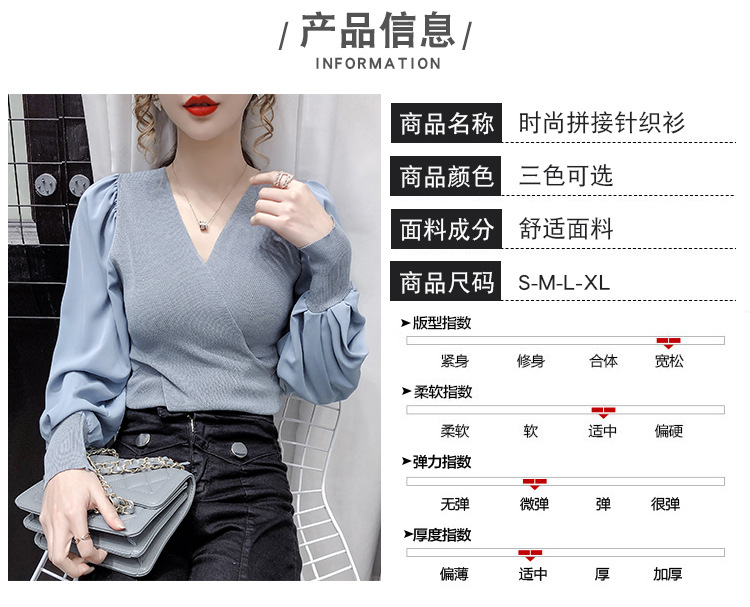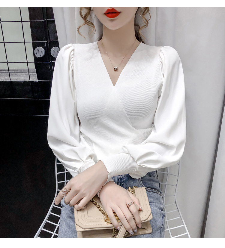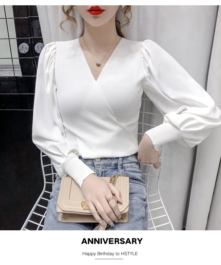 버블 슬리브 쉬폰 스티칭 니트웨어 여성용 2023 가을 한국 스타일 우아한 탑 패션 슬림핏 브이넥 베이스 셔츠스토어 가기