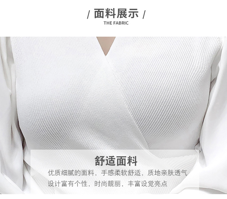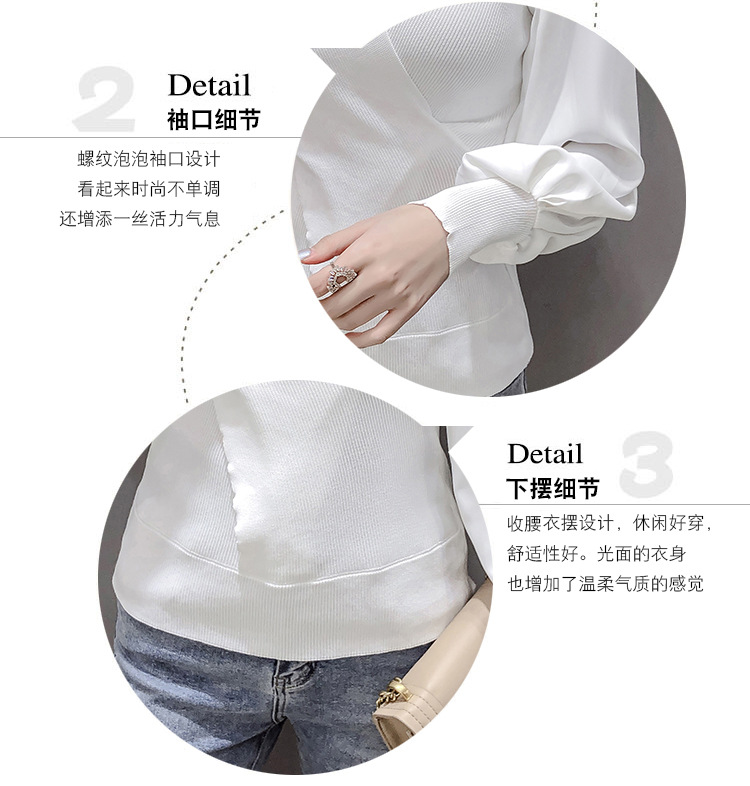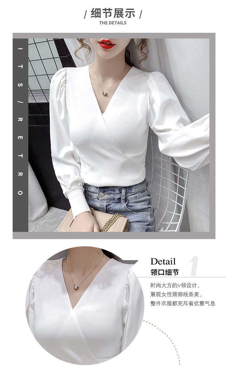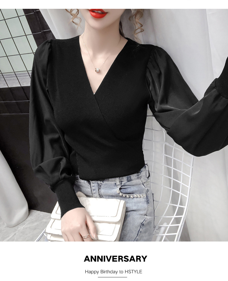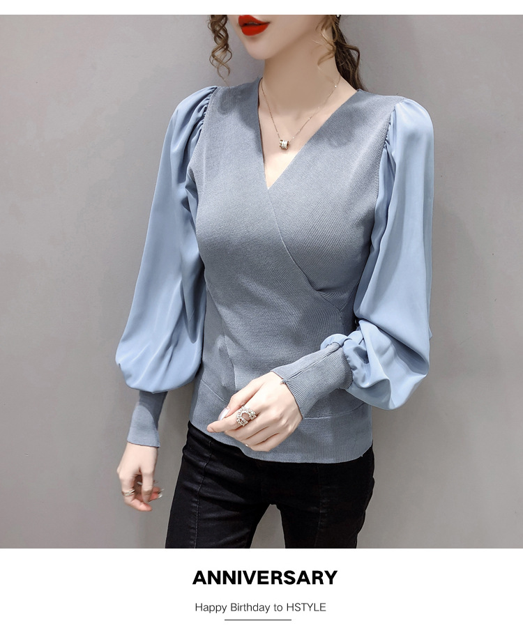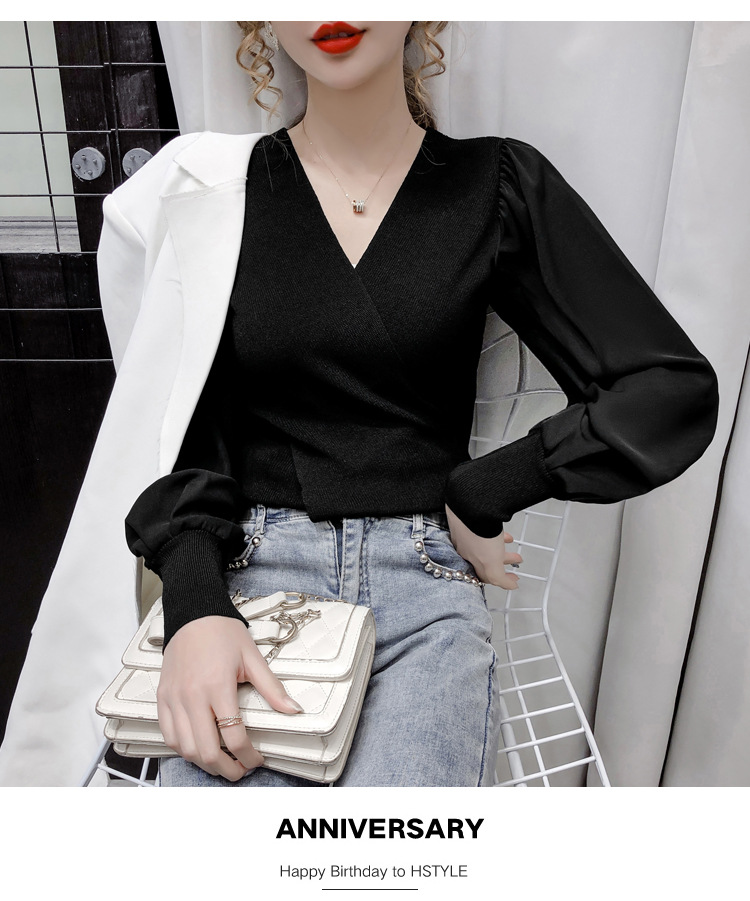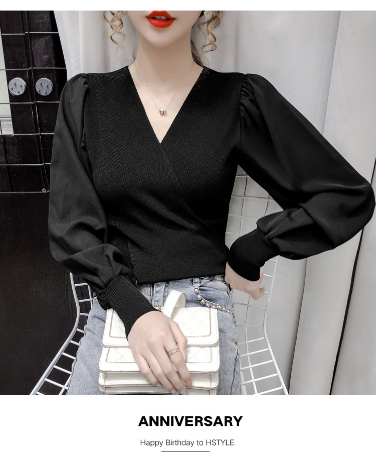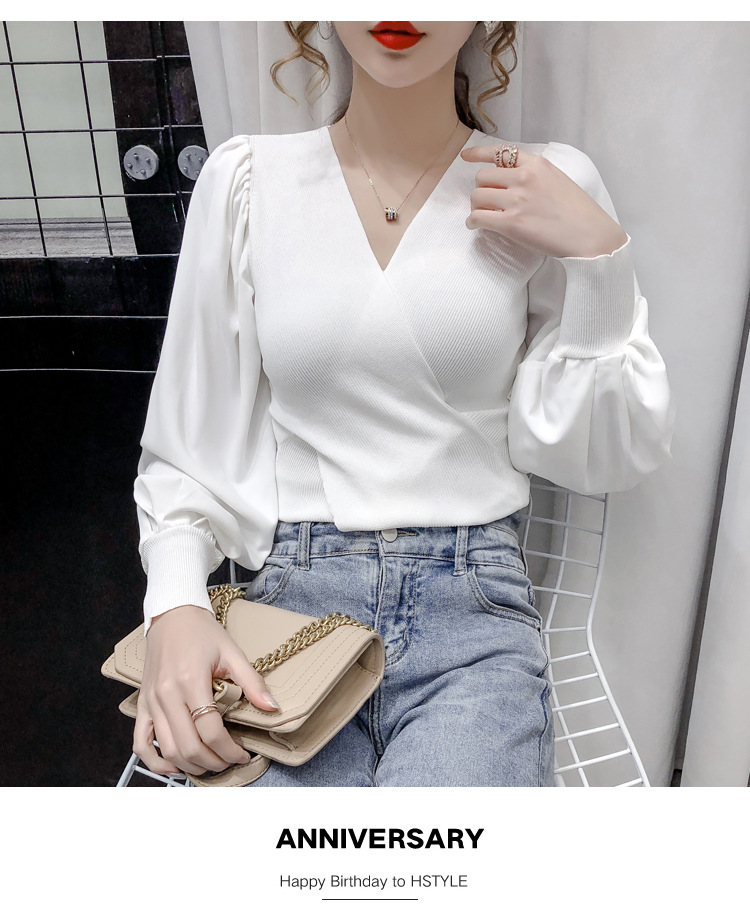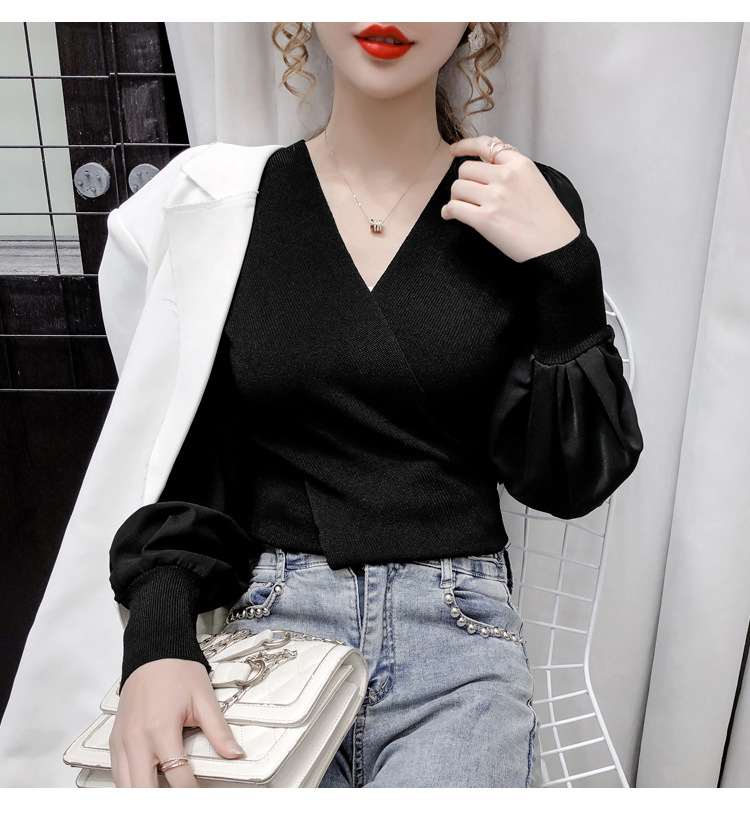 버블 슬리브 쉬폰 스티칭 니트웨어 여성용 2023 가을 한국 스타일 우아한 탑 패션 슬림핏 브이넥 베이스 셔츠스토어 가기