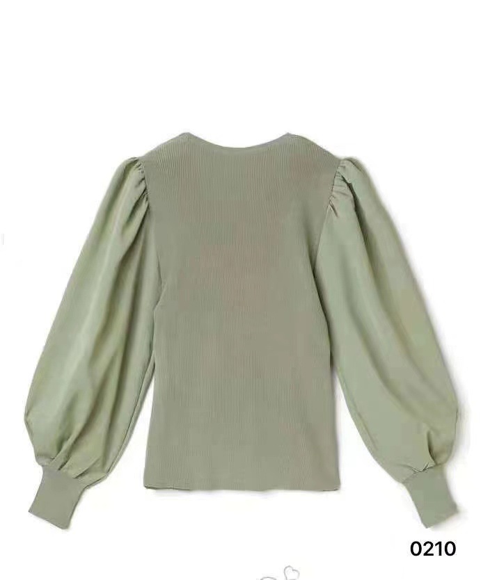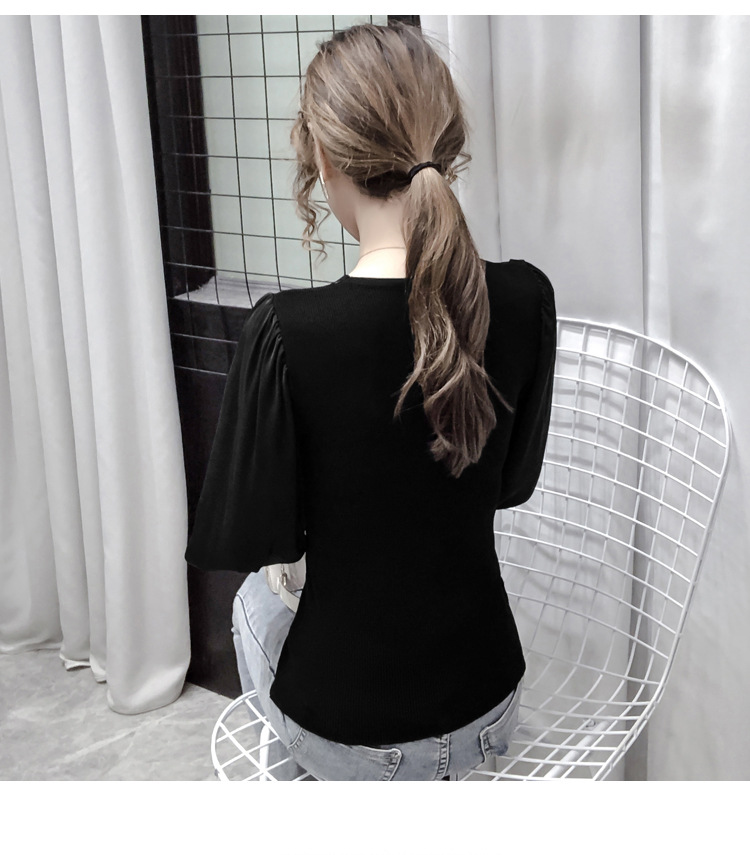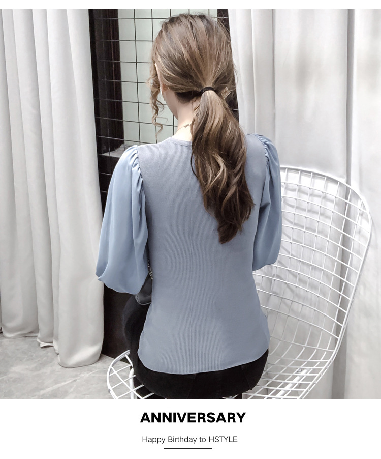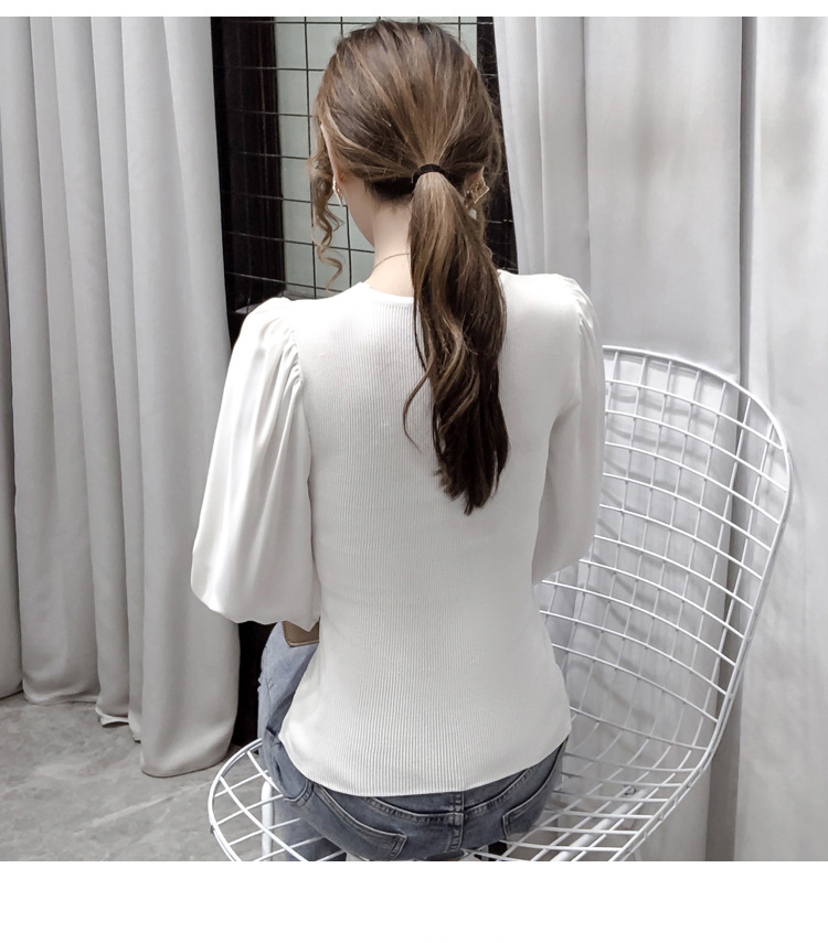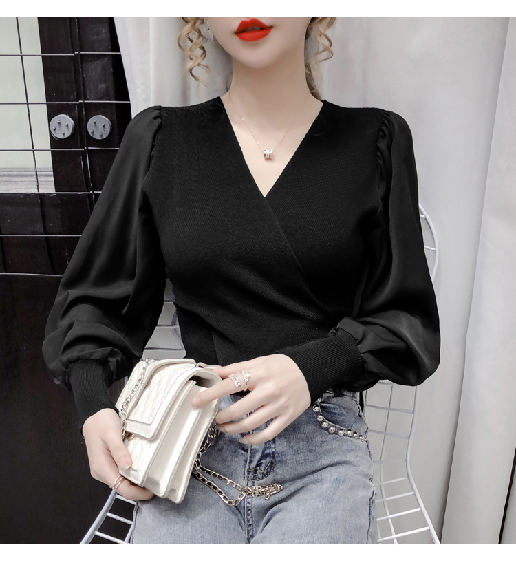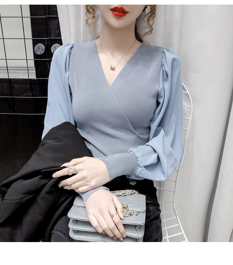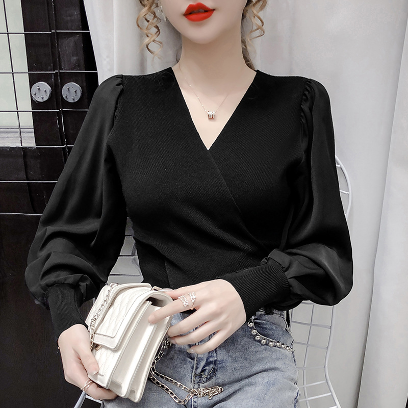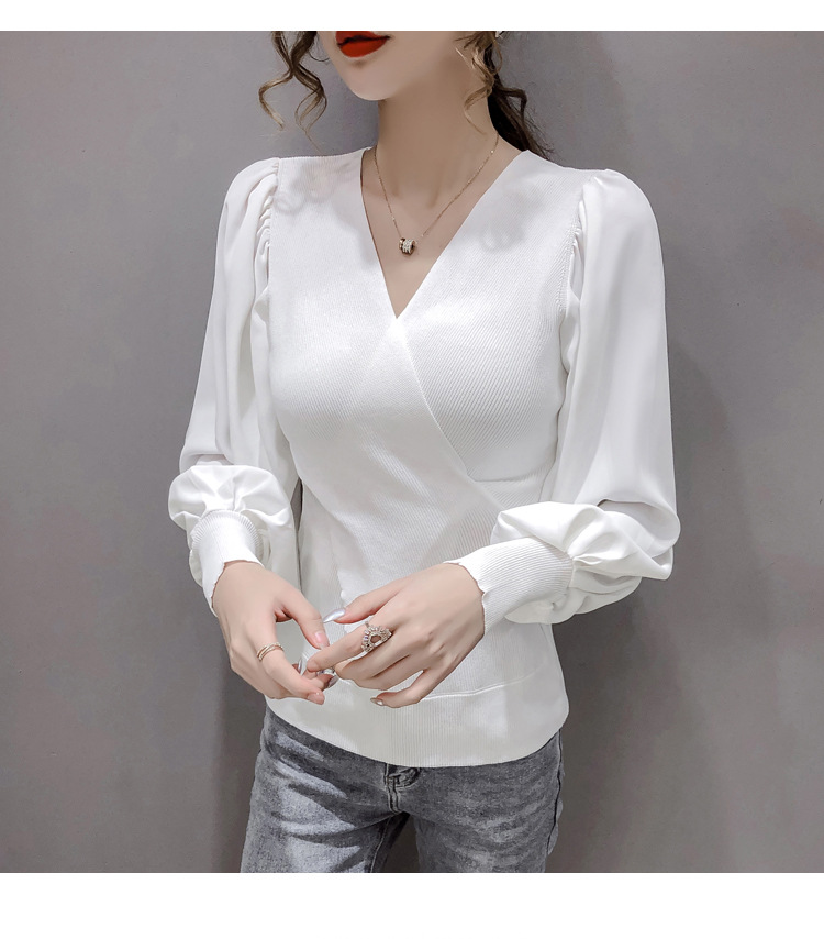버블 슬리브 쉬폰 스티칭 니트웨어 여성용 2023 가을 한국 스타일 우아한 탑 패션 슬림핏 브이넥 베이스 셔츠