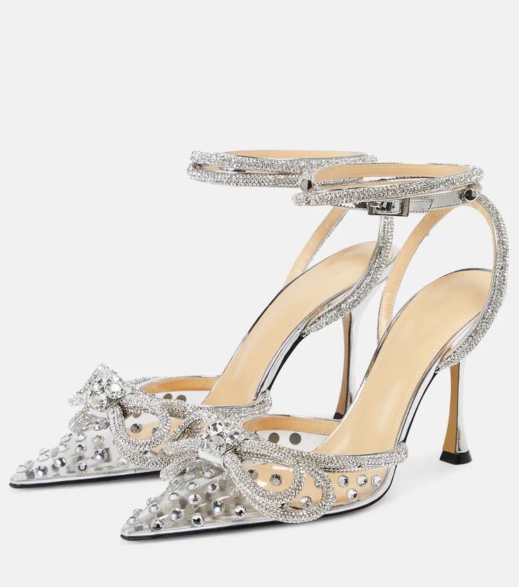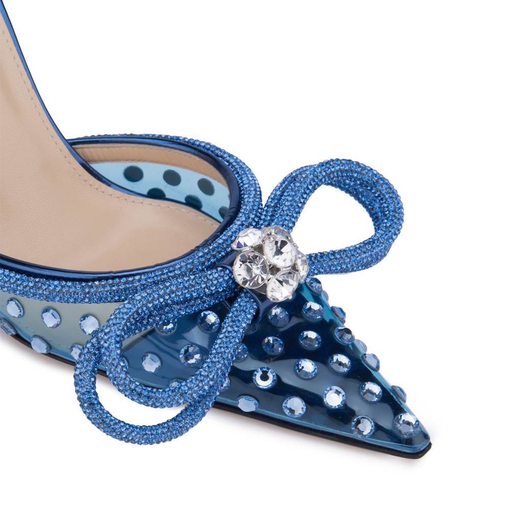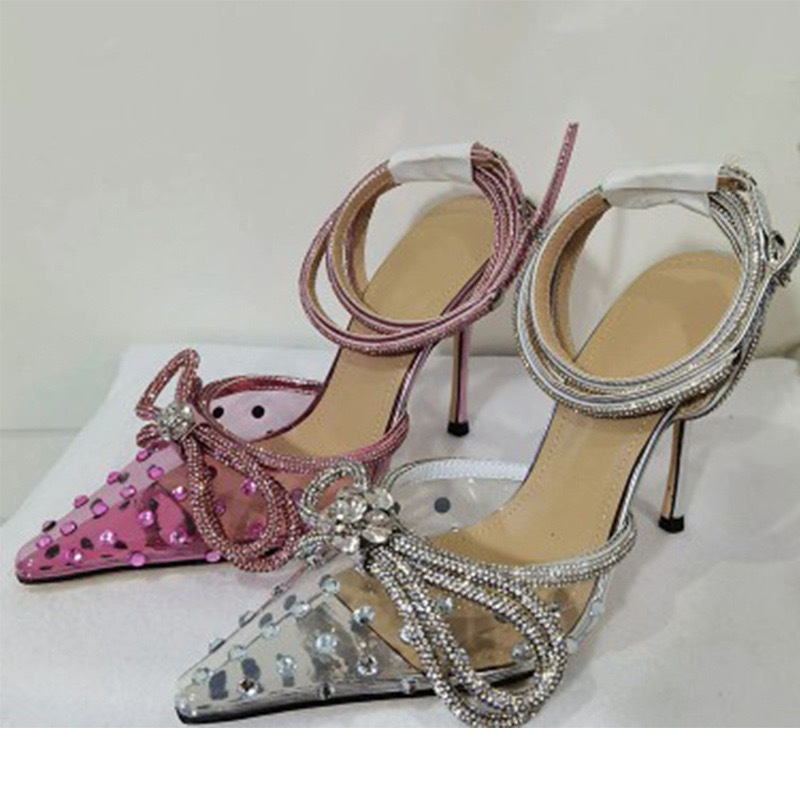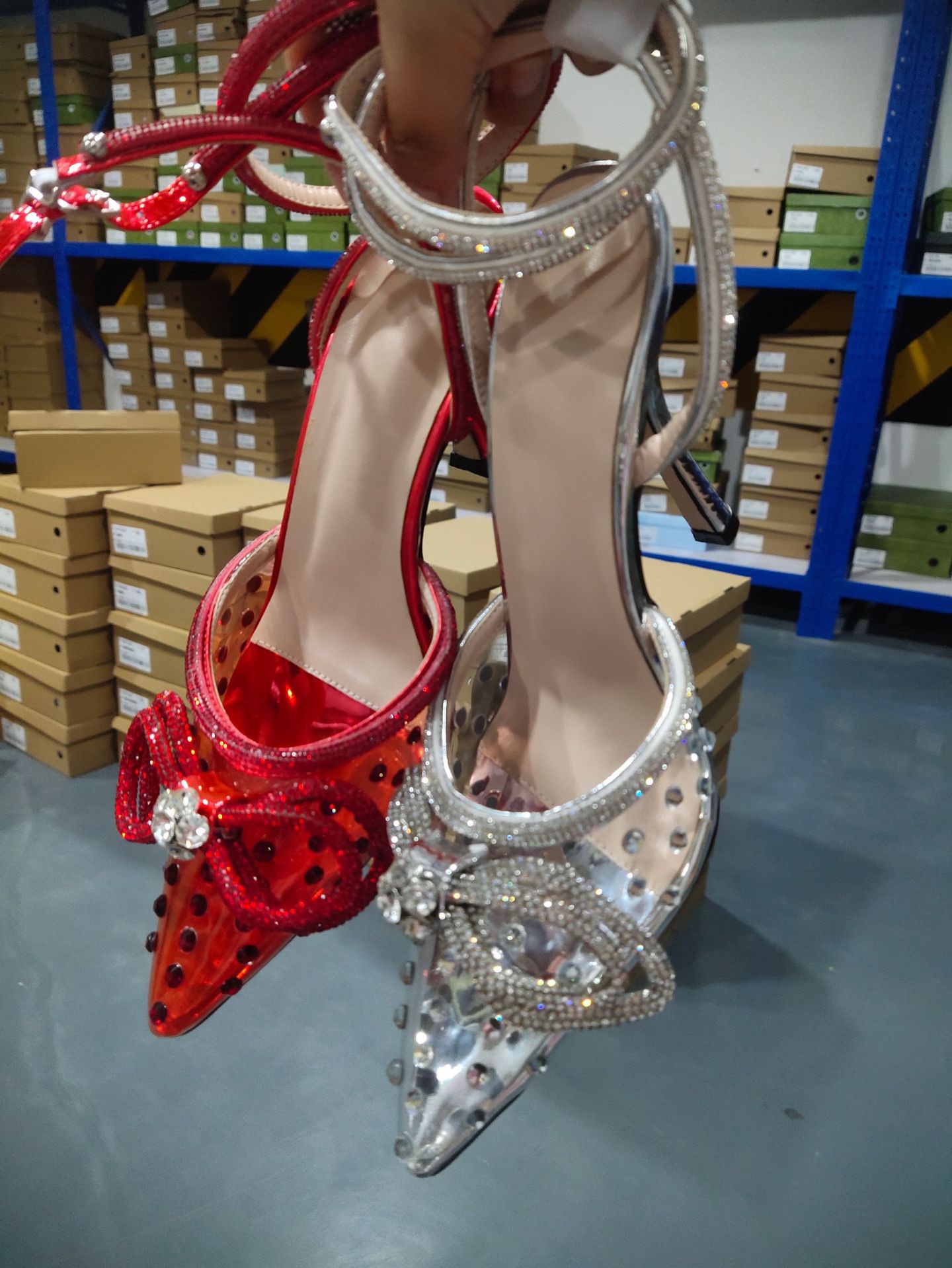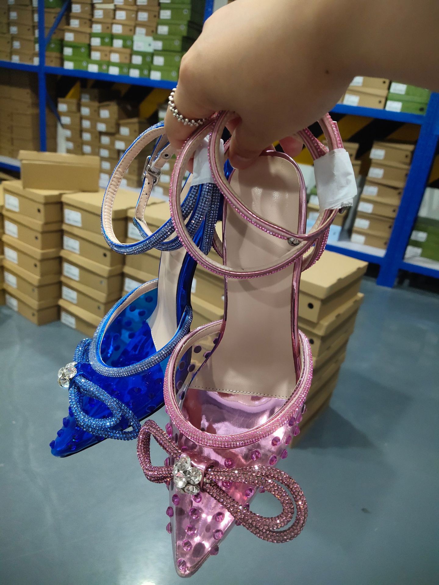 유럽과 미국의 대외 무역 스타일 리본 장식과 워터드롭스톤 하이힐, 반짝이 장식의 뾰족한 앞코, 속이 빈 스트랩 샌들, 여성용 크리스탈 슈즈