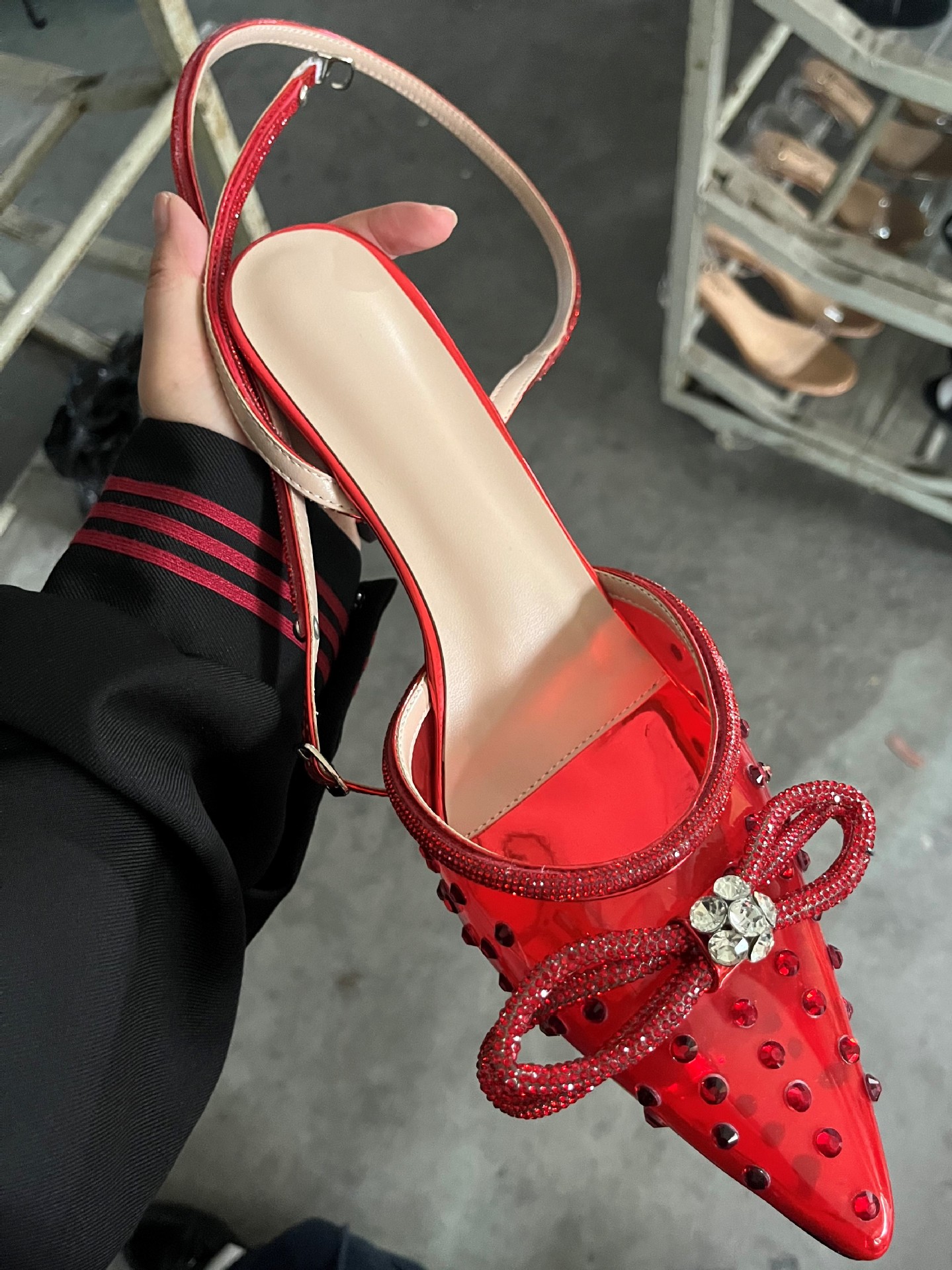 유럽과 미국의 대외 무역 스타일 리본 장식과 워터드롭스톤 하이힐, 반짝이 장식의 뾰족한 앞코, 속이 빈 스트랩 샌들, 여성용 크리스탈 슈즈스토어 가기