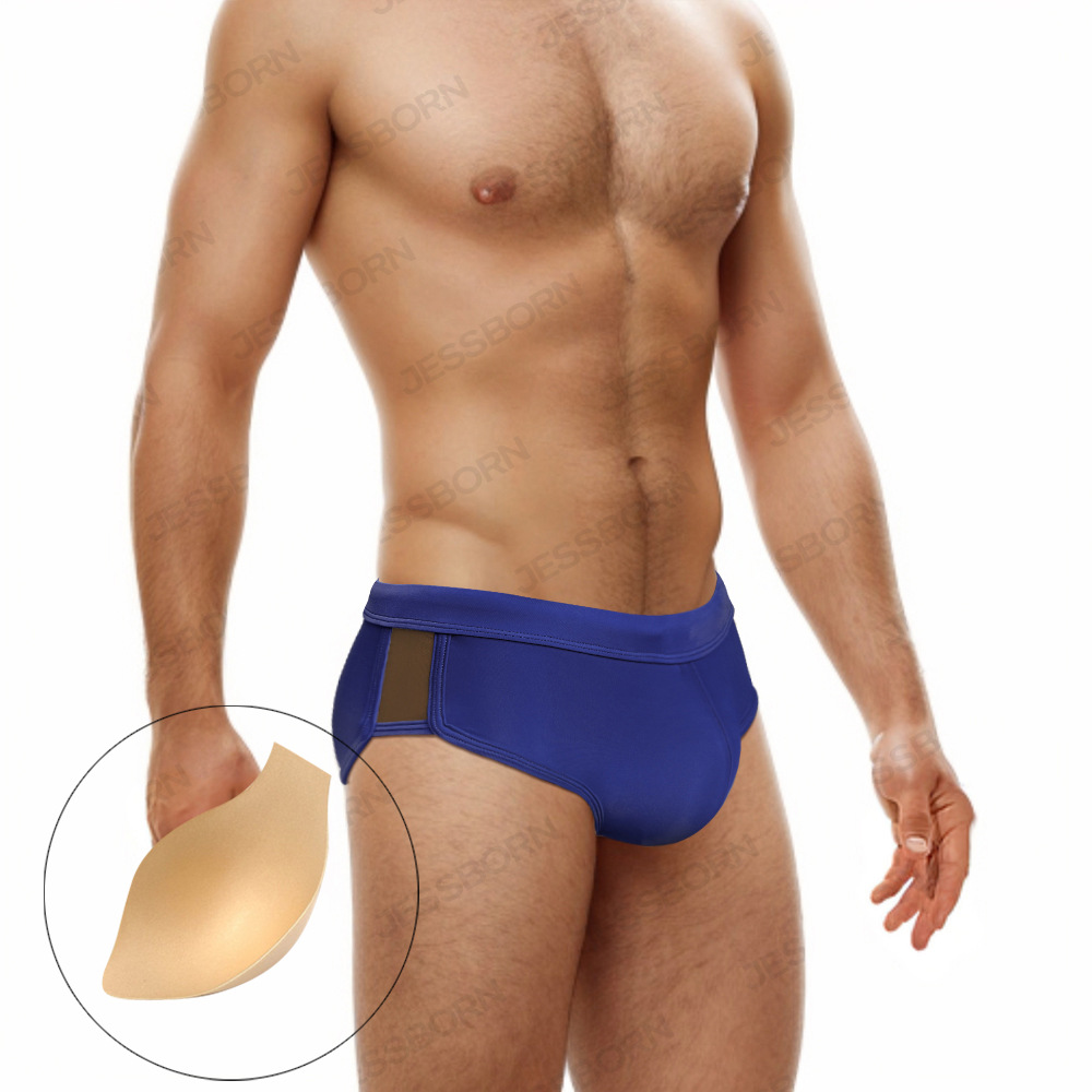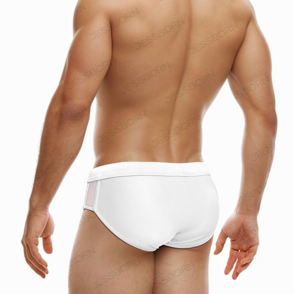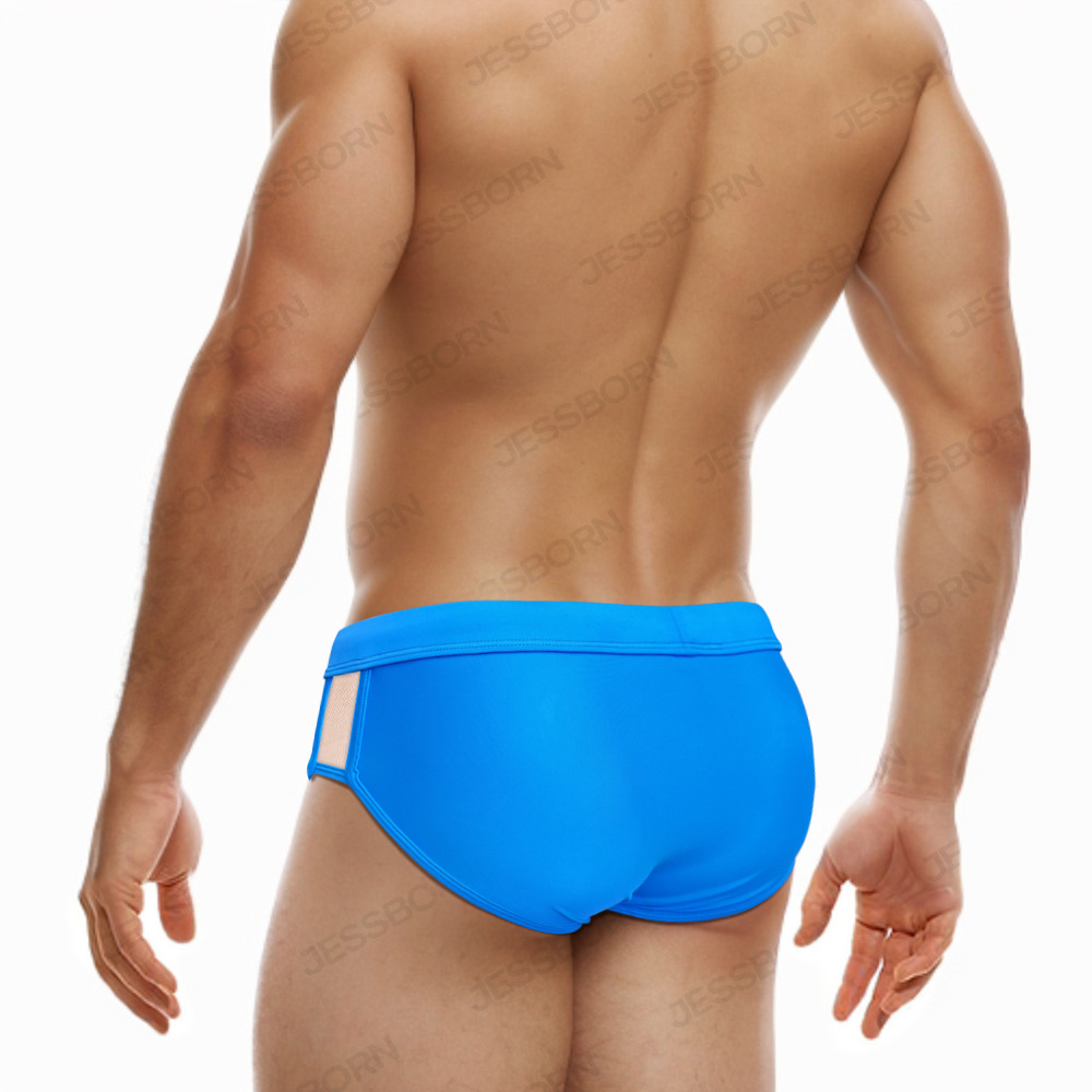 JESSBORN带罩杯男士三角泳裤两侧网纱性感低腰游泳裤欧美跨境泳装