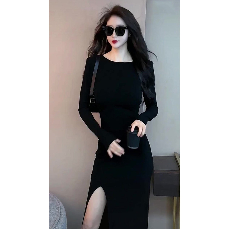 봄과 가을 새로운 프랑스 패션 섹시한 엉덩이 여성의 스커트 슬림핏 블랙베이스 스플릿 로마 긴팔 원피스스토어 가기