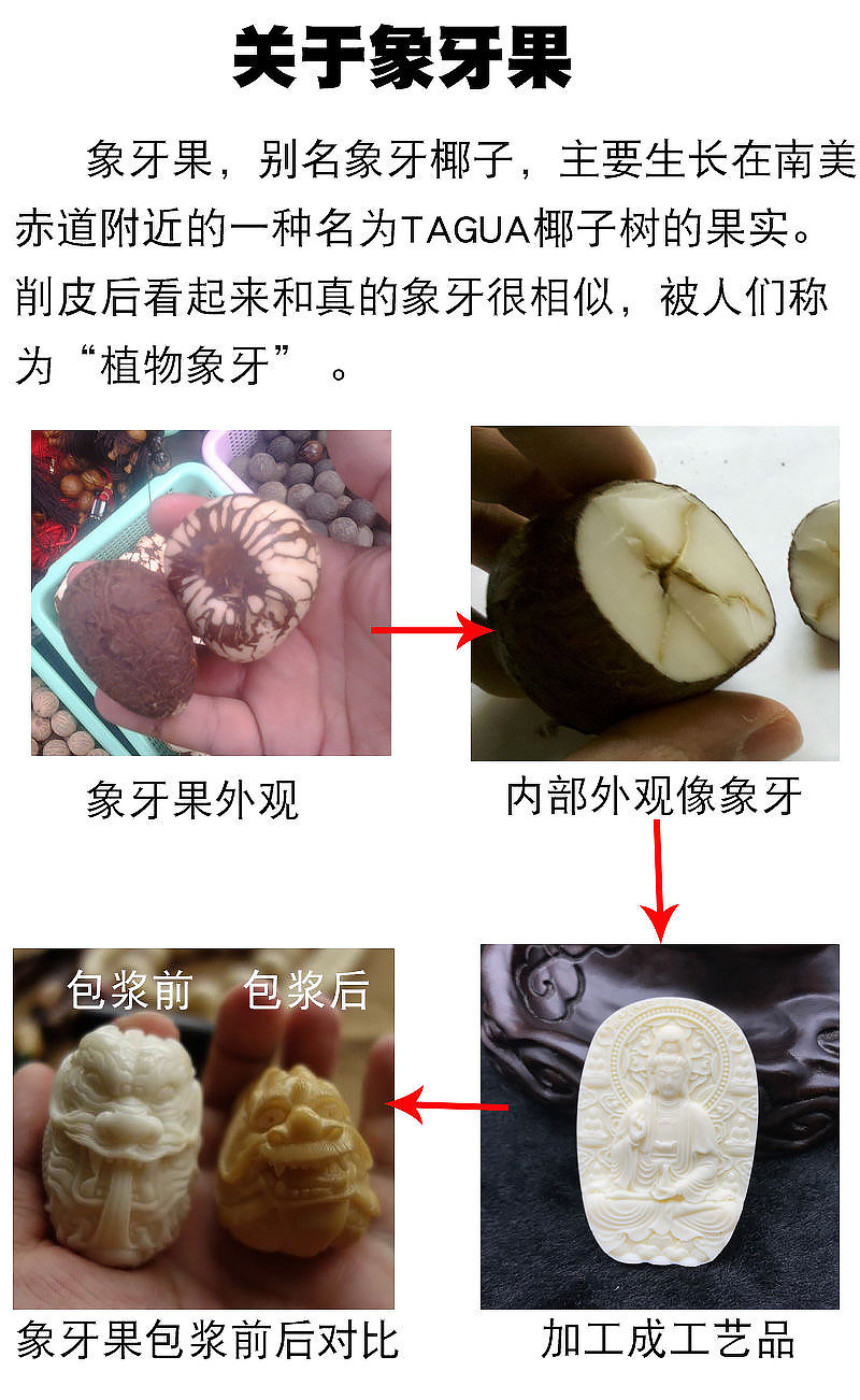 【简介】象牙果是一种南美洲的棕榈树椰果。它具备了与动物象牙类似的特点,看起来和真的象牙一样,硬度同为1.5度,被人们称为植物象牙。此款手把件摆件工艺品为象牙果打成粉后压制而成,不是象牙果实去了皮直接雕刻而成的。