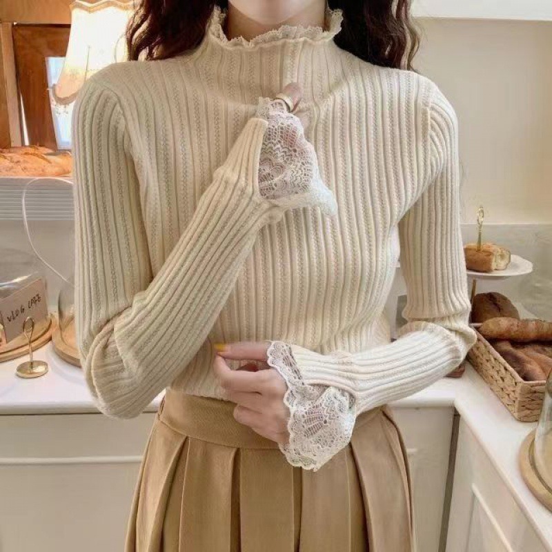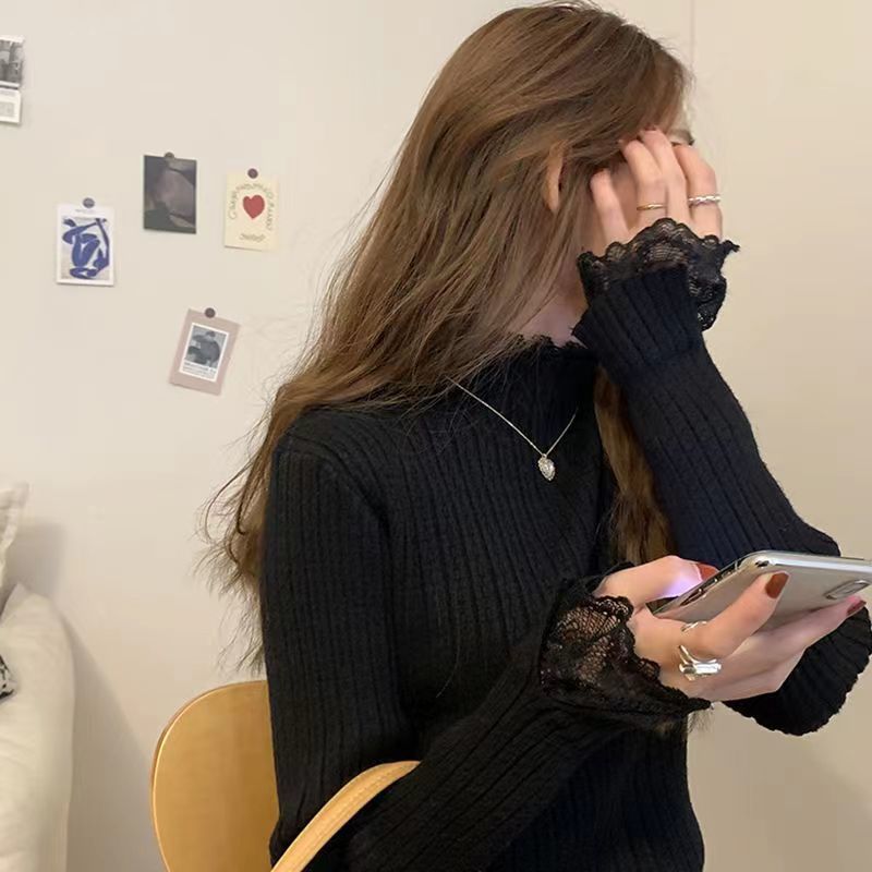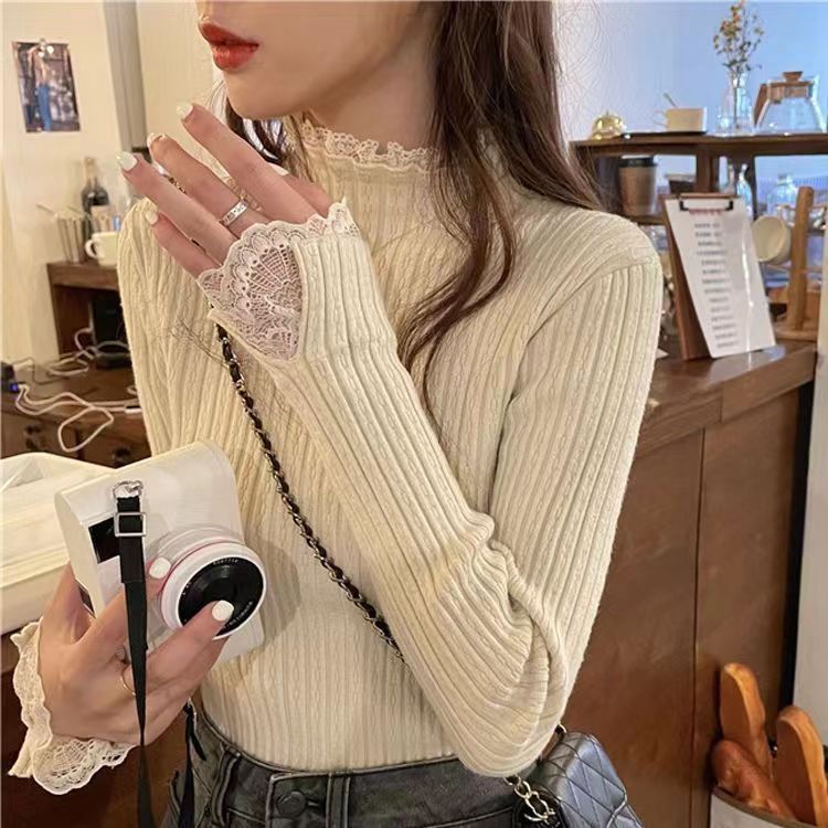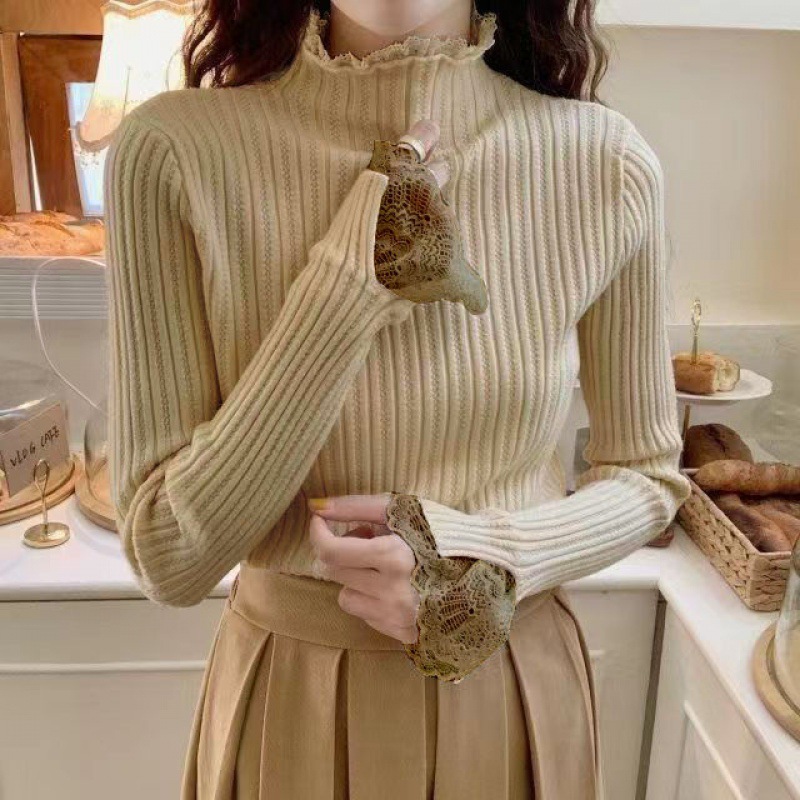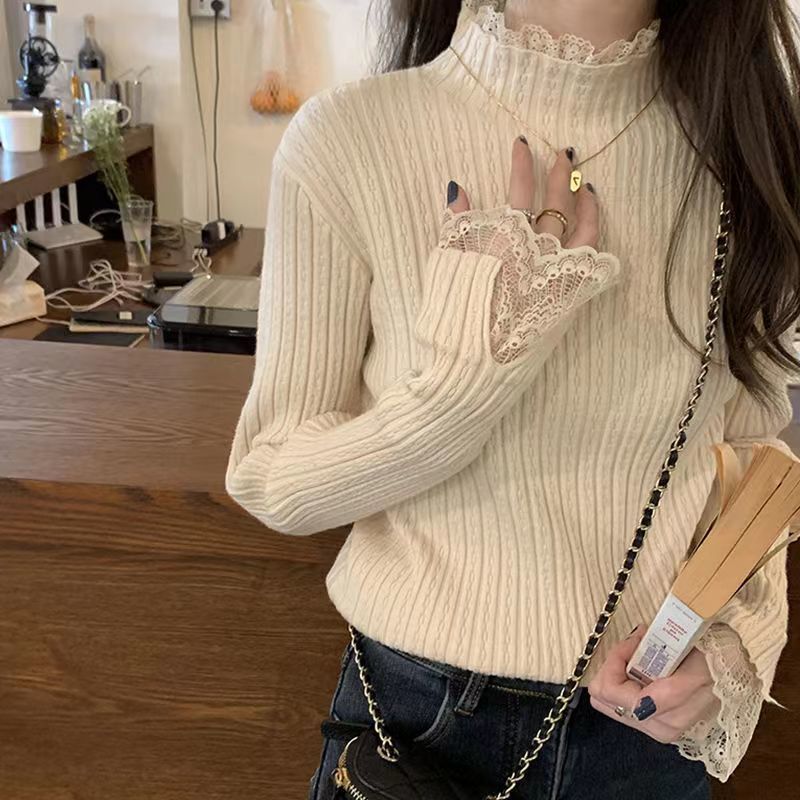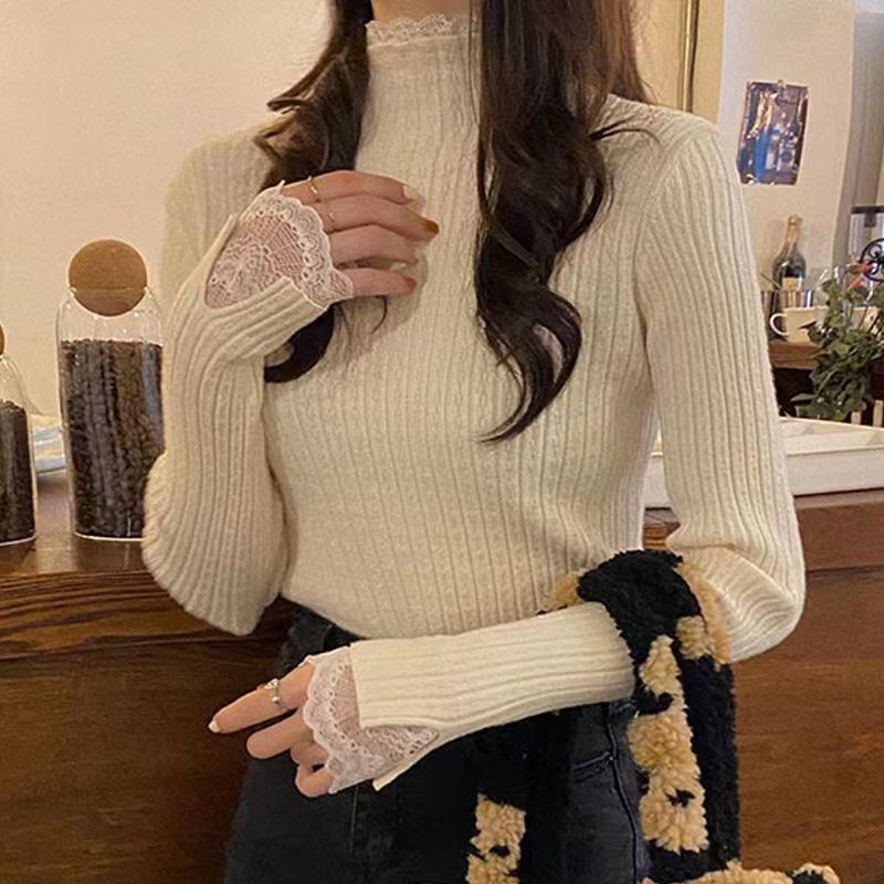 레이스 하프 하이 칼라 베이스 셔츠 여성용 가을/겨울 2023 인테리어 슬림핏 우아한 긴팔 스웨터 니트웨어