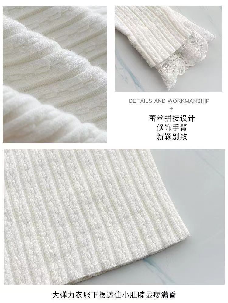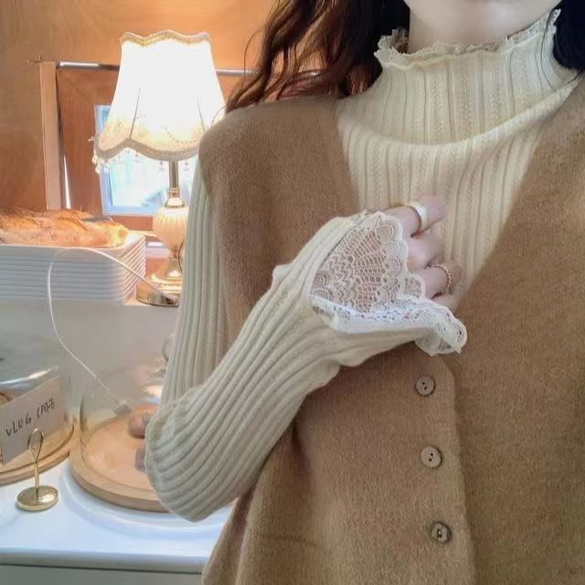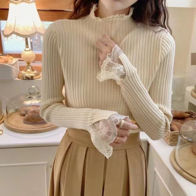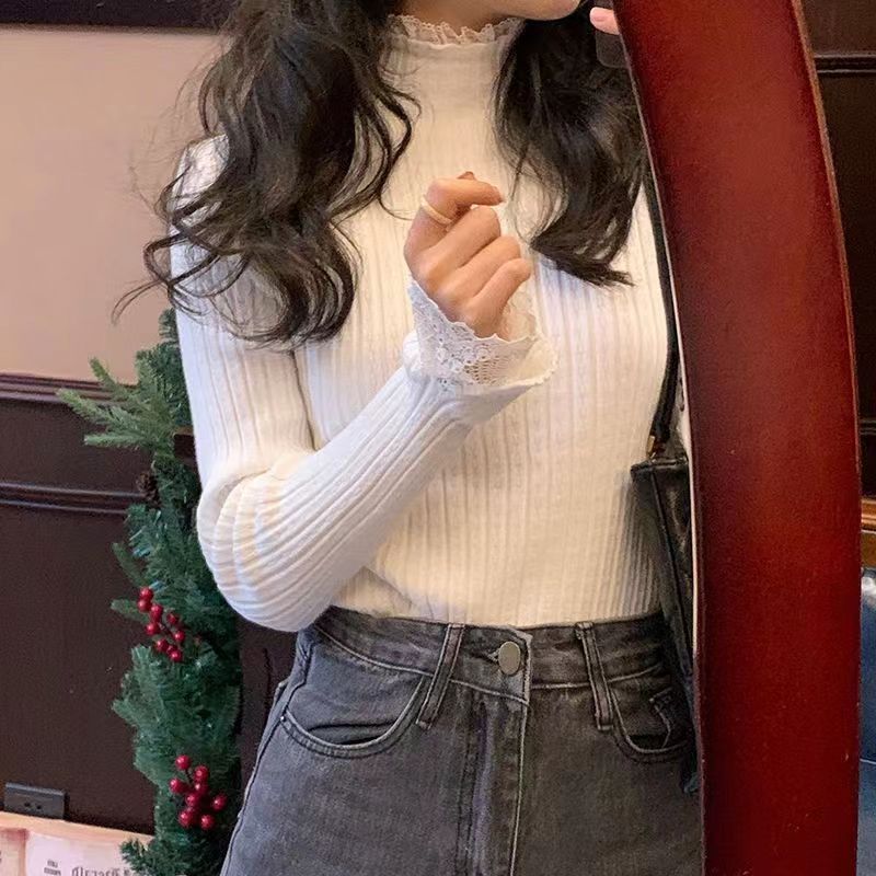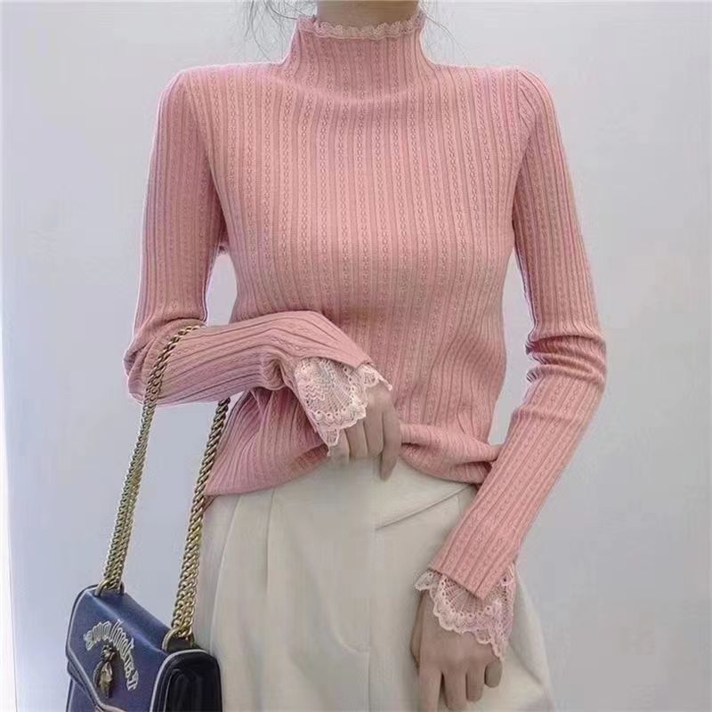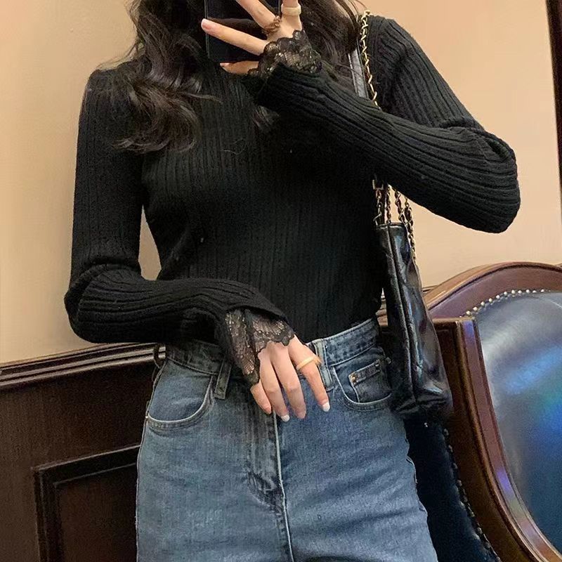 레이스 하프 하이 칼라 베이스 셔츠 여성용 가을/겨울 2023 인테리어 슬림핏 우아한 긴팔 스웨터 니트웨어