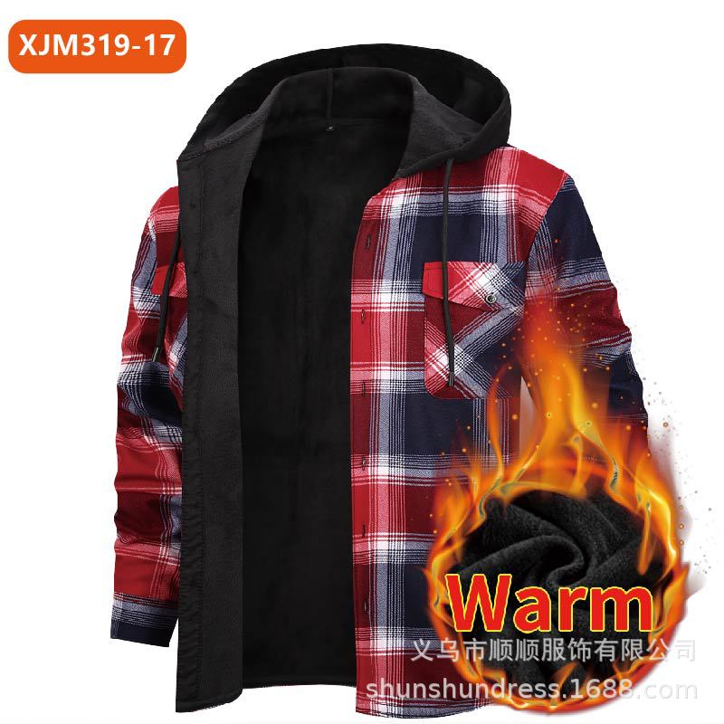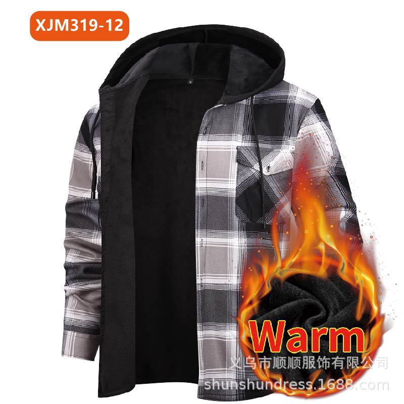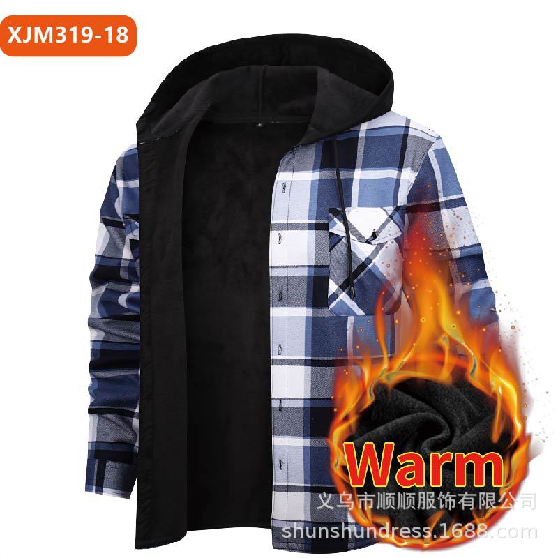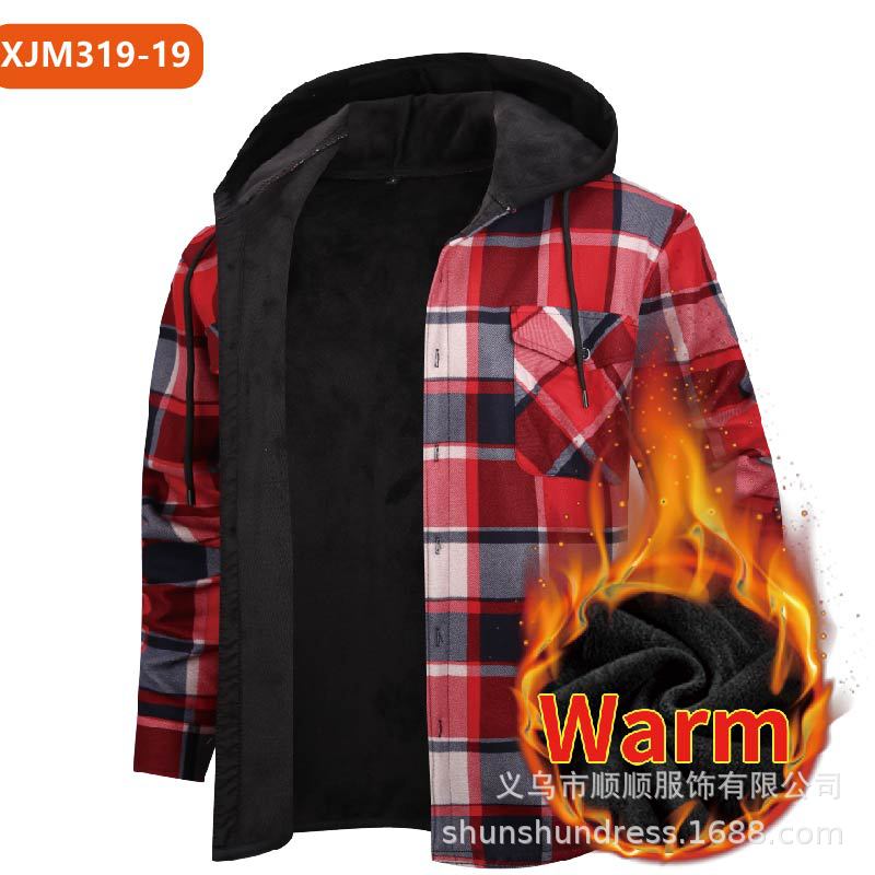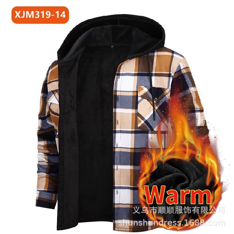 새로운 수출용 후드 남성 체크 셔츠, 방한 보온 기능, 플리스 안감, 두꺼운 긴팔 보온 셔츠, 큰 사이즈 남성복스토어 가기