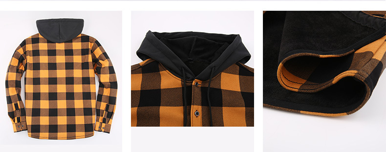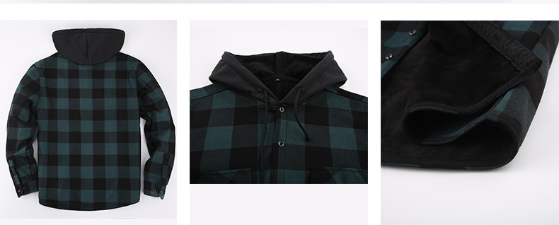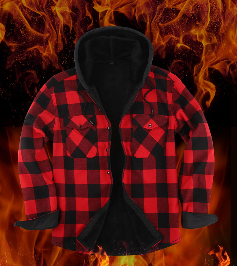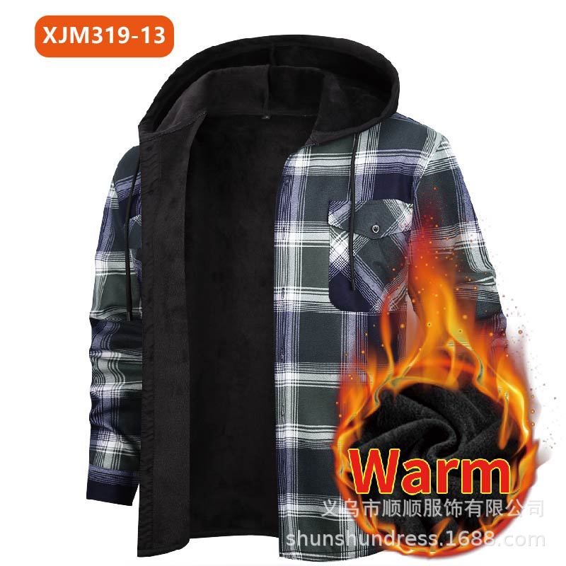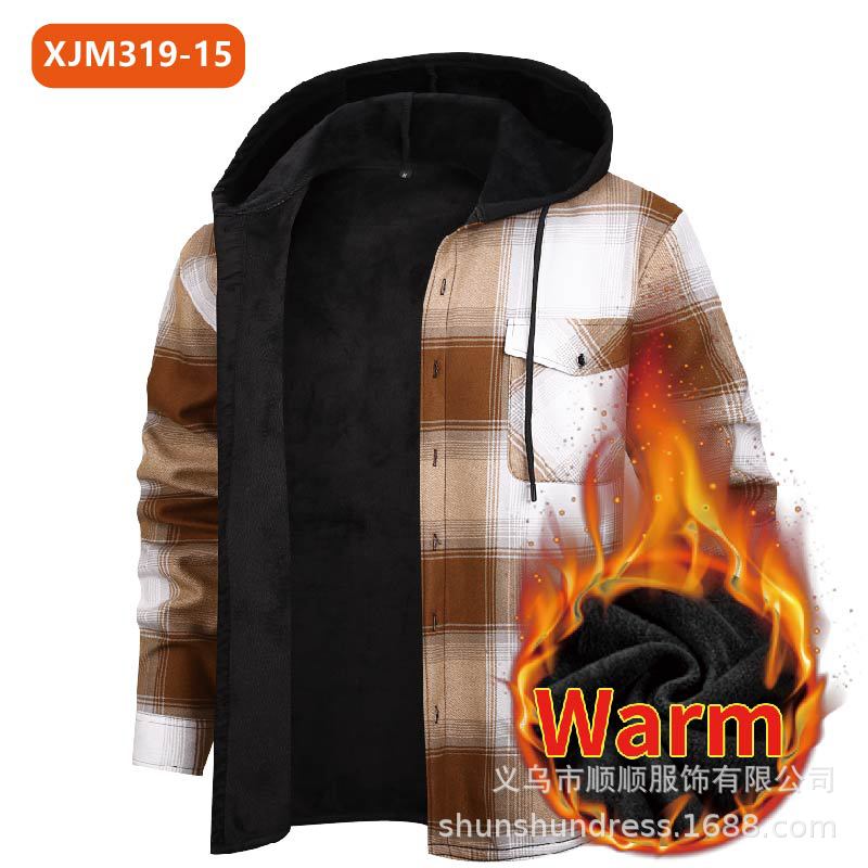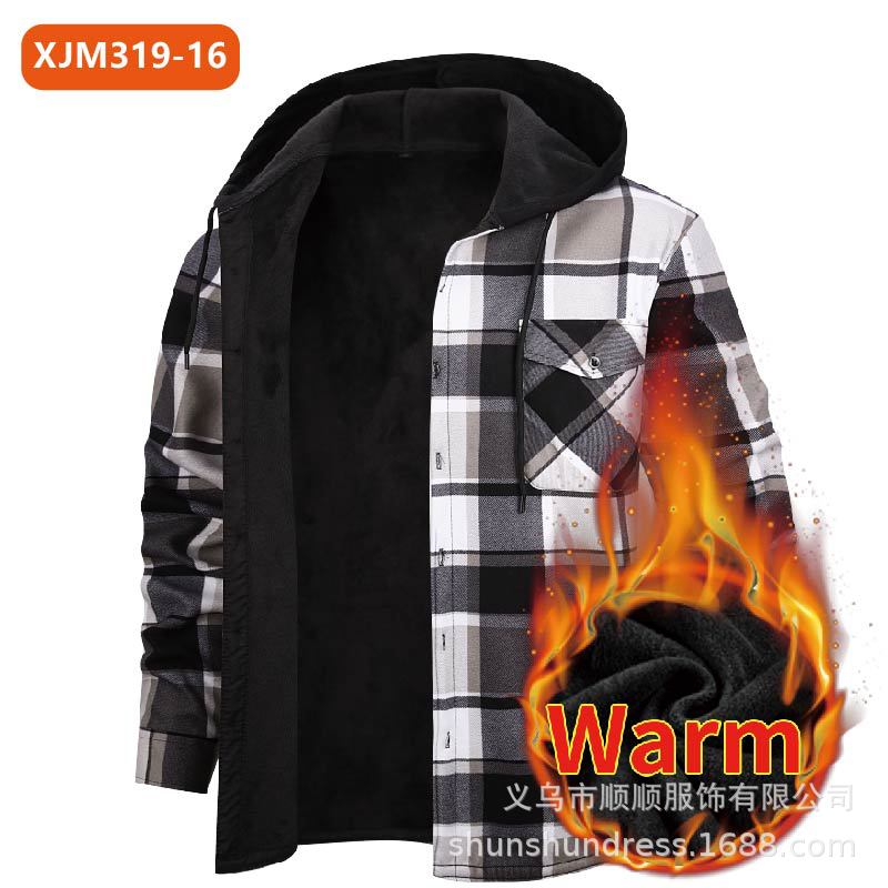 새로운 수출용 후드 남성 체크 셔츠, 방한 보온 기능, 플리스 안감, 두꺼운 긴팔 보온 셔츠, 큰 사이즈 남성복스토어 가기