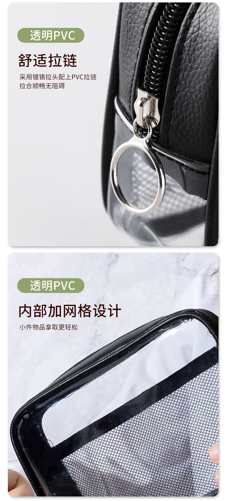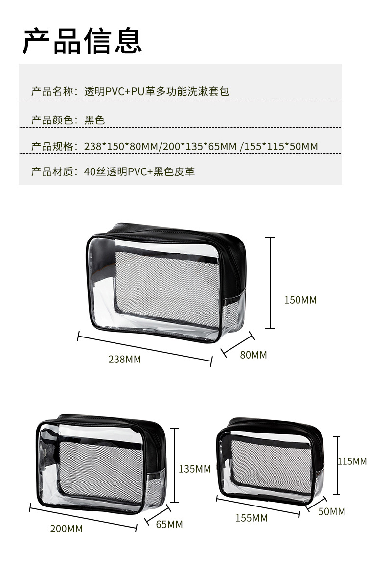 Pu 투명 3 피스 화장품 세면도구 가방 대용량 pvc 목욕 가방 블랙 휴대용 방수 여행 보관 가방