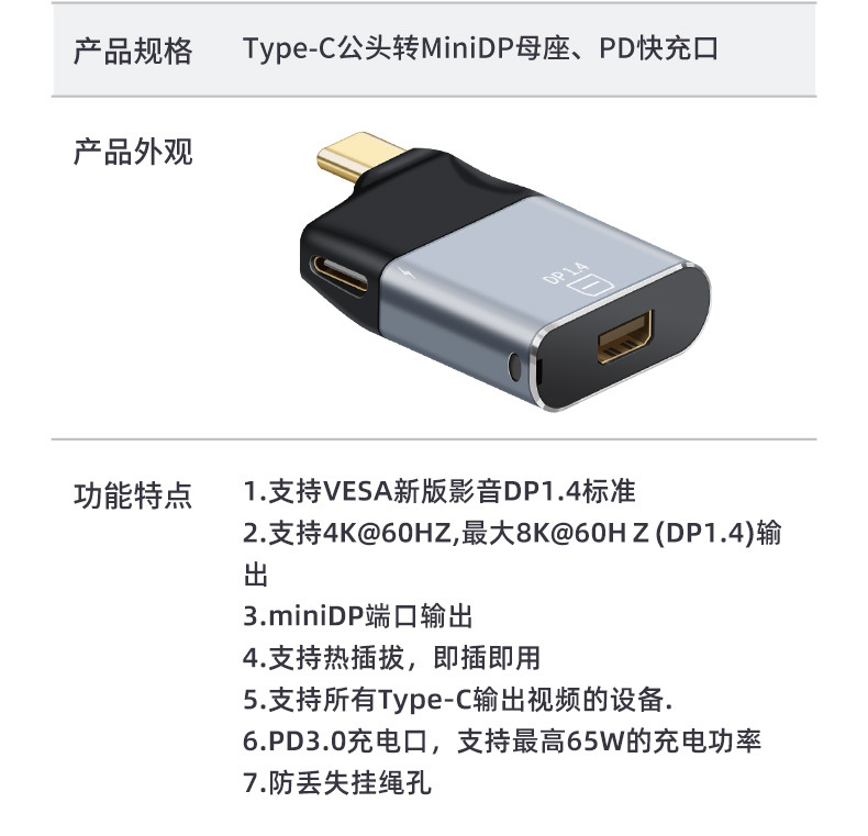 • 미니 DP 여성 to Type-c 남성 + PD 고속 충전 포트 변환기