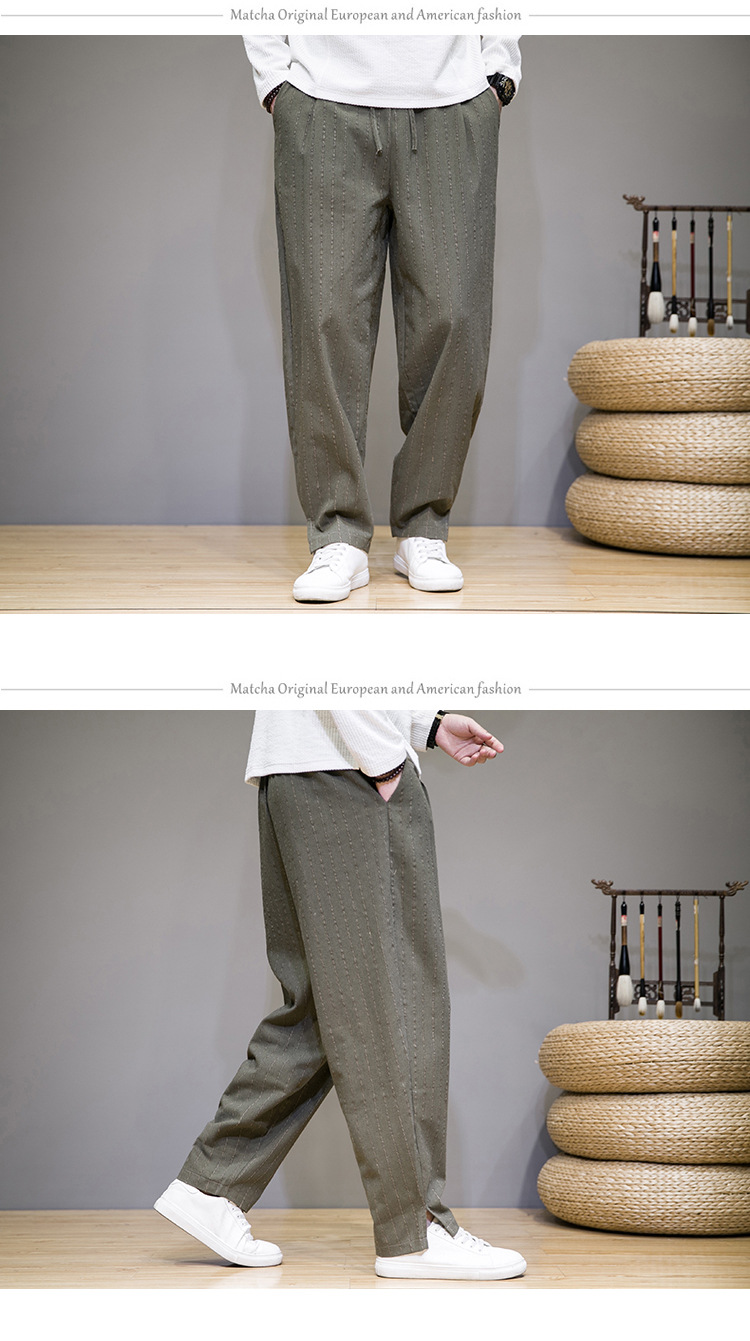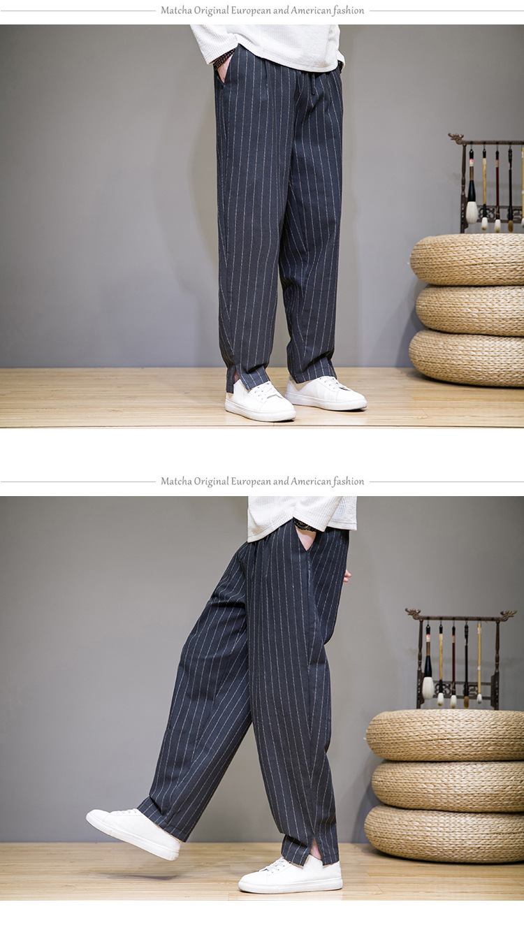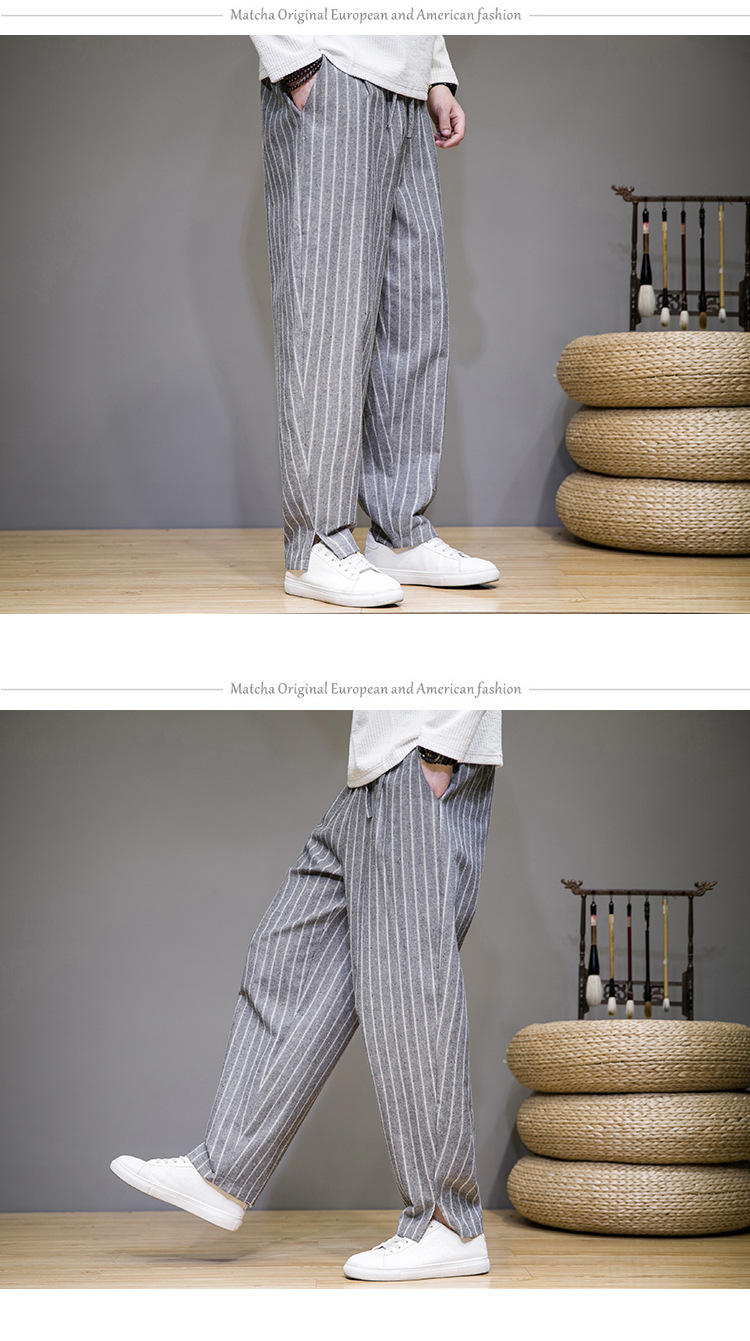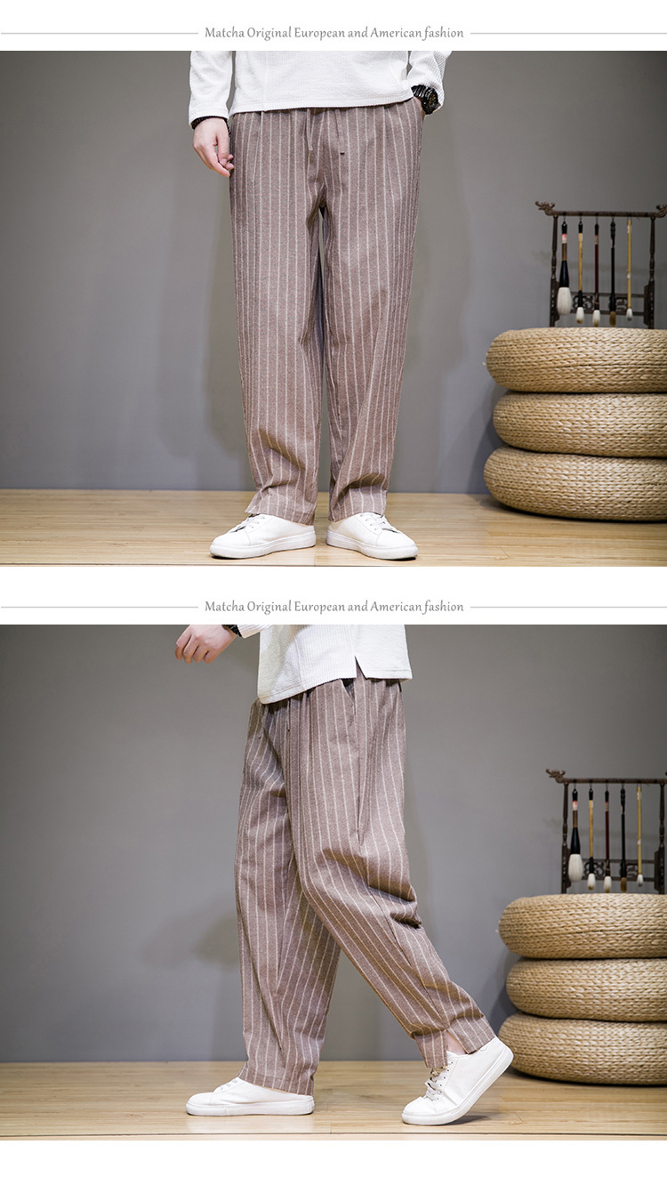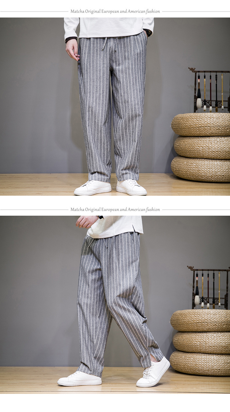 대외 무역 남자의 가을 면 린넨 스트라이프 느슨한 캐주얼 남성 바지 2022 청소년 바지 다리 플러스 사이즈 스트레이트 바지