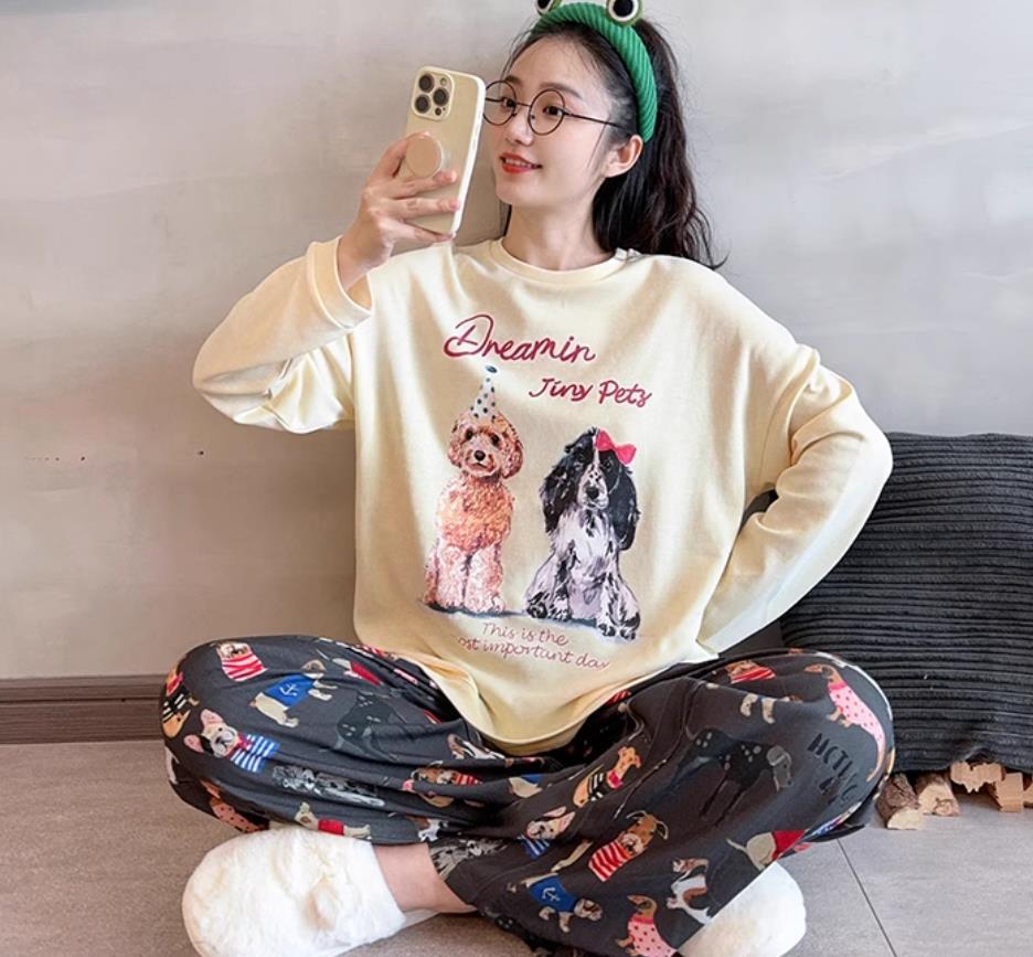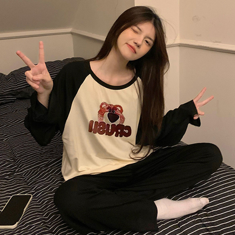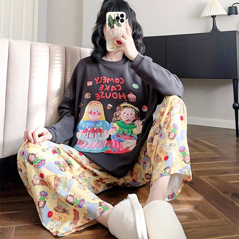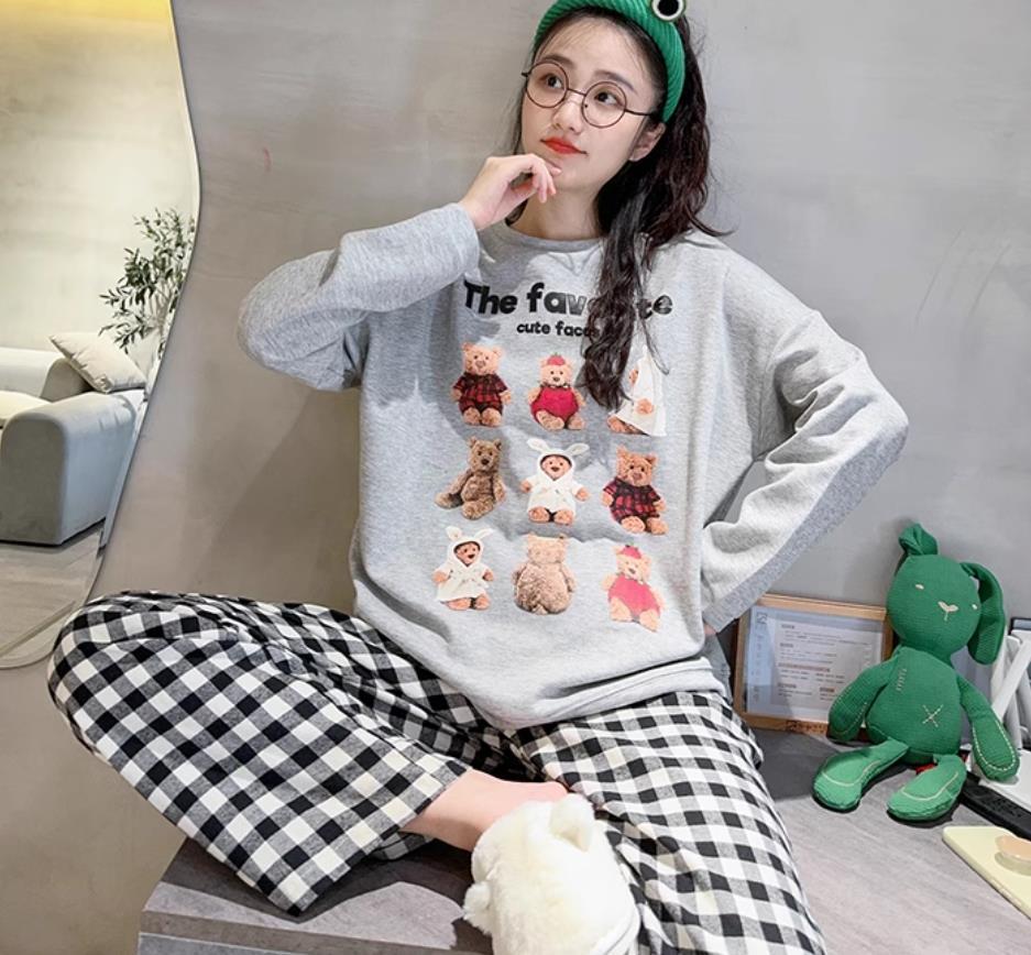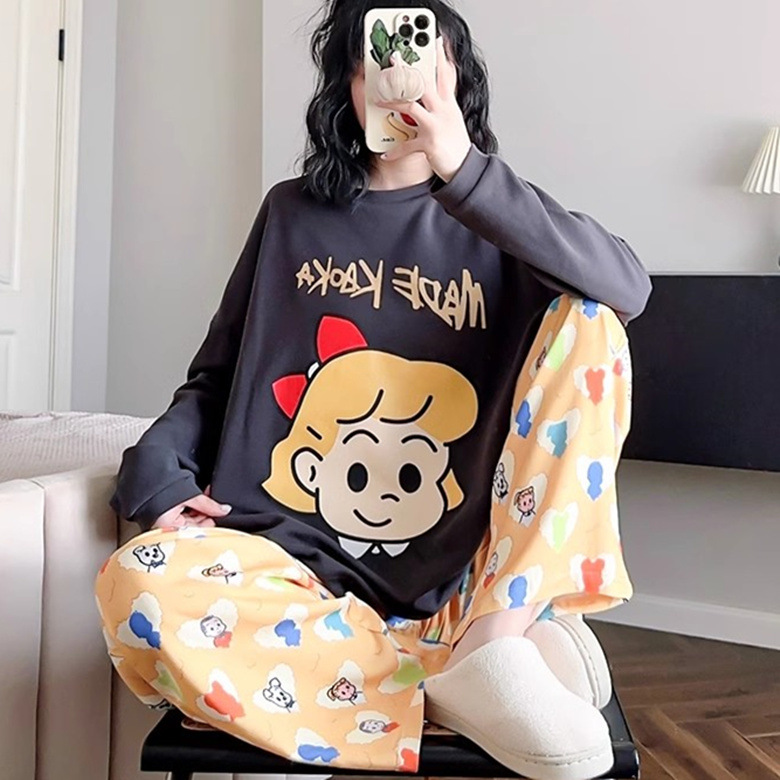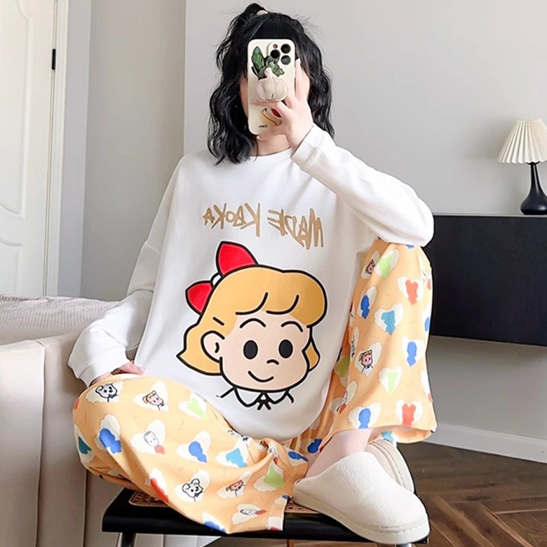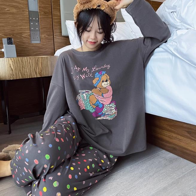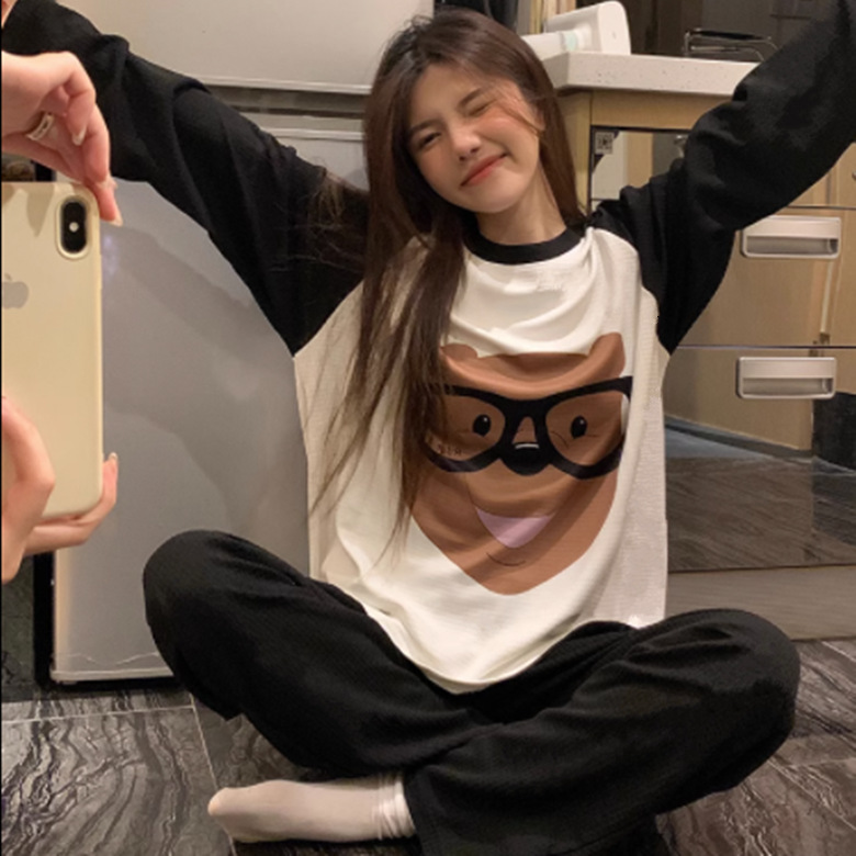 느슨한 만화 긴 소매 잠옷의 새로운 가을 한국어 버전 여성 한국 달콤한 소녀 홈 의류 세트 대외 무역 도매스토어 가기