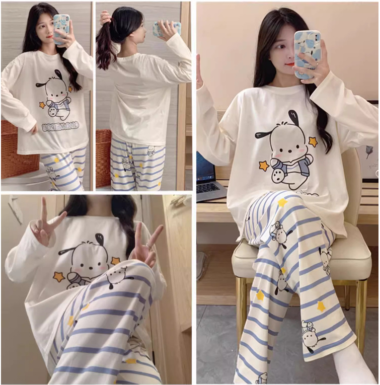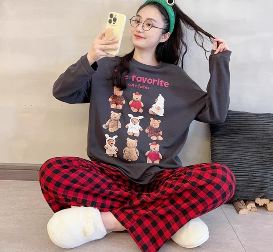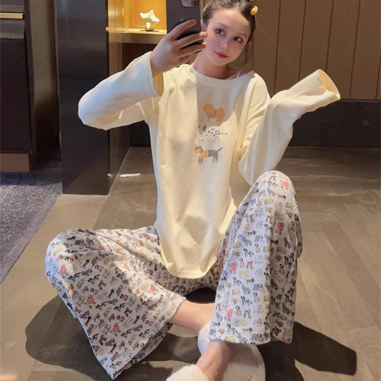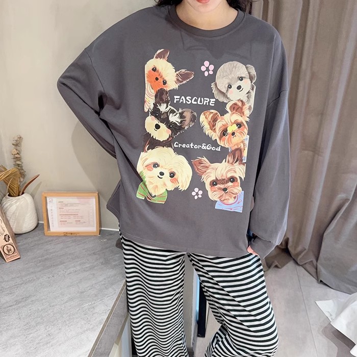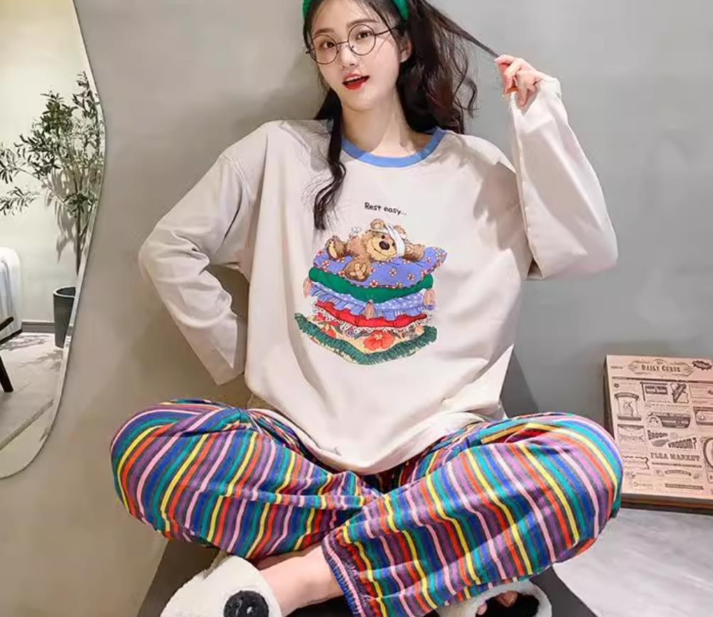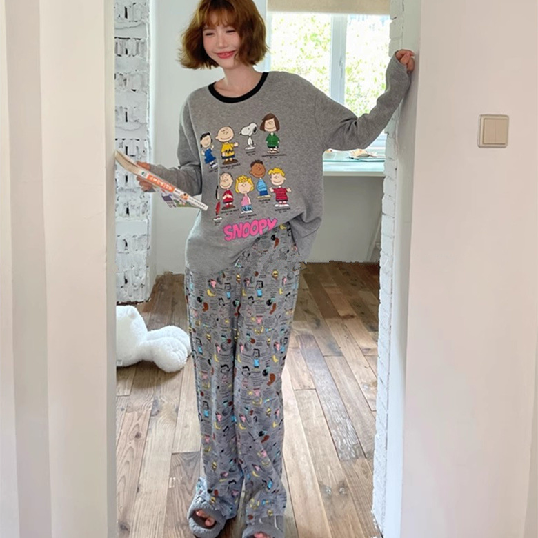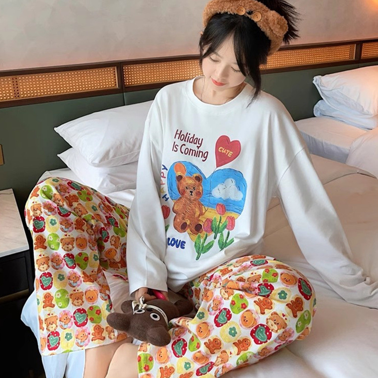 느슨한 만화 긴 소매 잠옷의 새로운 가을 한국어 버전 여성 한국 달콤한 소녀 홈 의류 세트 대외 무역 도매스토어 가기