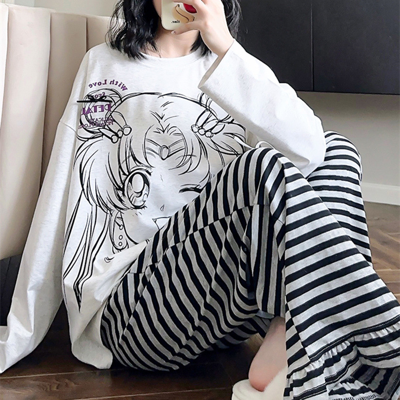 느슨한 만화 긴 소매 잠옷의 새로운 가을 한국어 버전 여성 한국 달콤한 소녀 홈 의류 세트 대외 무역 도매