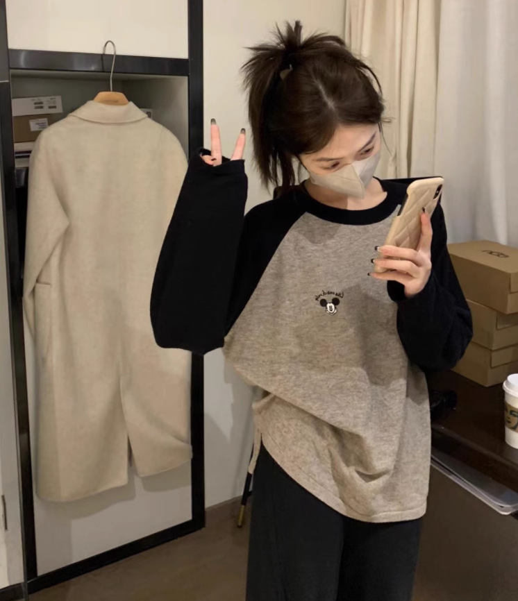 奶黄插米卡通灰直裤双长