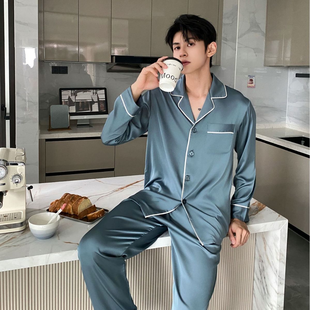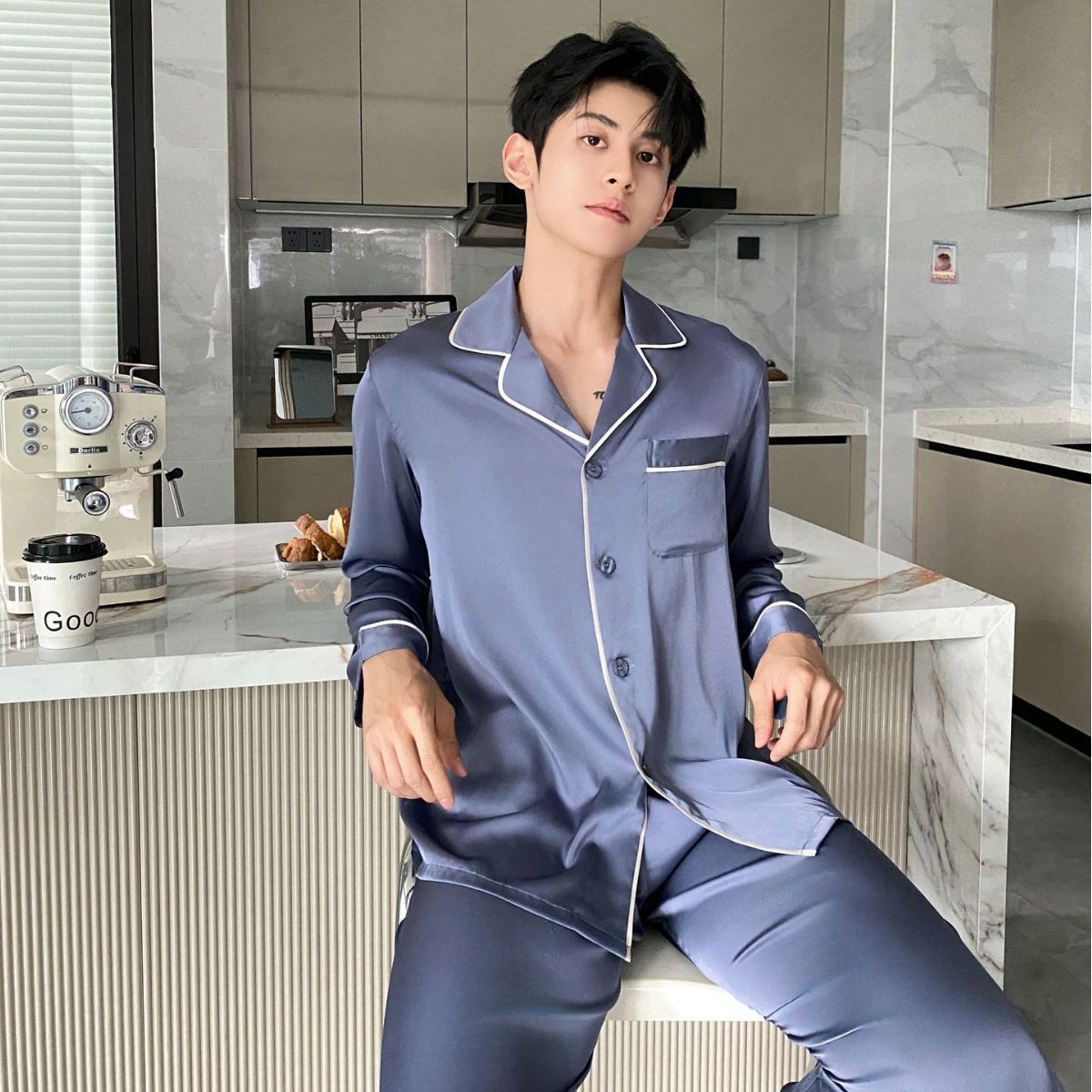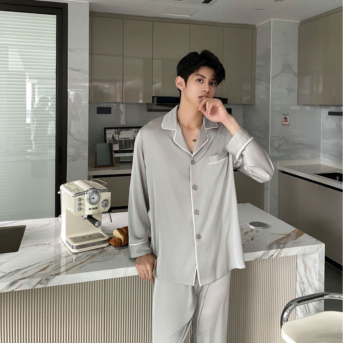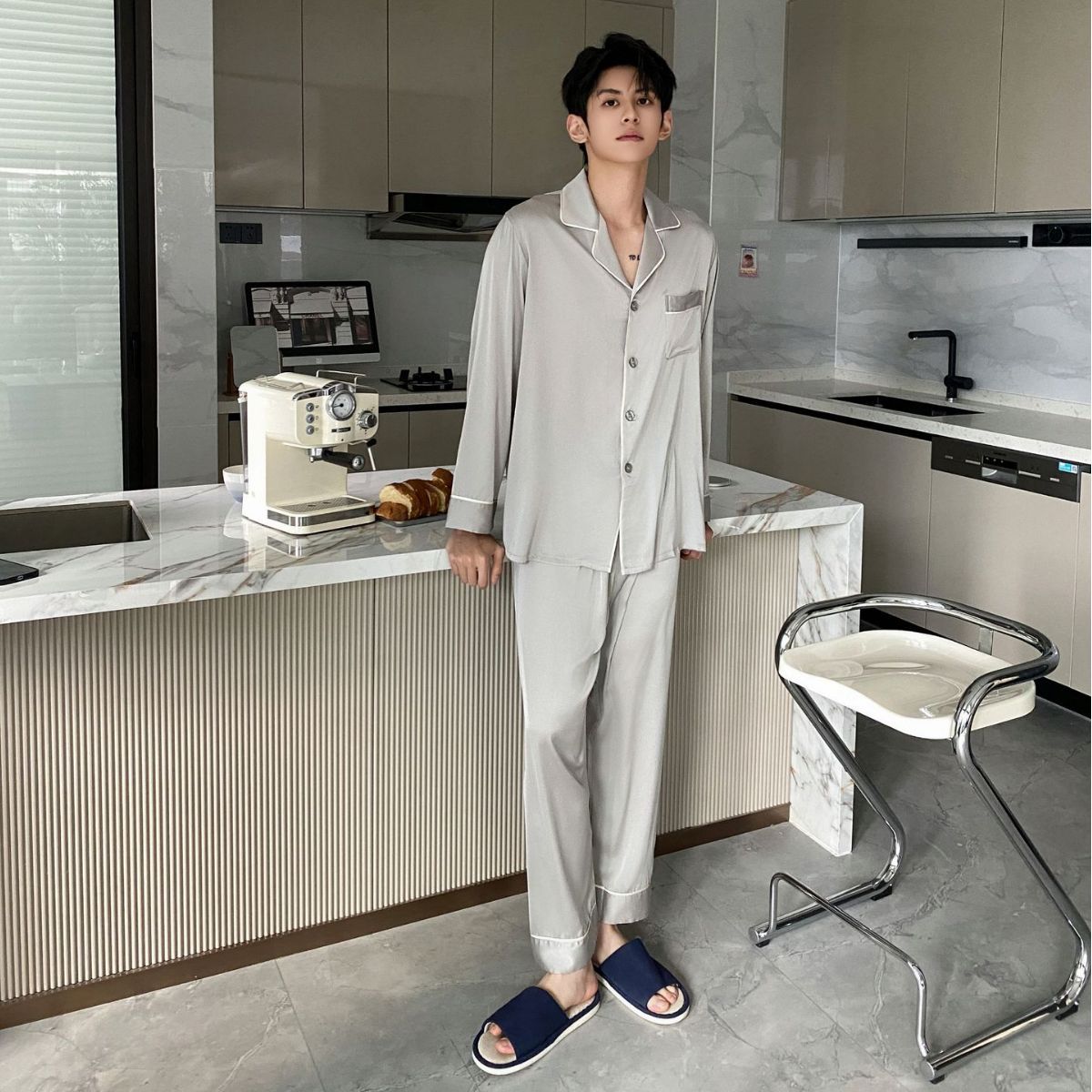 봄과 가을 새로운 남성 잠옷 긴팔 한국식 고급 아이스 실크 얇은 심플 실크 가정복 세트스토어 가기