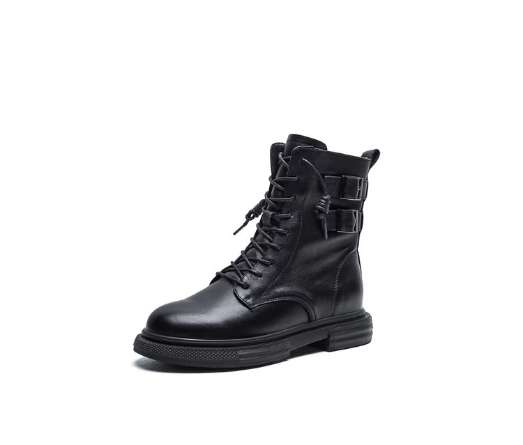 여성용 천연 가죽 플랫 마틴 부츠 2025년 가을 신상 다용도 부드러운 밑창 블랙 숏부츠 중간 길이 더블 버튼 부츠스토어 가기