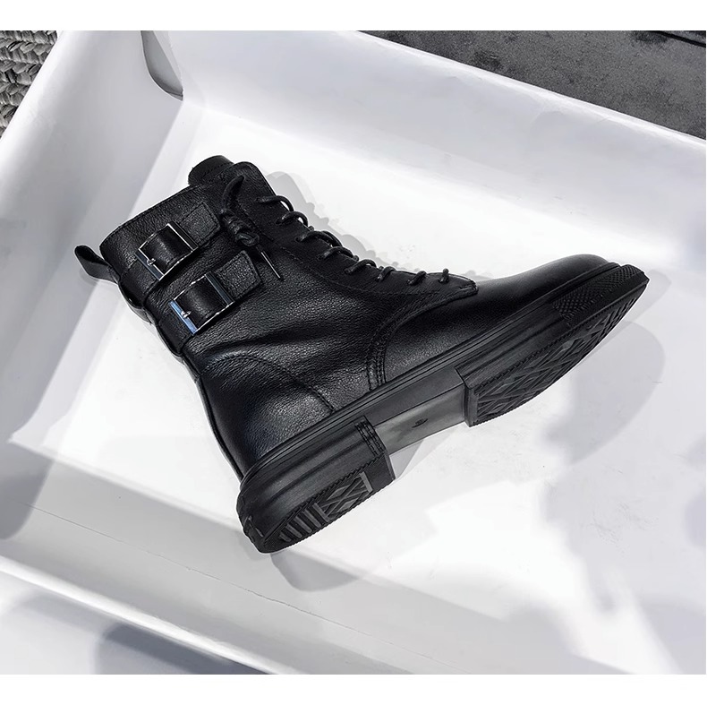 여성용 천연 가죽 플랫 마틴 부츠 2025년 가을 신상 다용도 부드러운 밑창 블랙 숏부츠 중간 길이 더블 버튼 부츠