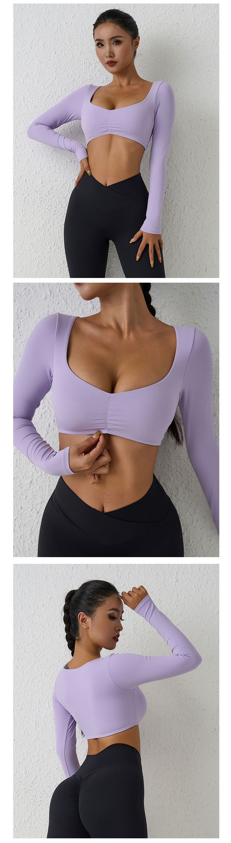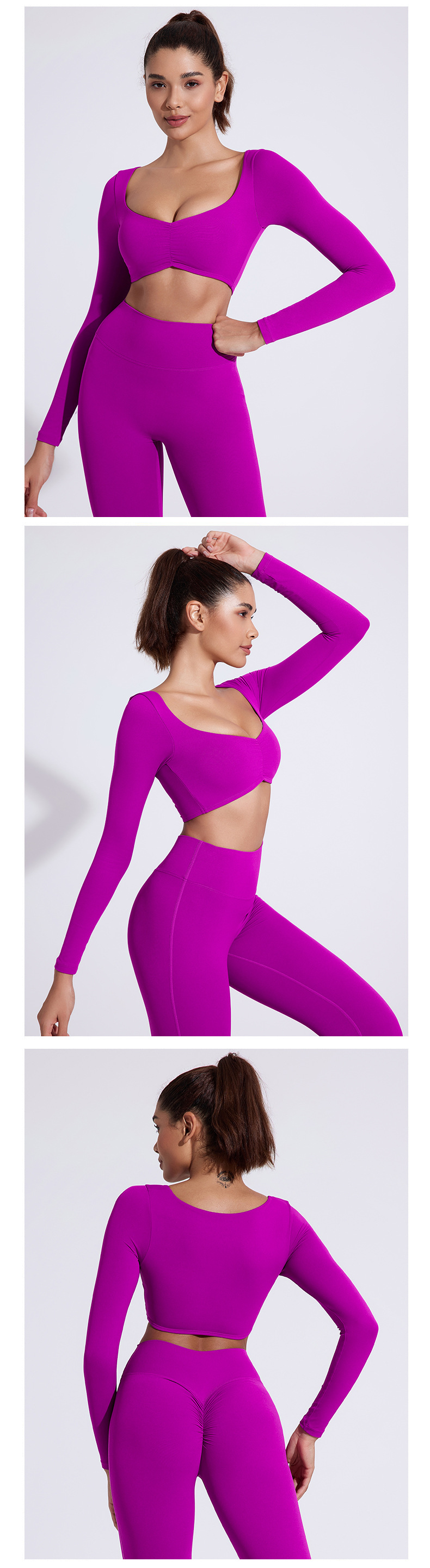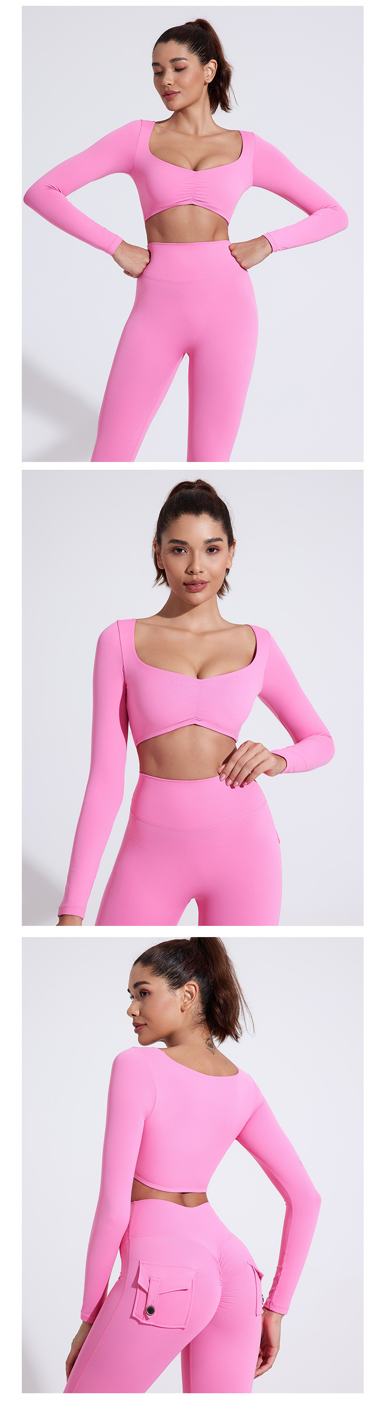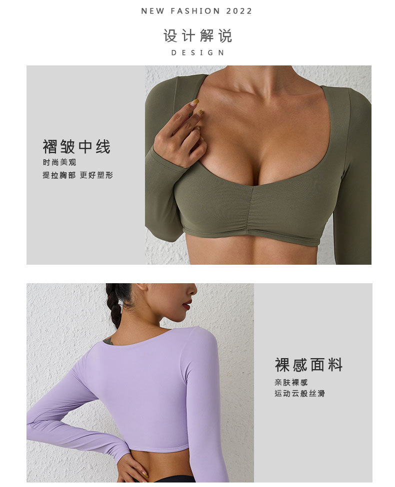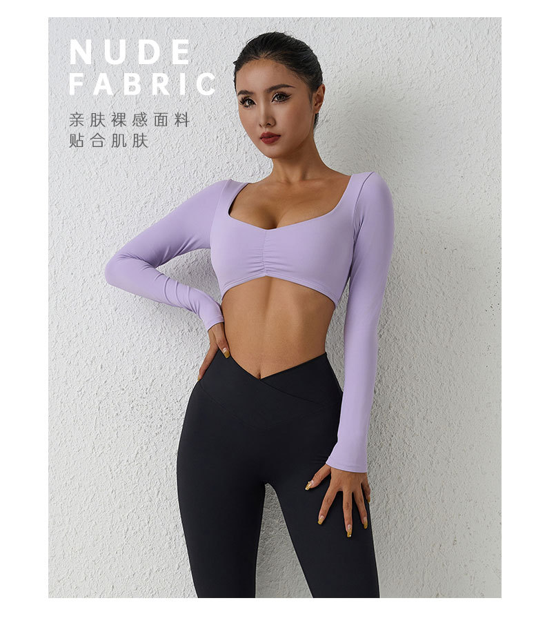 유럽과 미국의 국경 간 알몸 긴팔 요가 세트 티셔츠 꽉 주름 스포츠 피트니스 탑 여성용 타이트 요가 탑