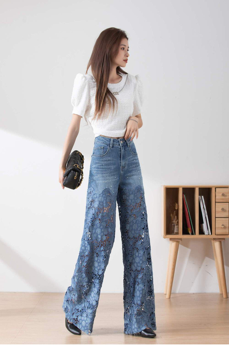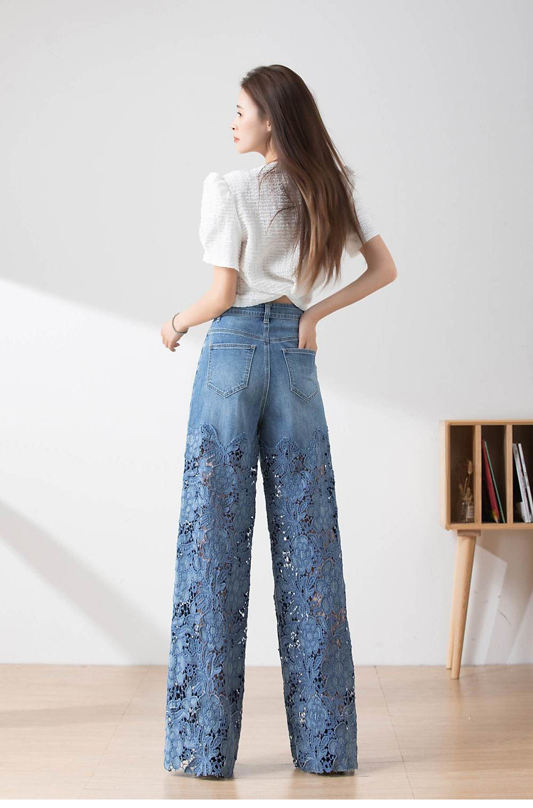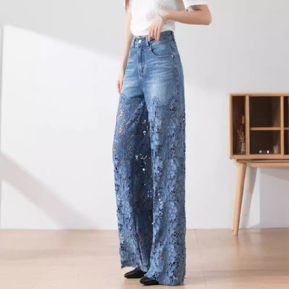 7960 높은 허리 넓은 다리 바지 여성용 봄과 여름 패션 우아한 올 매치 할로우 레이스 바느질 데님 바지