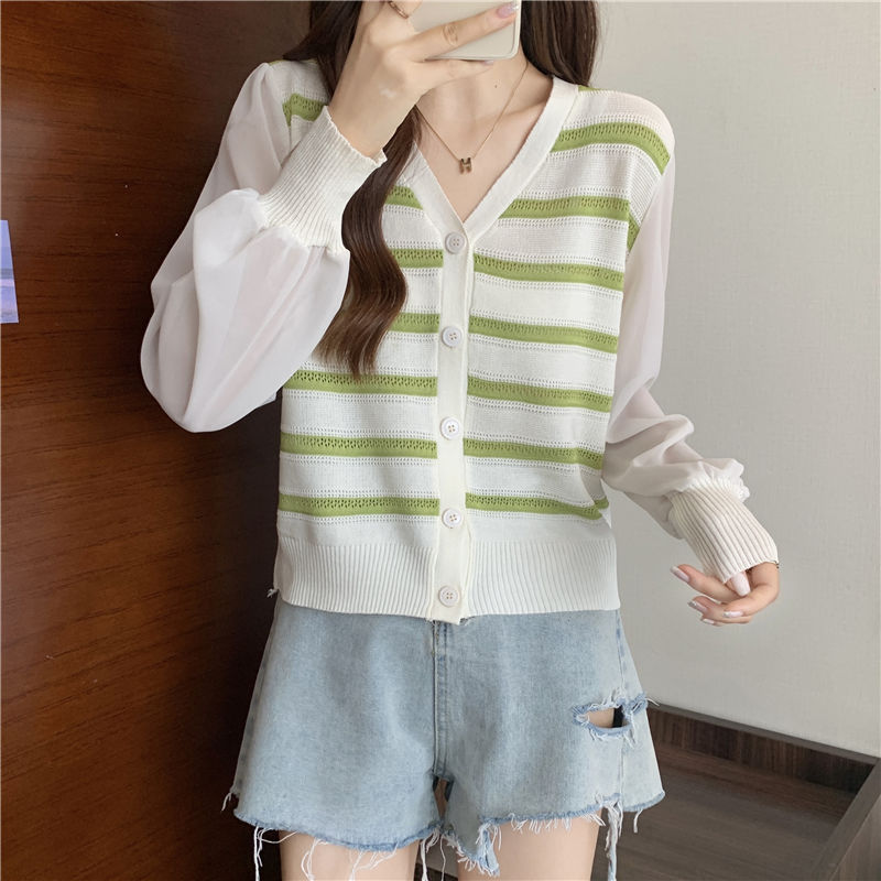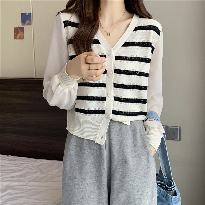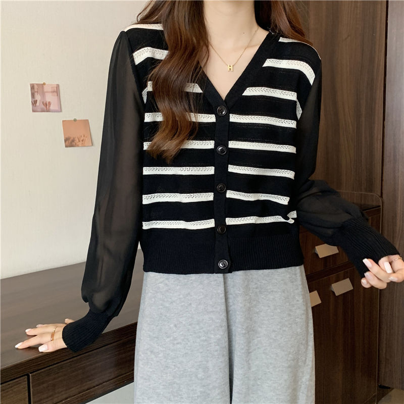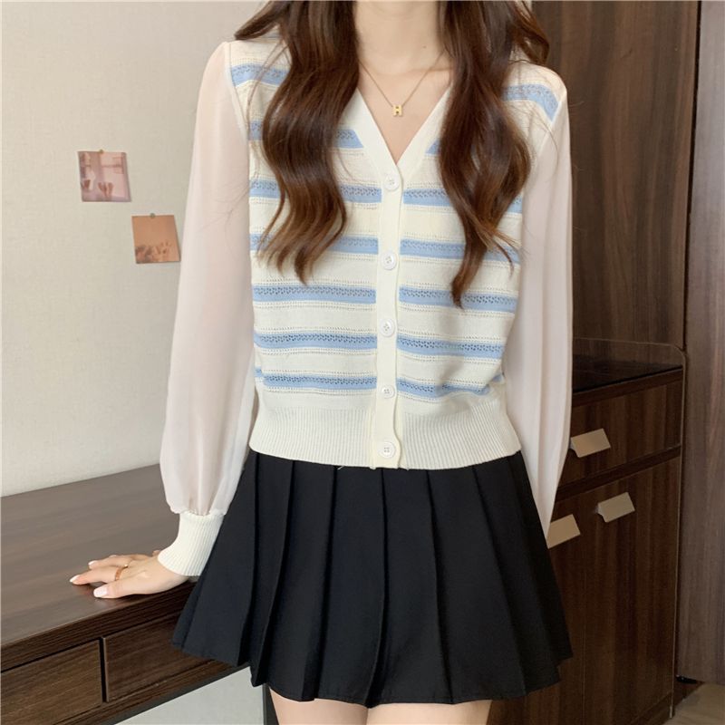 니트 스웨터 가을 얇은 스티치 쉬폰 긴 소매 스트라이프 V-넥 달콤한 탑 디자인 감각 겉옷 패션 기질