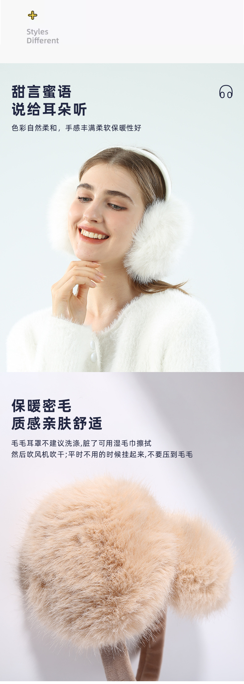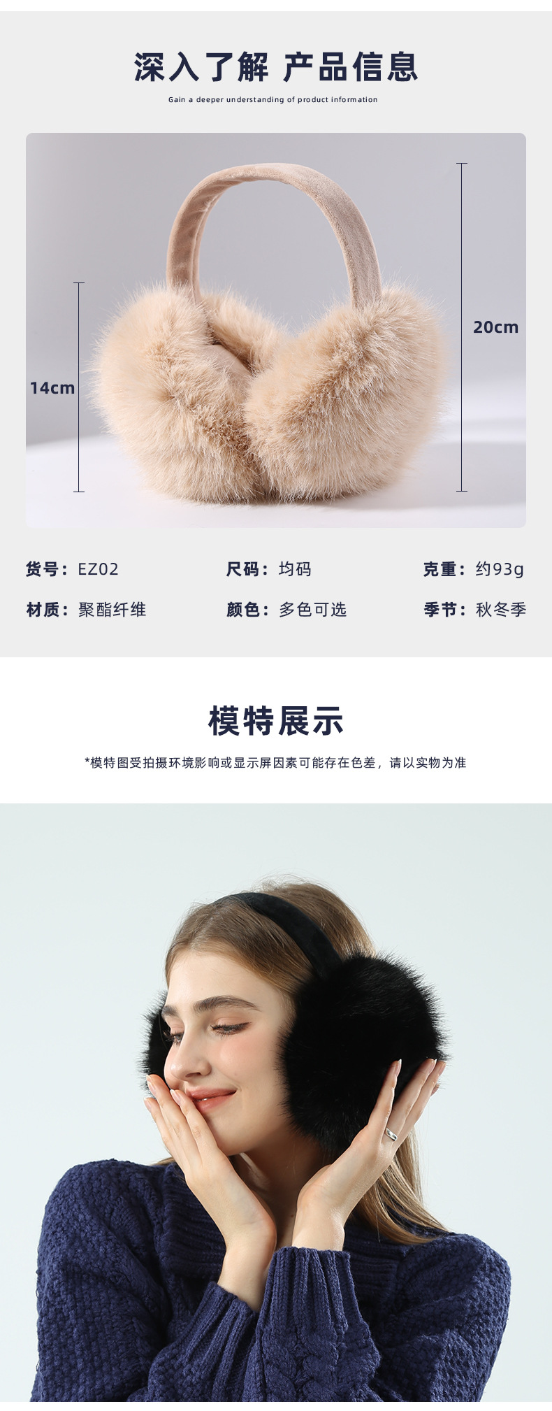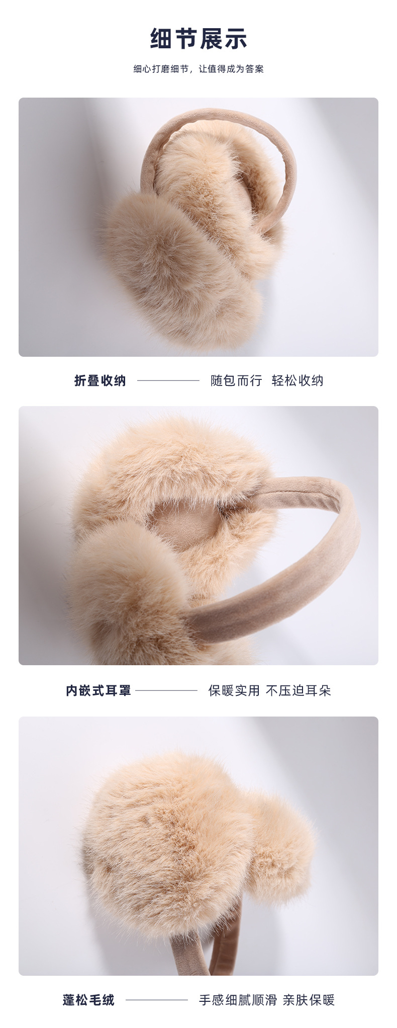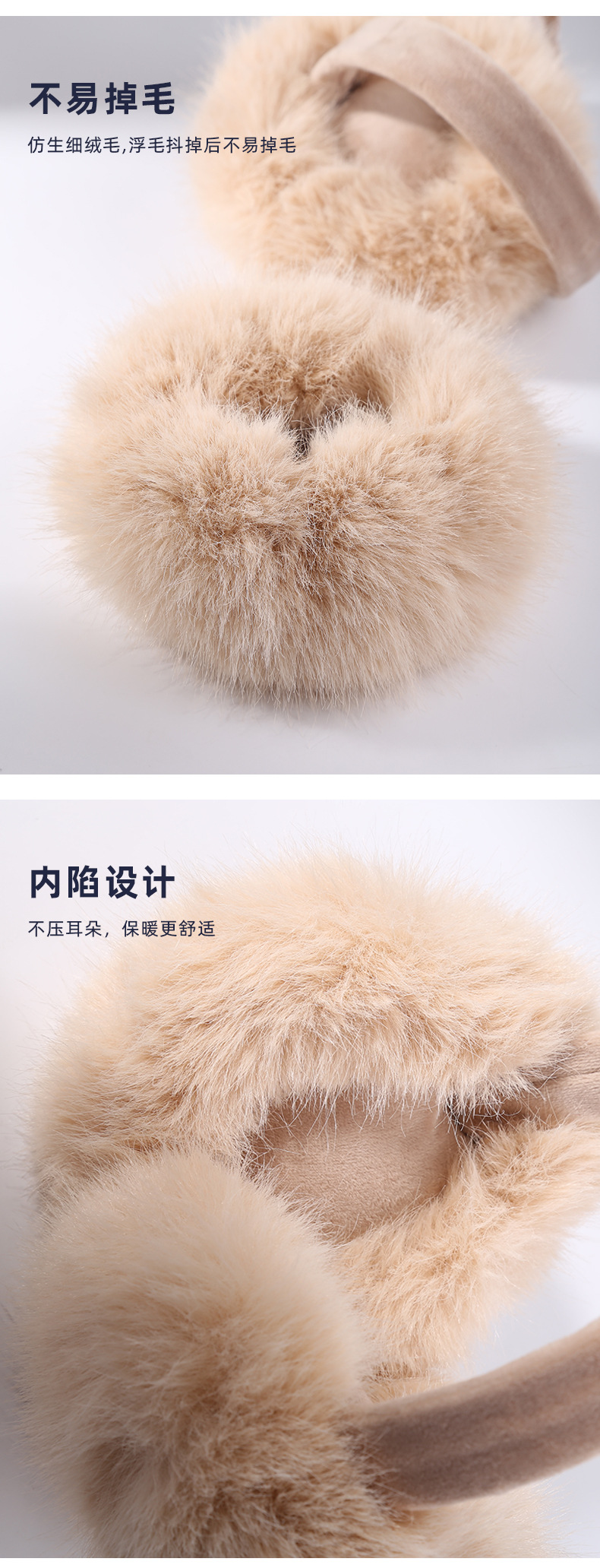 EZ01为仿兔毛材质,细绒杆可折叠收纳,优质骨架佩戴舒适不变形可拆卸耳套,独立包装(产品包装尺寸 长19cm 宽17.5cm 重量89g)